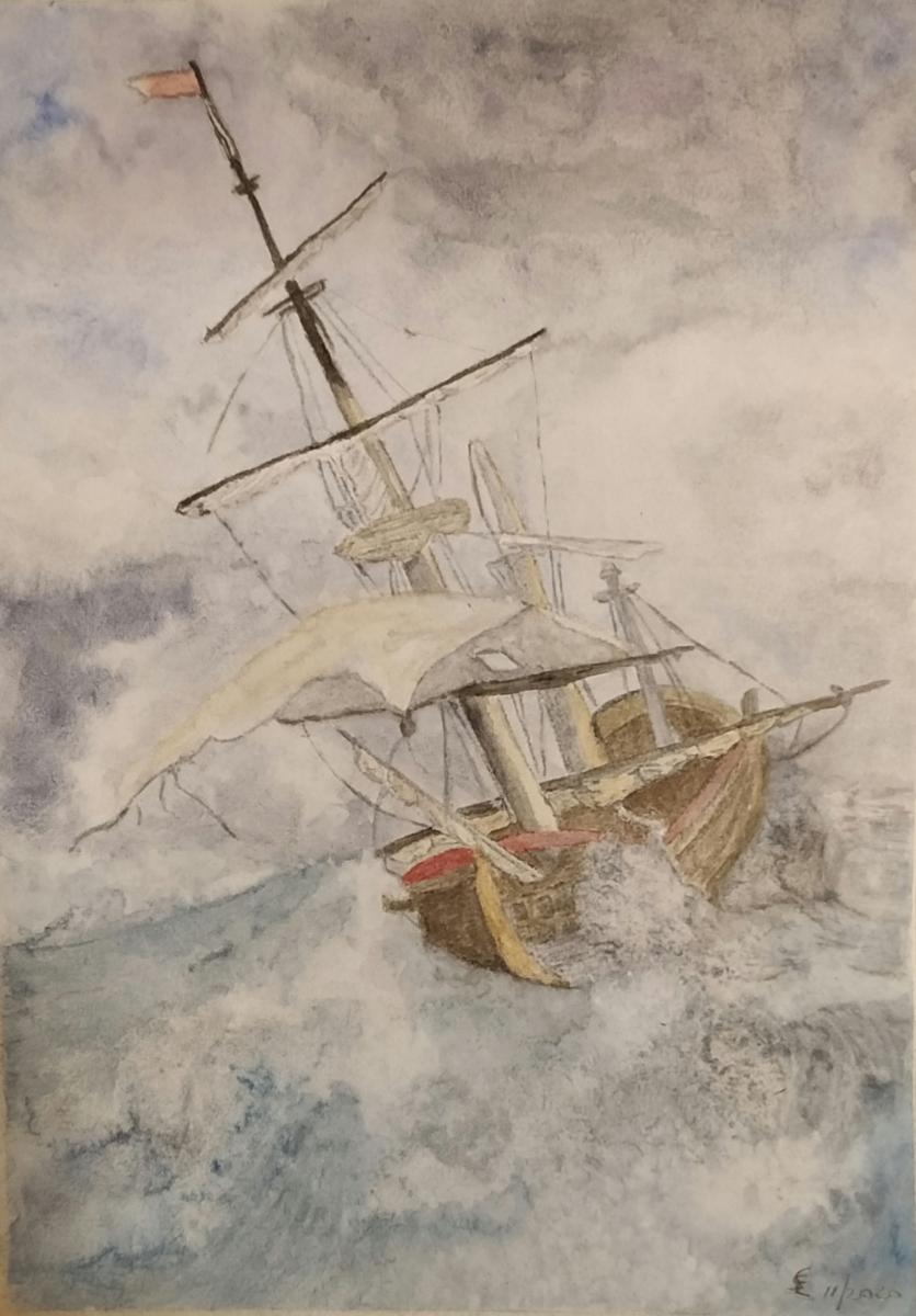 Opera ispirata ad uno stato d'animo, acquerello su carta, con tecnica del sale usata sulle onde per ricreare la schiuma del mare.