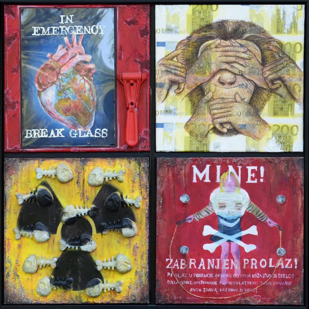 mista (materico, acrilico, applicazioni), tela su telaio in legno, 2018