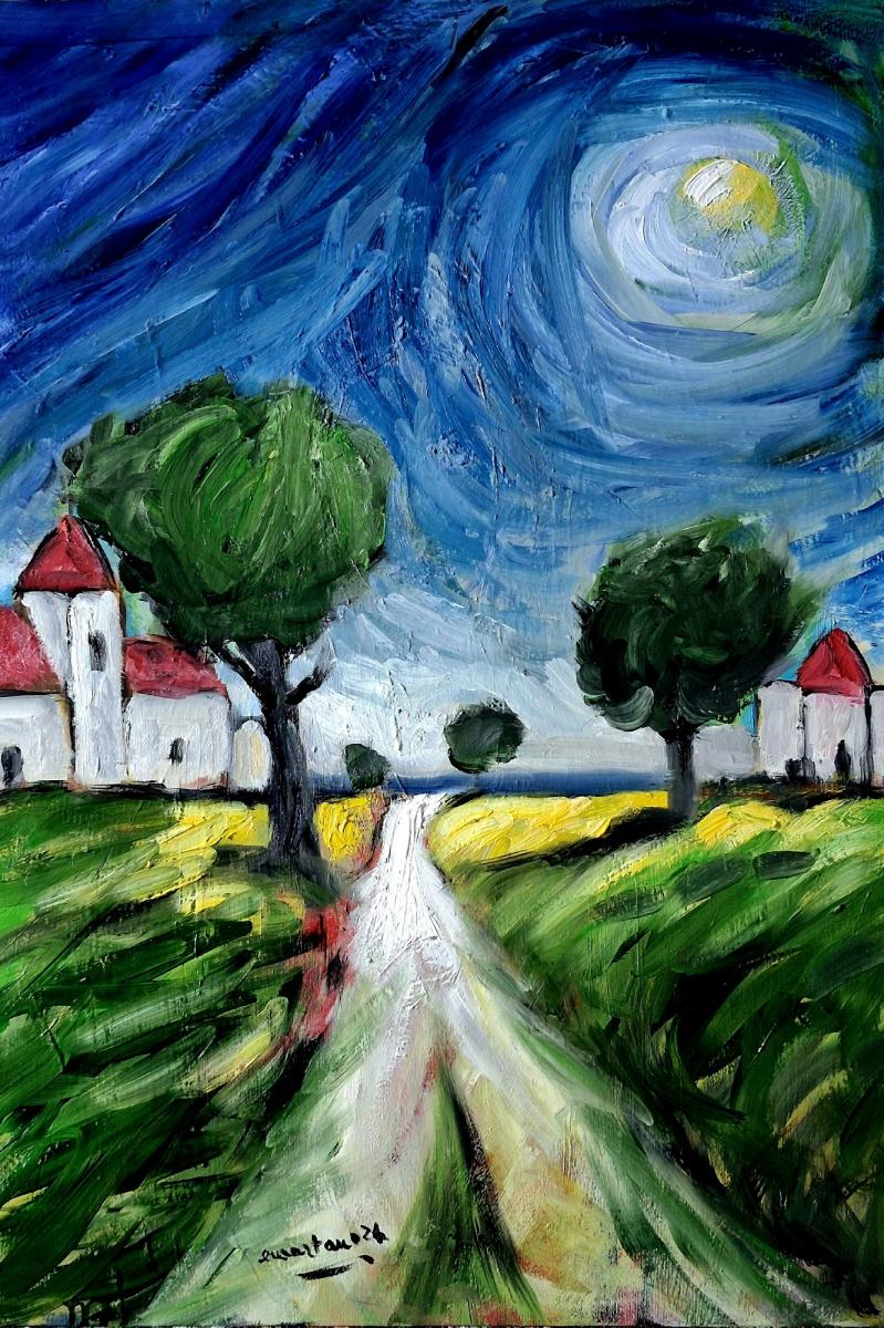 "In questo 70x50 ho cercato la vittoria della luce sulla materia. Nato dalla trasformazione di un'idea precedente, il dipinto ha acquisito una corposità unica: strati su strati di olio creano rilievi che rendono il paesaggio quasi tattile. Il cielo vortica sopra un sentiero bianco che non è solo una strada, ma un’uscita verso l’infinito. È un’opera densa, dove il colore si fa roccia e vento.