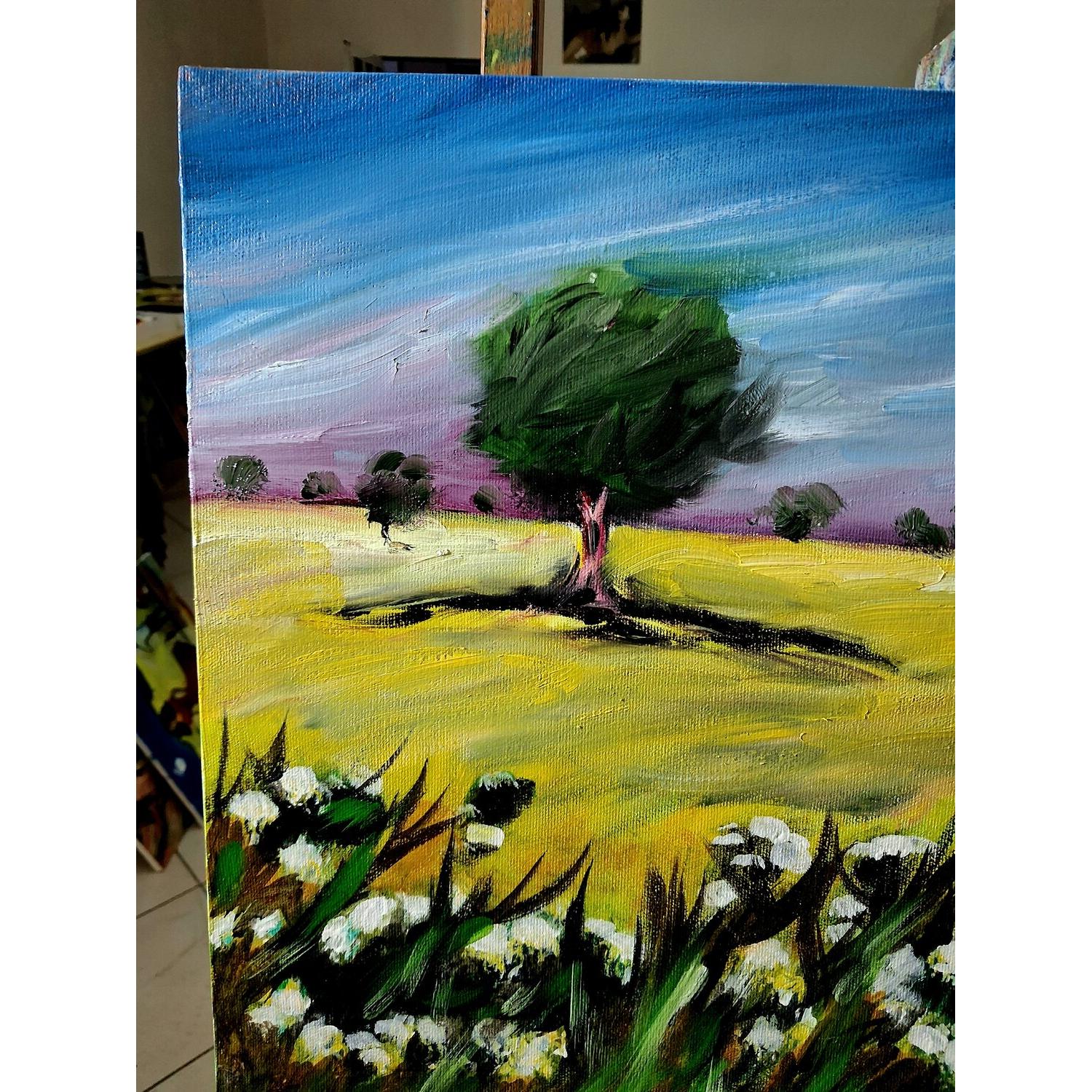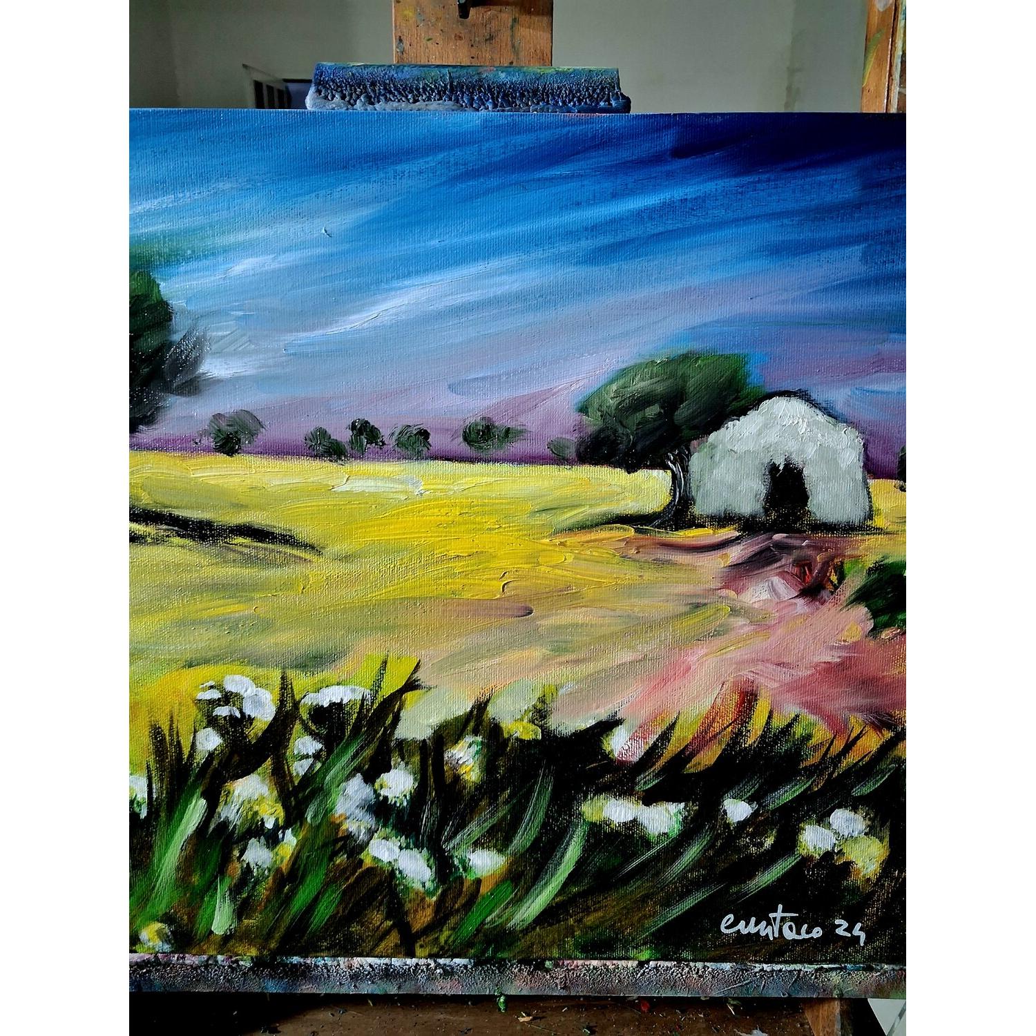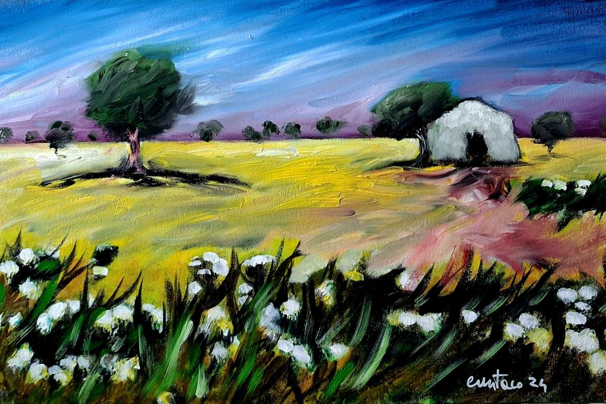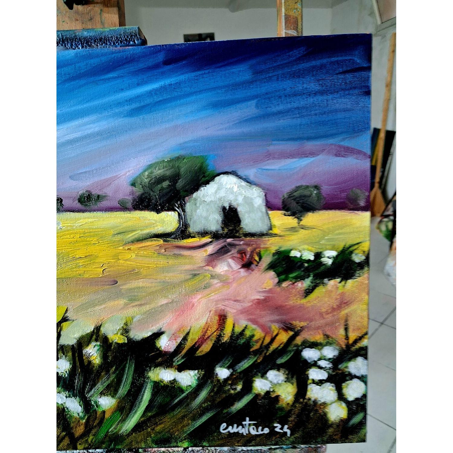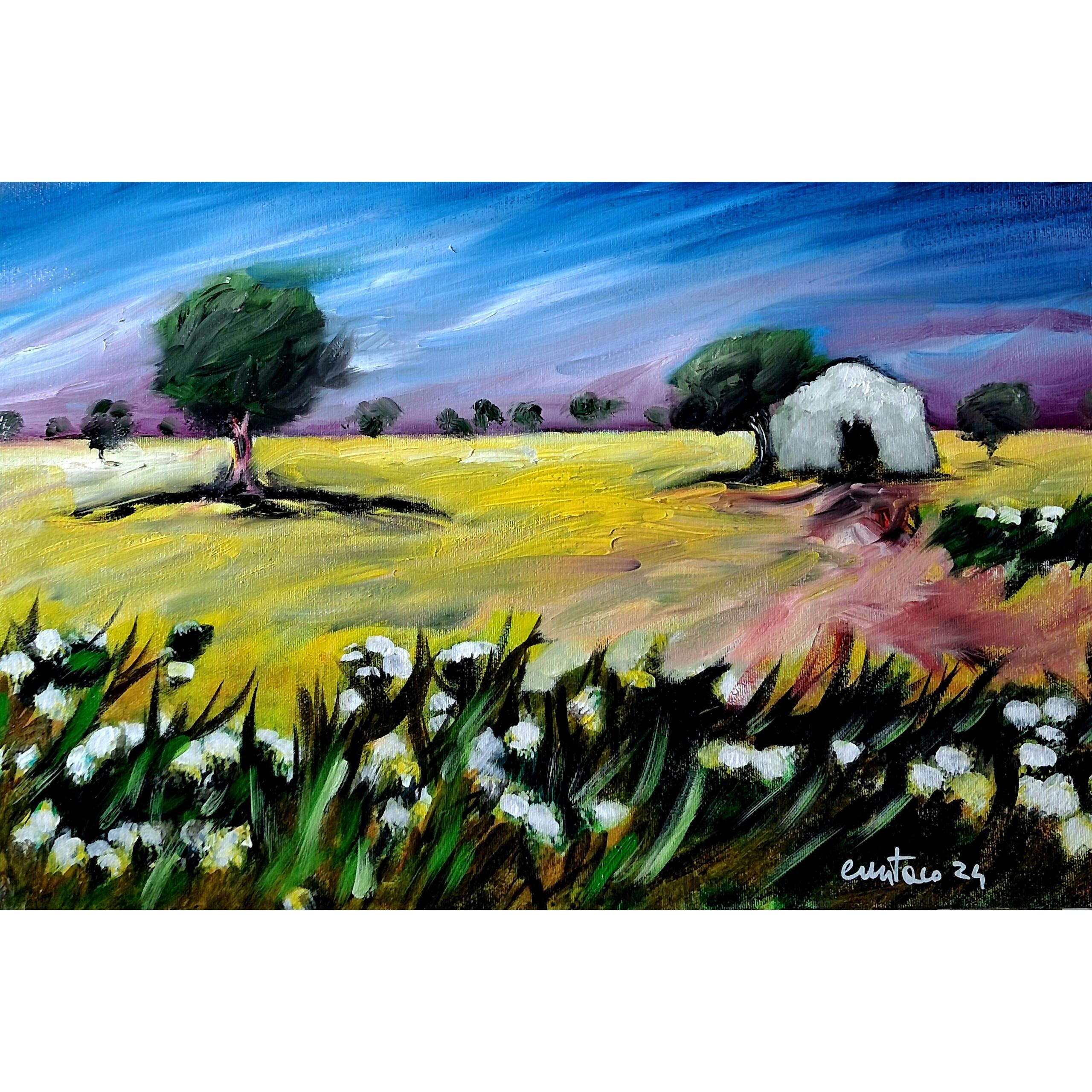 In questo dipinto a olio su tela ho cercato di interpretare l’atmosfera intensa e silenziosa della campagna. Attraverso uno stile espressionista, le pennellate decise e i colori vibranti delineano un paesaggio con una piccola casa immersa tra alberi e natura. L’opera trasmette una sensazione di calma e di equilibrio, invitando l’osservatore a immergersi nella quiete del paesaggio e nella sua energia calda e accogliente.