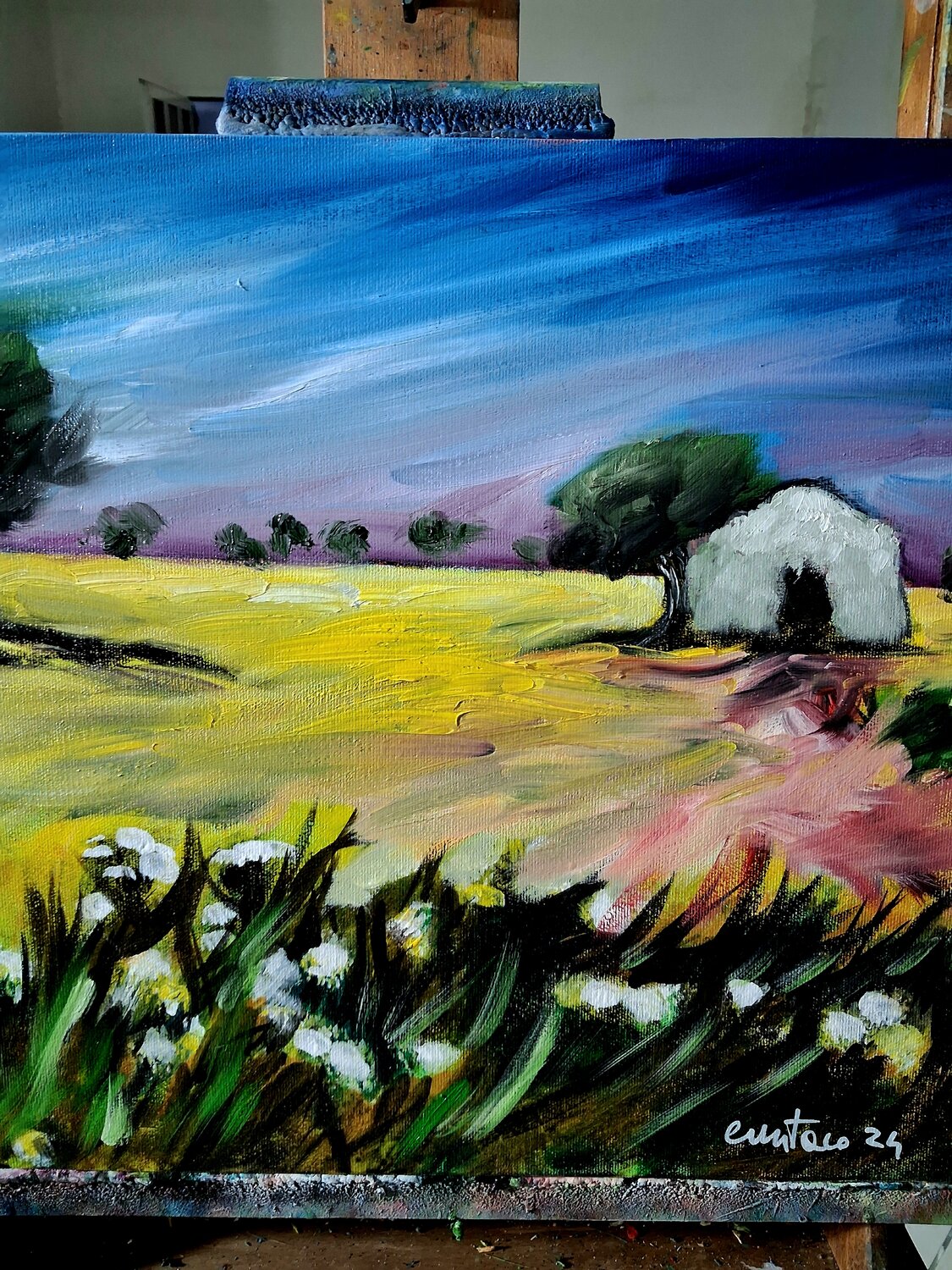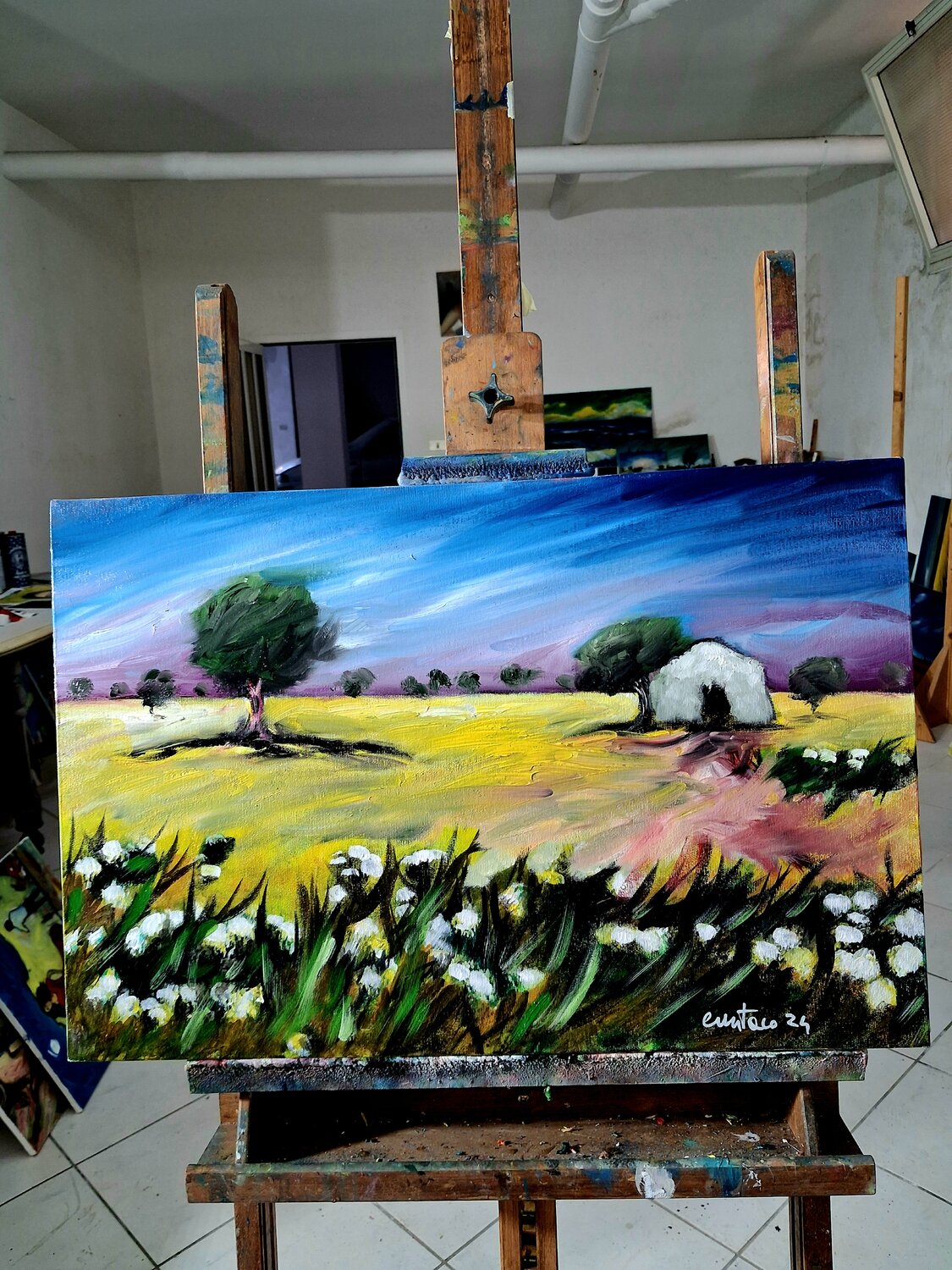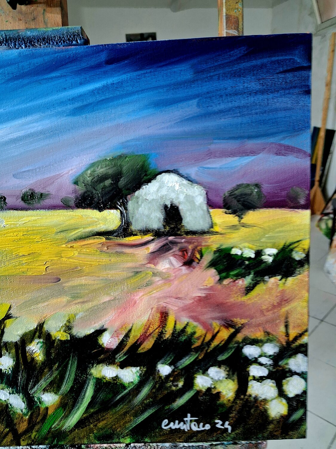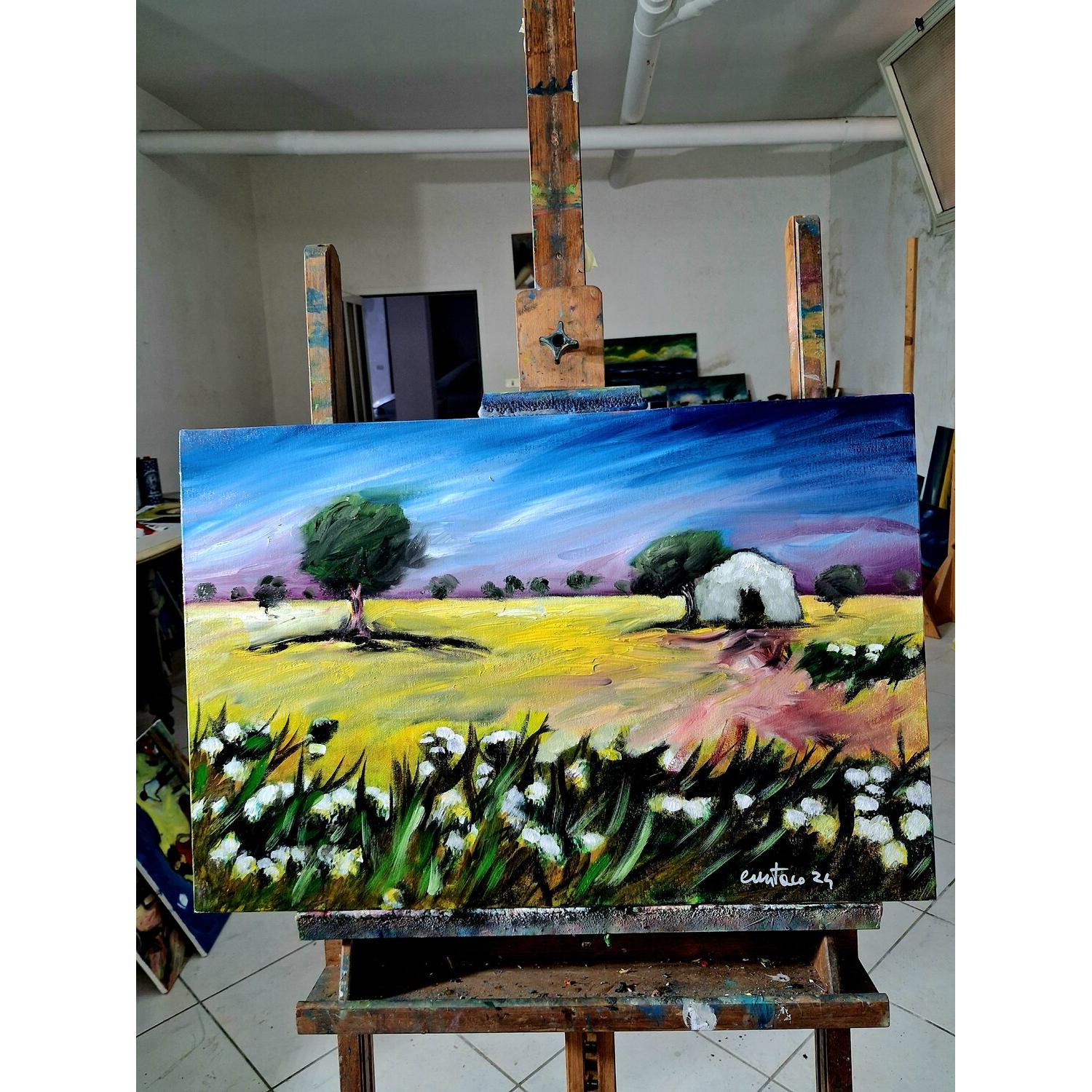 In questo dipinto a olio su tela ho cercato di interpretare l’atmosfera intensa e silenziosa della campagna. Attraverso uno stile espressionista, le pennellate decise e i colori vibranti delineano un paesaggio con una piccola casa immersa tra alberi e natura. L’opera trasmette una sensazione di calma e di equilibrio, invitando l’osservatore a immergersi nella quiete del paesaggio e nella sua energia calda e accogliente.
