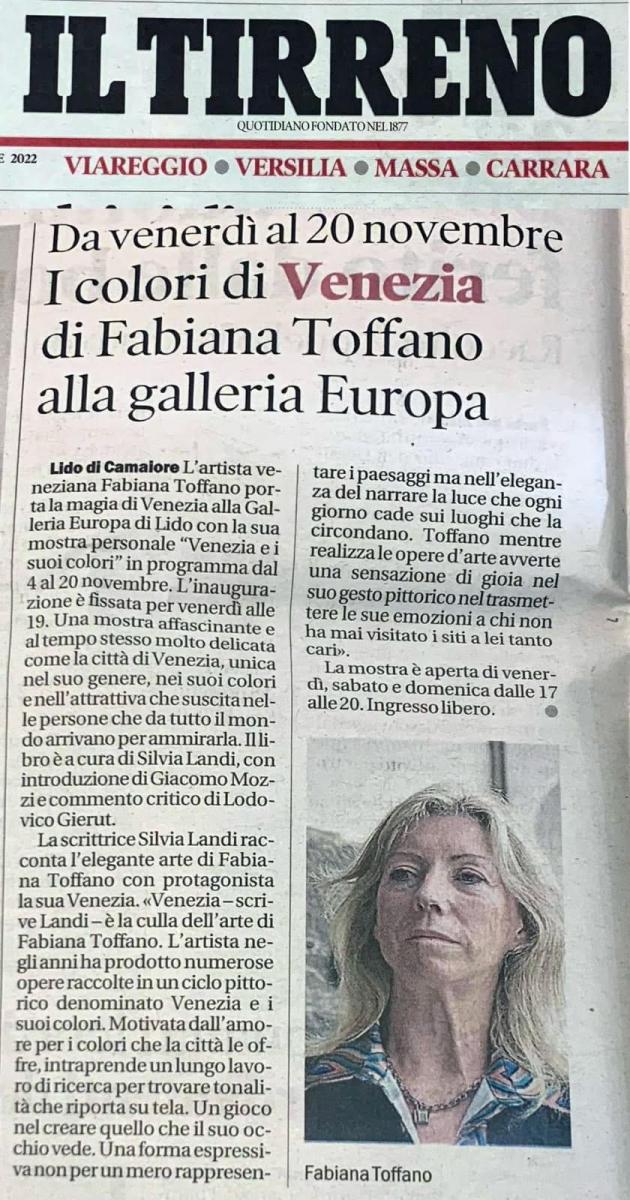 Il giornalista Giacomo Mozzi si sofferma nell’introduzione del libro sul particolare legame tra la nebbia e la luce presente nei quadri dell’artista: “ Fabiana Toffano nei suoi quadri cattura lo spettatore attraverso delle pennellate concentriche e delle sfumature che fanno sembrare il paesaggio rappresentato immerso nella nebbia. Non a caso Fabiana Toffano è veneziana e conosce bene l’ambiente lagunare dove spesso si alza questa nebbia nei canali e su piazza San Marco. Ecco che i suoi quadri prendono forma e diventano una rappresentazione stilizzata, ma efficace di quello che realmente sta accadendo davanti a sé.”