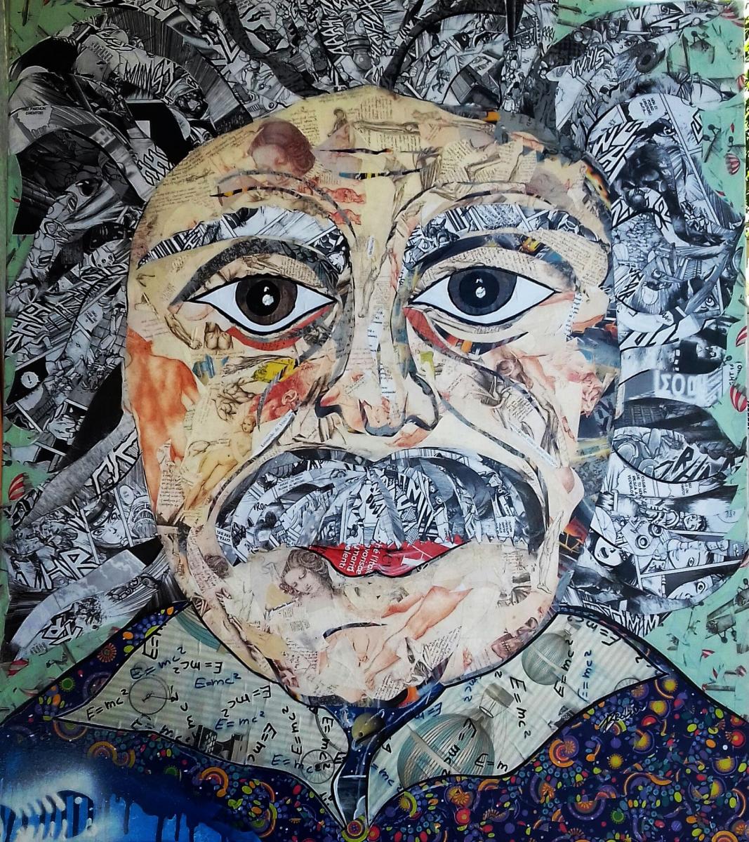 Albert Einstein, uno dei più geniali scienziati di ogni tempo, è l'ideatore della teoria della relatività. Questa e' la mia personale interpretazione al collage, usando le stampe con riportati i disegni di Leonardo da Vinci che ho usato per la composizione del volto,mentre per i capelli e i baffi ho usato i disegni del famoso