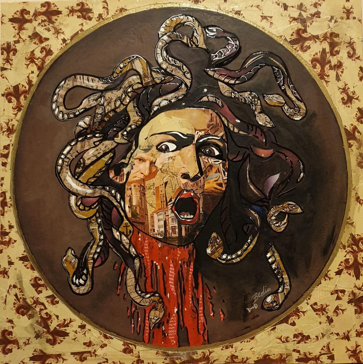 Interpretazione attuale in chiave "PoP"di un grande genio dell'arte italiana Michelangelo Merisi , la Medusa ...Bedin sceglie di affrontare questo argomento ,in veste molto diversa e cioe' con il paper/cutting ,ovvero il taglio delle sue carte preferite,insomma un vero e proprio collage.