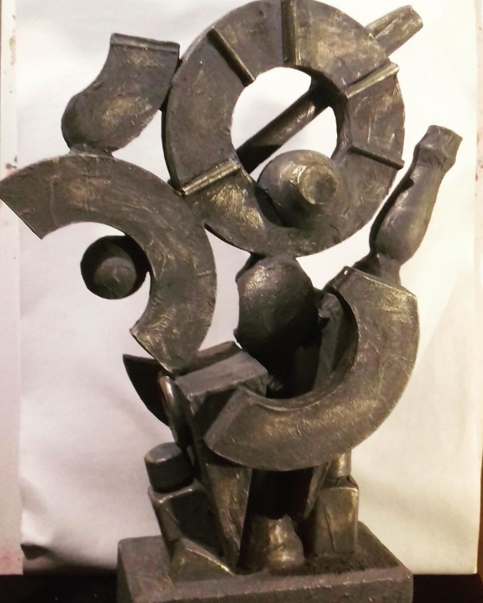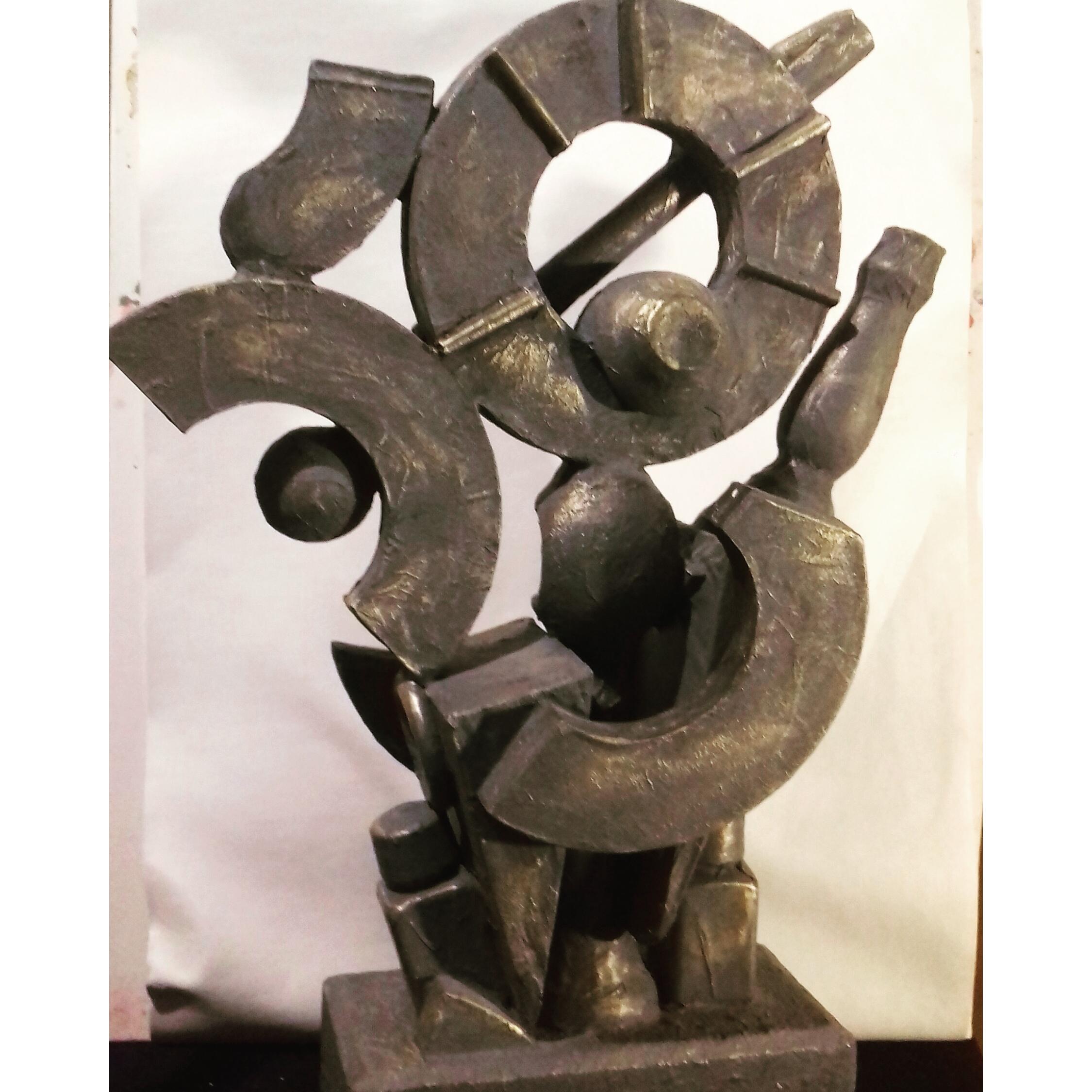 L'opera e stata realizzata ,con materiali lignei e plastici ,assemblati tra loro.Il rivestimento della scultura e' di cellulosa,mentre l'effetto metallico/bronzeo e dato dalla stesura e successivamente l'asporto dei colori acrilici,lasciando l'effetto metallico.