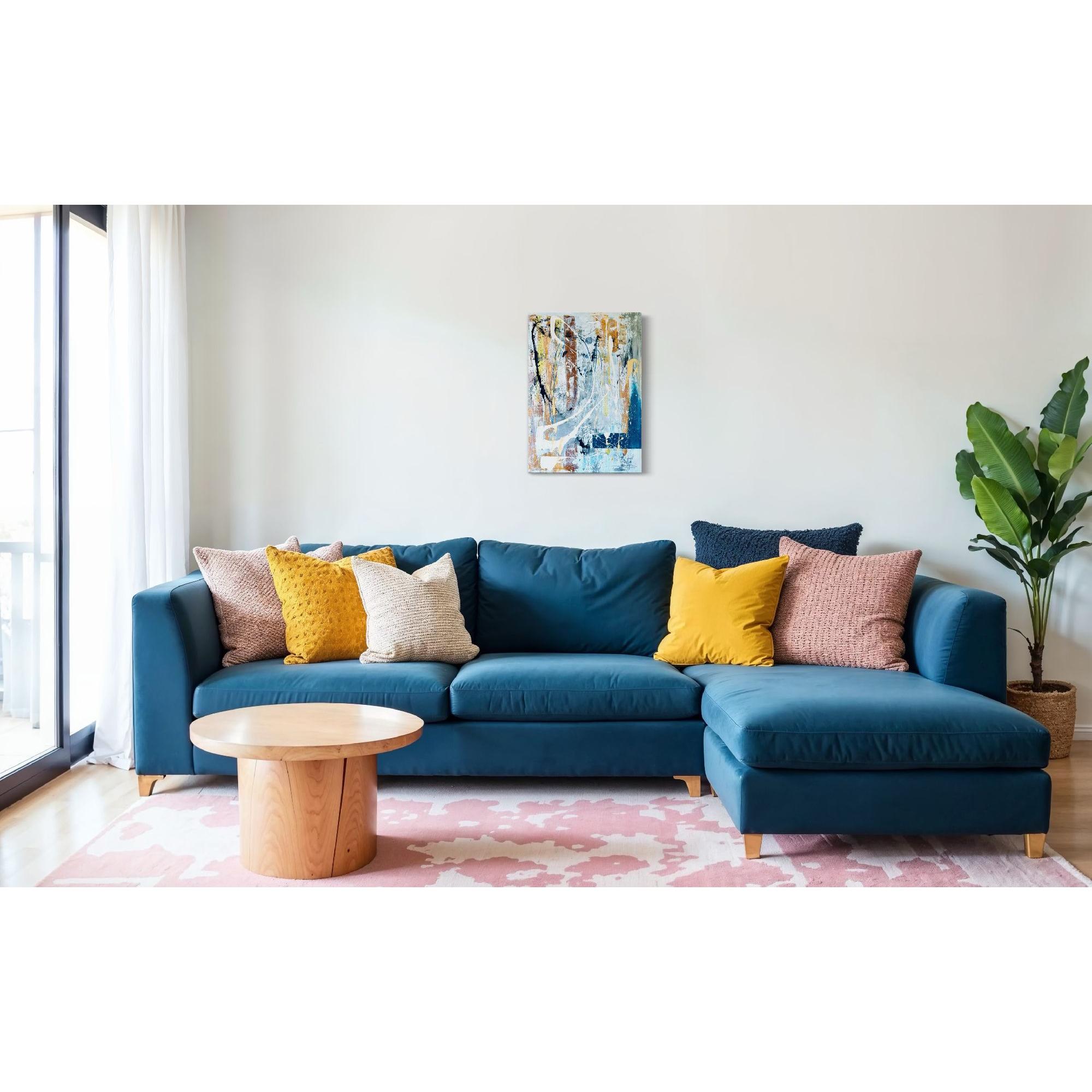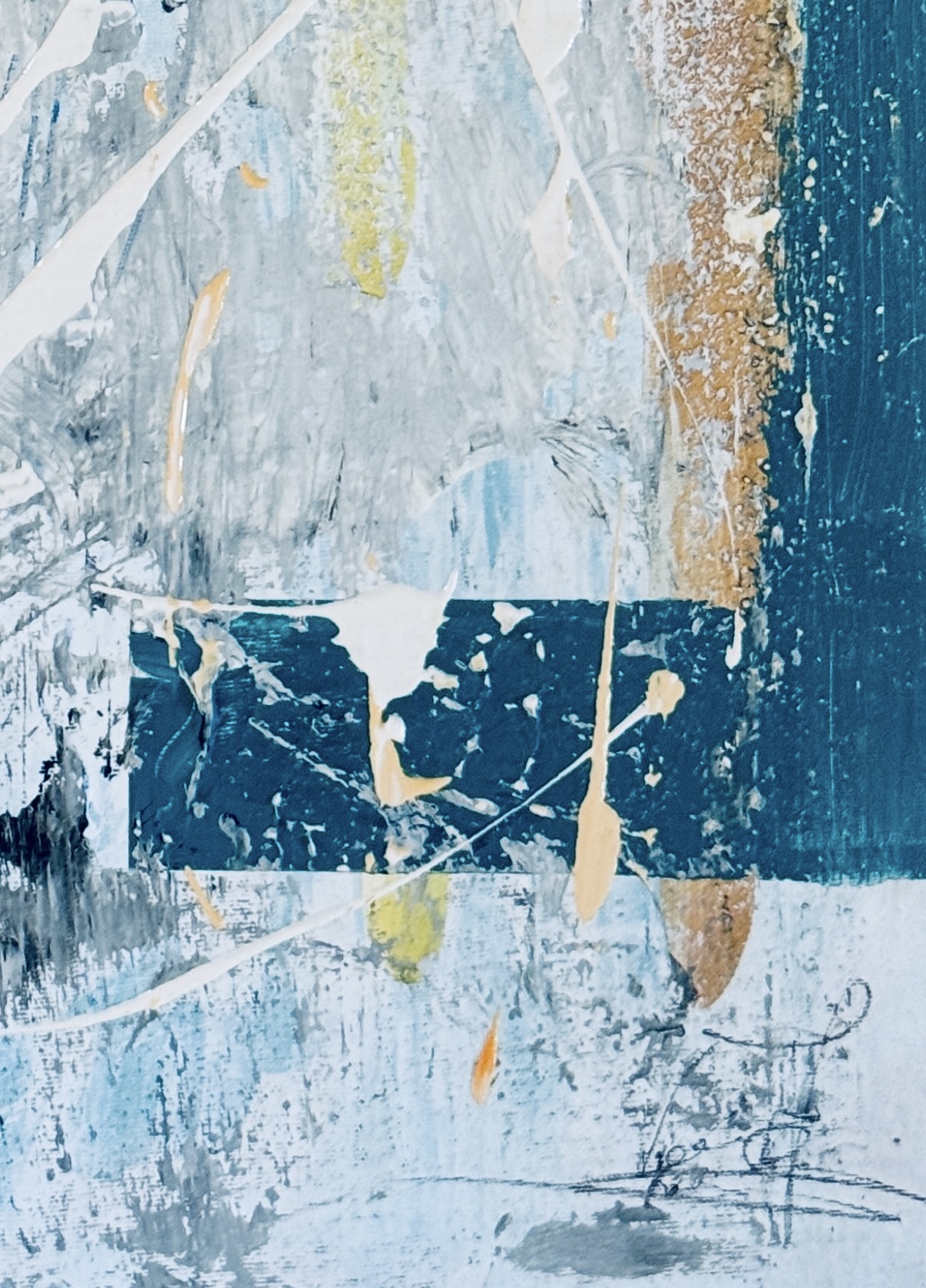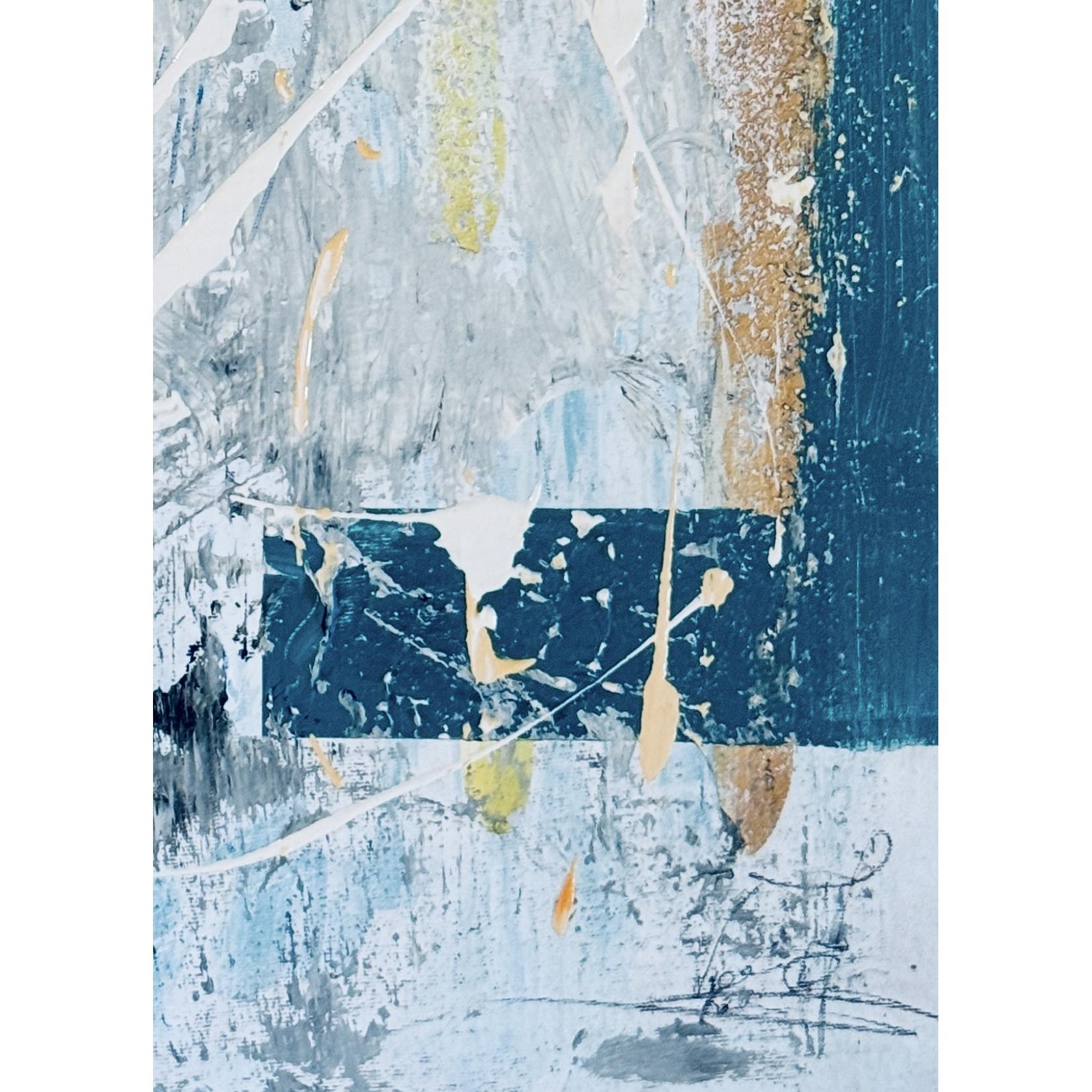 La texture ruvida e i segni quasi graffiati in alcune aree suggeriscono una lotta interiore, mentre l’esplosione di colore nella parte inferiore trasmette un senso di liberazione. Il blu intenso e il turchese a destra sembrano emergere da profondità nascoste, portando un senso di mistero e introspezione.