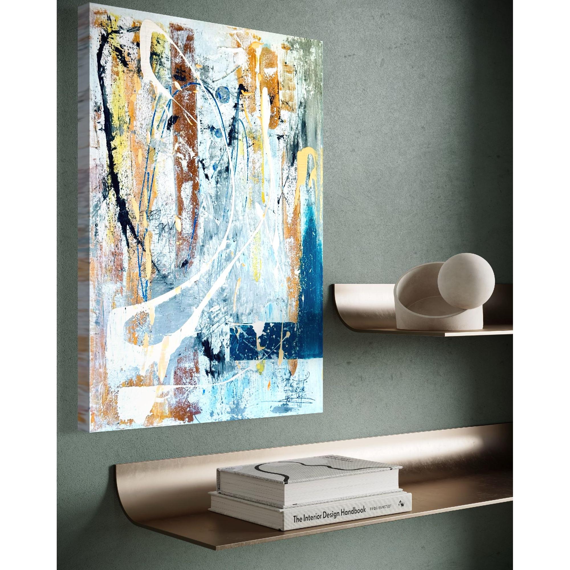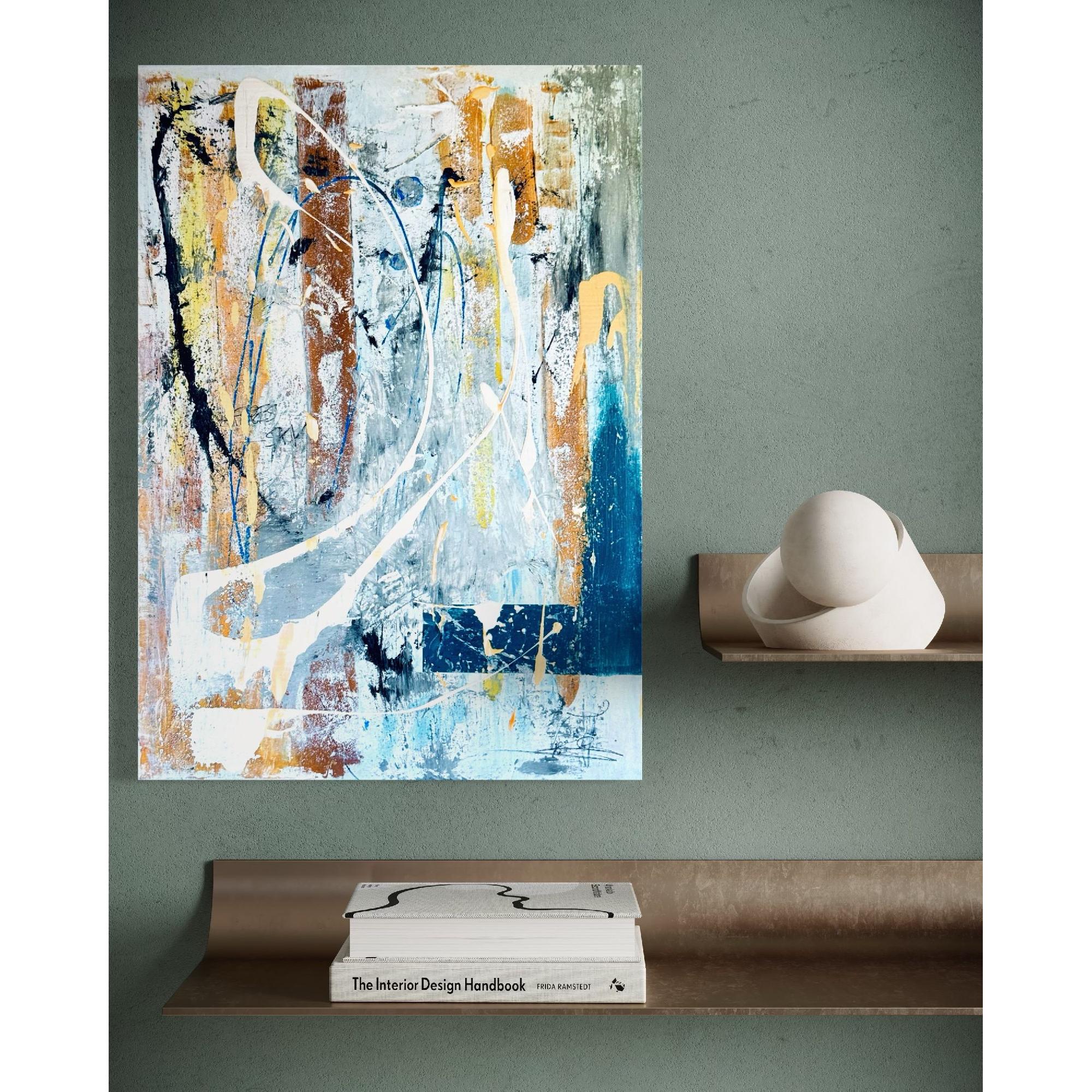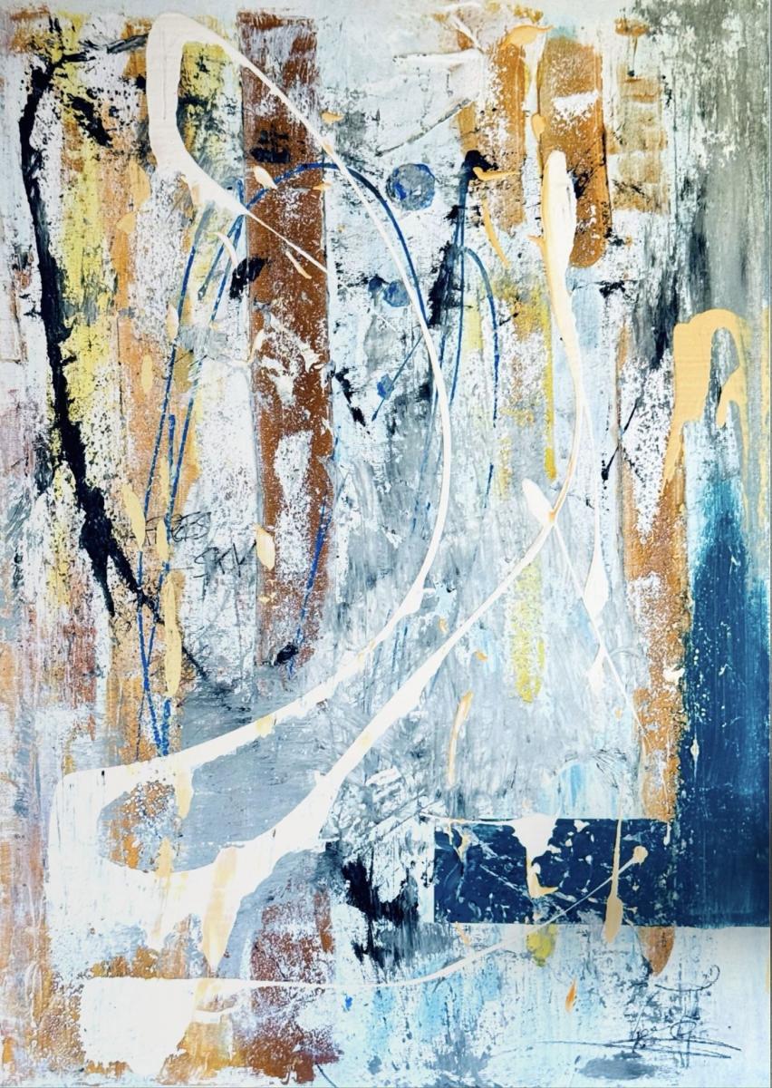 The composition opens with a dance of contrasting colors — deep blues, warm oranges, and crisp whites — interwoven on a textured, layered base. Gestural brushstrokes and splashes of paint appear guided by emotional impulse, evoking movement, chaos, and at the same time, balance. Curved lines and streams of white color cut across the canvas like paths of light, breaking the structure and defying all symmetry.