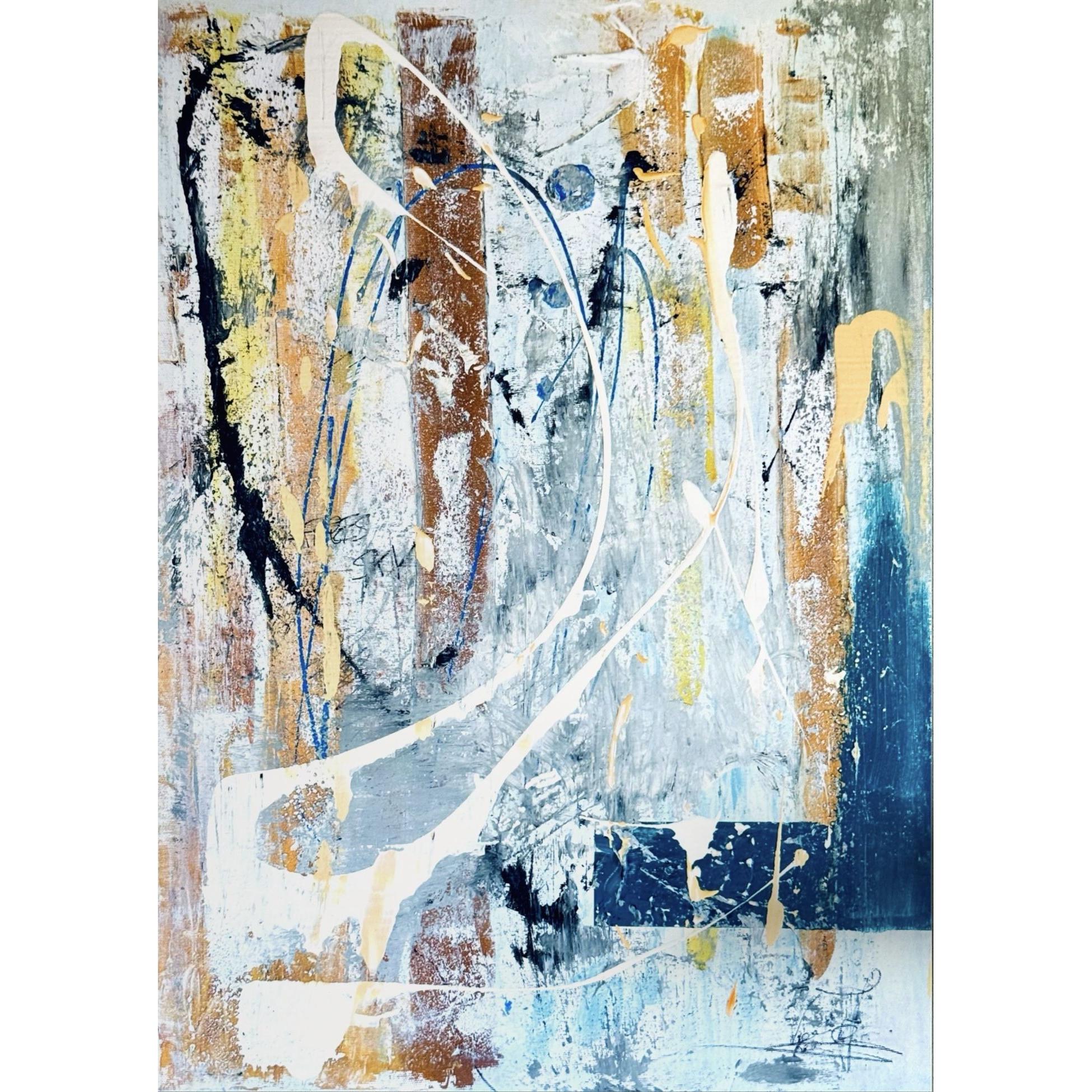 No Doubt, la composizione si apre con una danza di colori contrastanti — blu profondi, arancioni caldi, e bianchi netti — che si intrecciano su una base testurizzata e stratificata. Pennellate gestuali e schizzi di vernice sembrano guidati dall’impulso emotivo, evocando movimento, caos e al contempo equilibrio. Linee curve e flussi di colore bianco attraversano la tela come percorsi di luce, rompendo la struttura e sfidando ogni simmetria.