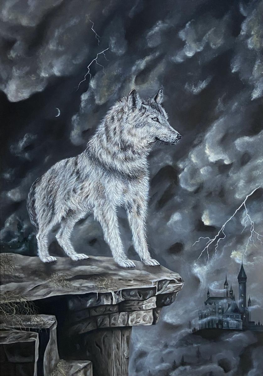 L'opera ritrae un lupo solitario su una rupe rocciosa, circondato da un cielo tempestoso, nuvole drammatiche e antichi castelli gotici in lontananza. Ogni pennellata cattura la forza selvaggia della natura e la malinconica bellezza del mistero. La composizione, sospesa tra luce e ombra, invita l'osservatore a un viaggio interiore, oltre l'eco dei tuoni, dove il silenzio incontra la forza dell'istinto.