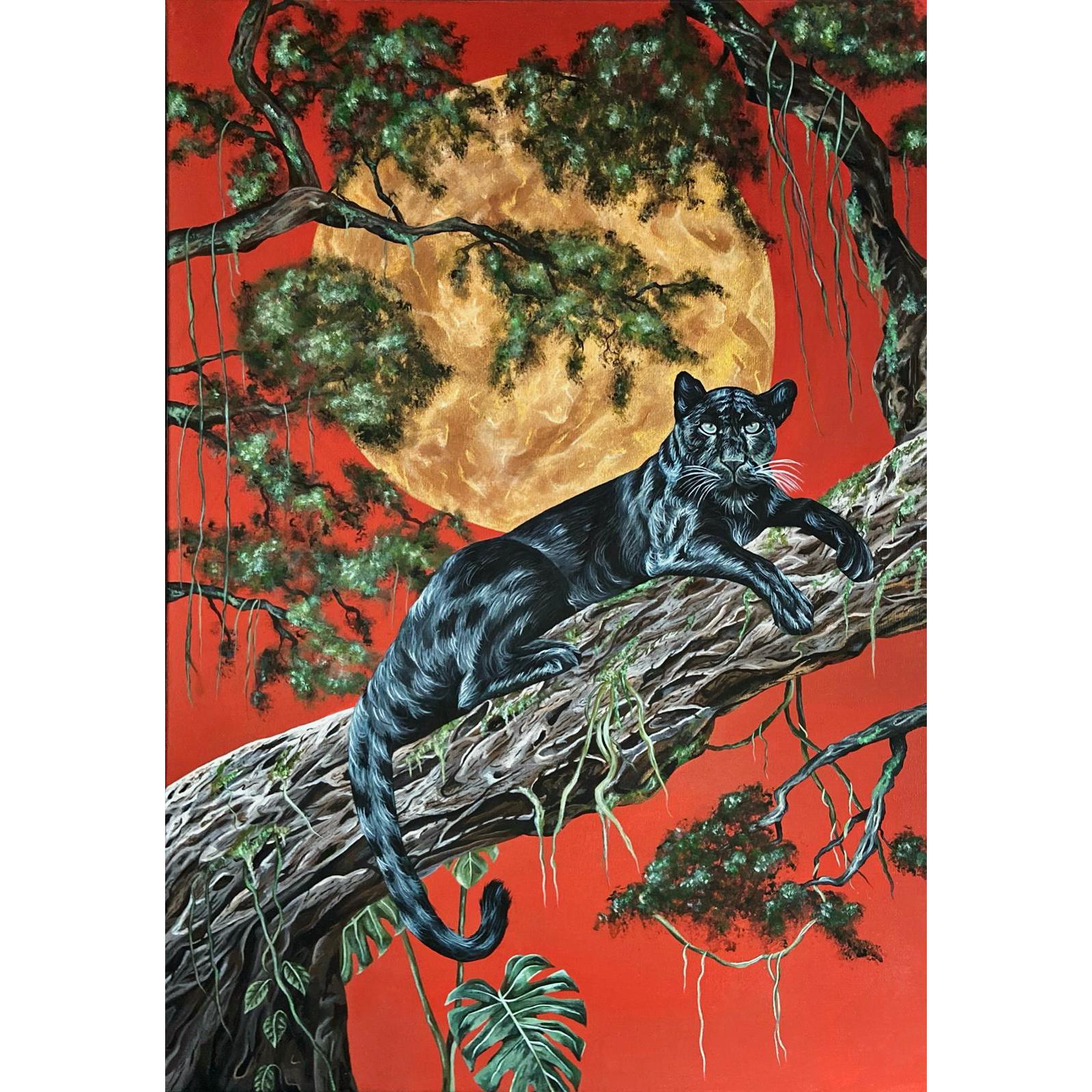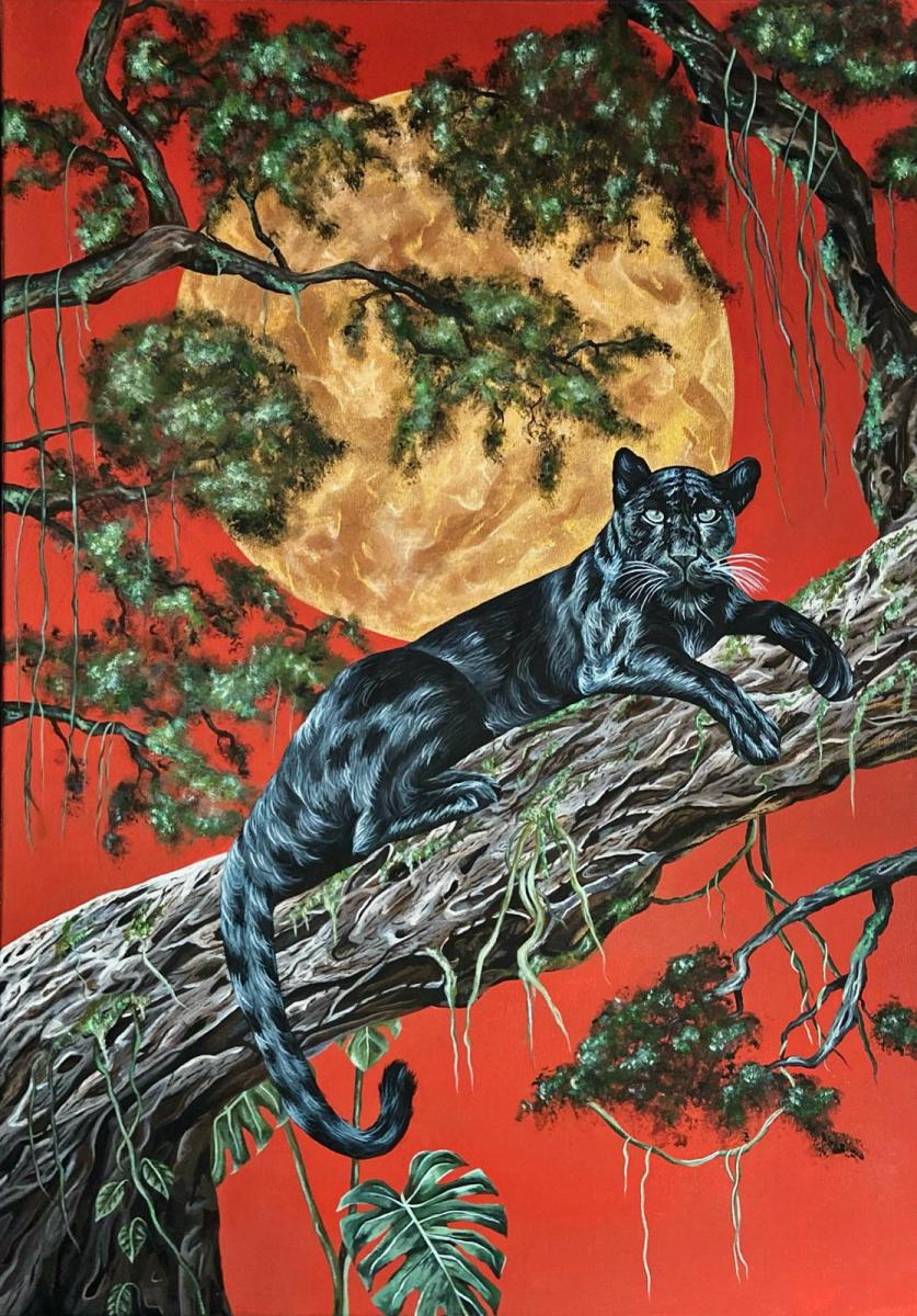 Nightshade is a silent yet powerful presence, part of the Instinct series, where each painting explores the raw connection with wild nature. The panther perched on a branch, with the moon glowing behind it against a crimson background, embodies strength, mystery, and instinct.