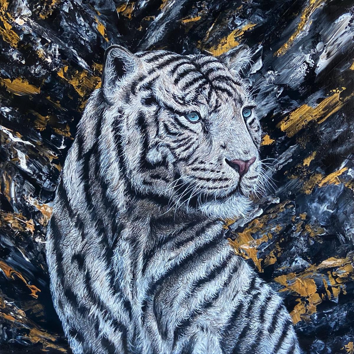 Dipinto acrilico raffigurante una tigre bianca che emerge da uno sfondo effetto marmo. Il contrasto tra la superficie fluida e la pietra e lo sguardo intenso dell'animale evidenzia un equilibrio tra eleganza, forza e immobilità.