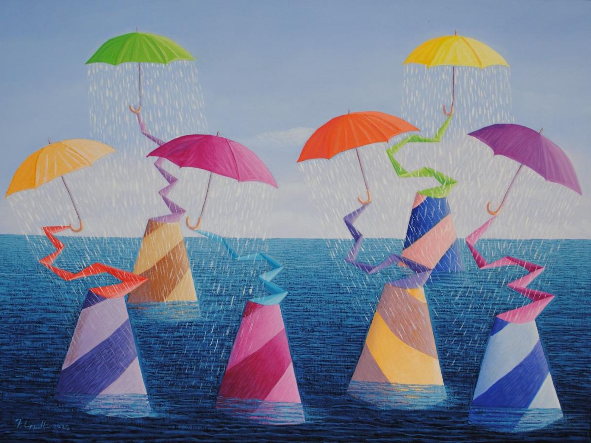 L'opera rappresenta delle forme coniche nell'acqua azzurra del mare,con degli ombrelli multicolori, dai quali piove.
