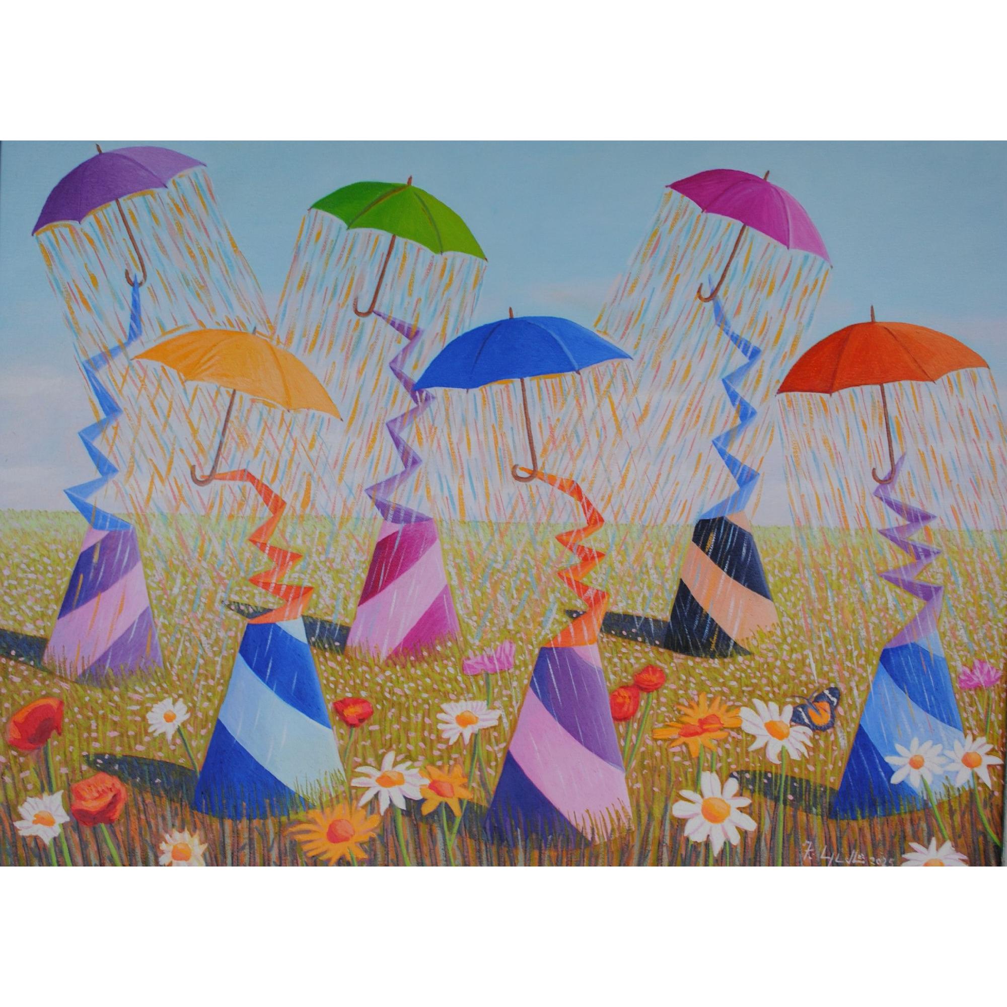 L'opera rappresenta delle forme coniche simboliche in un prato pieno di fiori, con degli ombrelli che piovono colori! Trasmette un messaggio di allegria e serenità.