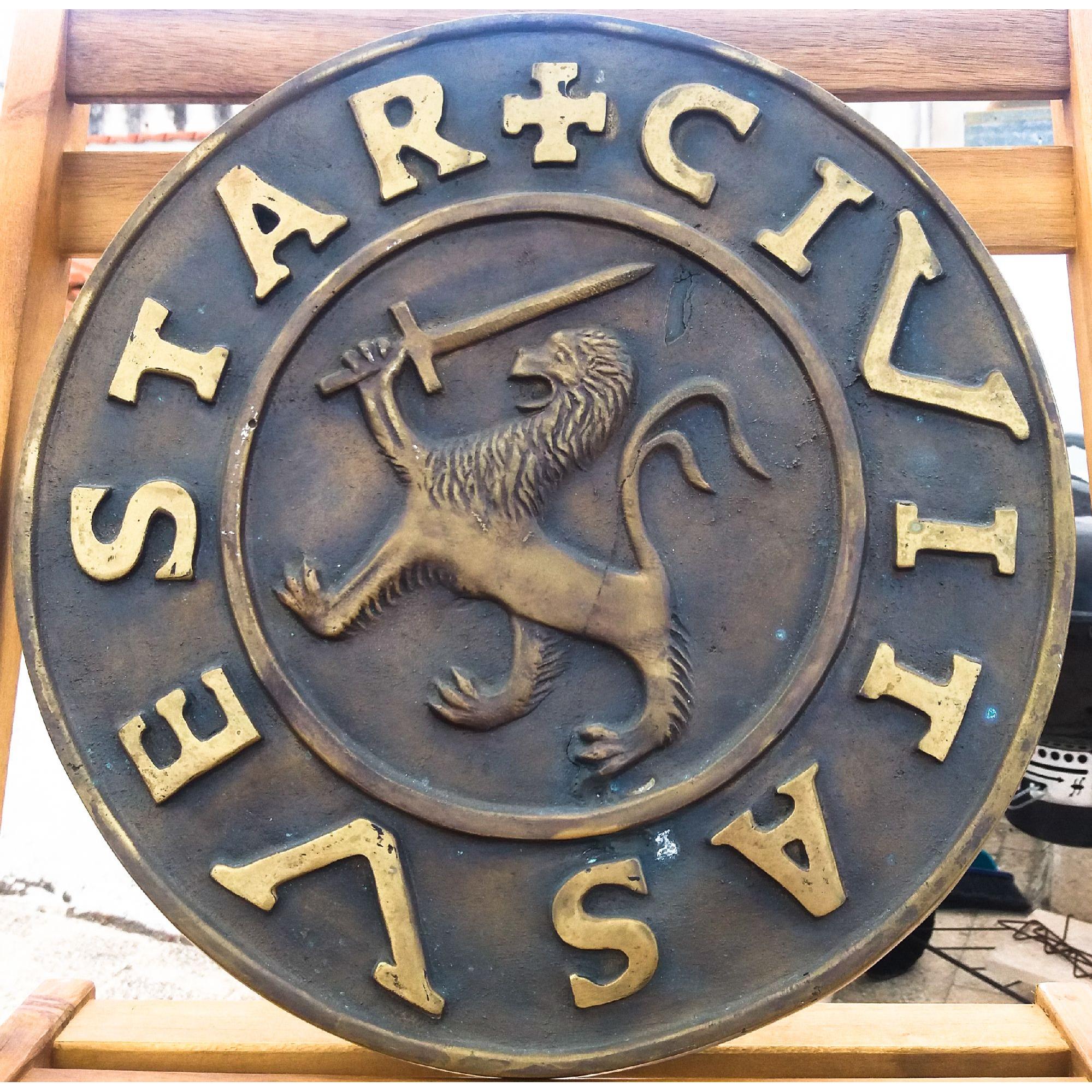 Si tratta della riproduzione su un tondo di bronzo dello stemma di Vieste, che ho rintracciato in numerosissimi documenti nell'Archivio di Stato di Napoli, e che è stato usato, nei documenti ufficiali, per tutto il Cinquecento e buona parte del Seicento, quando al leone venne aggiunto San Giorgio a cavallo, Patrono del paese. Il leone rampante rappresentato su questo antico stemma è rimasto sostanzialmente identico fino ad oggi. Soltanto che nel Cinquecento impugnava un lungo spadone, mentre oggi soltanto uno spadino. Ho fatto degli studi approfonditi al riguardo (nell'ambito di una ricerca più ampia sugli stemmi di tutta la Capitanata), che ho consegnato al Comune di Vieste. In esso sostengo, basandomi soprattutto sull'esistenza a Vieste di quello che ritengo l'antico Municipio del paese, il cosiddetto Palazzo del Podestà, che lo stemma del nostro paese derivi direttamente dal Leone di San Marco di Venezia. Difatti questo Leone è rappresentato ben due volte su questo Palazzo, mentre ai suoi due lati difende e protegge San Michele, che rappresenta tutto il Gargano. Bisogna aggiungere che Vieste è stata sottoposta alla Repubblica Veneta per quasi un secolo, dalla fine del Quindicesimo Secolo, fin quasi alla fine del Sedicesimo. La scritta ai bordi della stemma da me riprodotto VESTARUM CIVITAS significa "CITTA' DI VIESTE". Vieste quindi in latino è solo plurale, come Athenae-Athenarum. Infine la scritta sul cartiglio del Leone di San Marco rappresentato su quel balcone recita: "Pax tibi, Marce, Evangelista meus", che è appunto la dicitura esatta del Leone Marciano di Venezia. Si deve ancora aggiungere che il leone veneziano con lo spadone (a preferenza del più classico col cartiglio) era dato alle città della Repubblica poste ai suoi confini come baluardi.