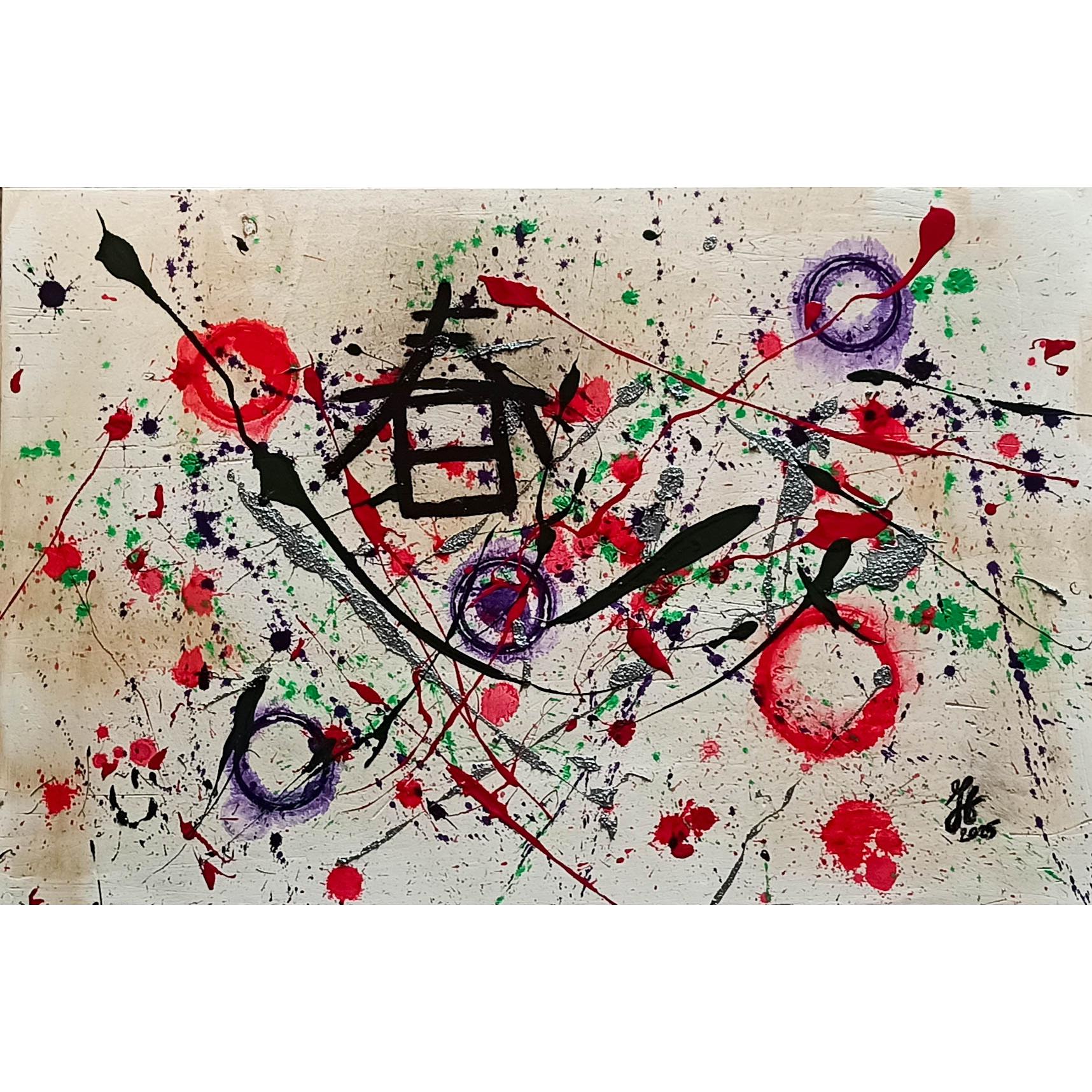 Si tratta di una tavola di multistrato precedentemente stuccata e levigata. Su questo stucco ho messo dei colori (acrilici) e delle forme, e verso il centro, l'ideogramma giapponese che indica la primavera, prima eseguito col carboncino e poi con colore nero ad olio. Ho voluto rappresentare il ciclo di ogni metamorfosi, dal meno al più, dall'indeterminato alla forma compiuta.