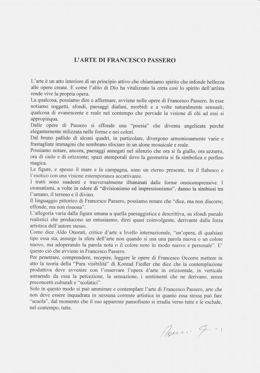 Solo in questo modo si può ammirare e contemplare l'arte di Francesco Passero,arte che non deve essere inquadrata in nessuna corrente artistica in quanto essa stessa può fare "scuola",dal momento che il suo apparente pansofismo si irradia verso tutte e le esclude, nel contempo,tutte.