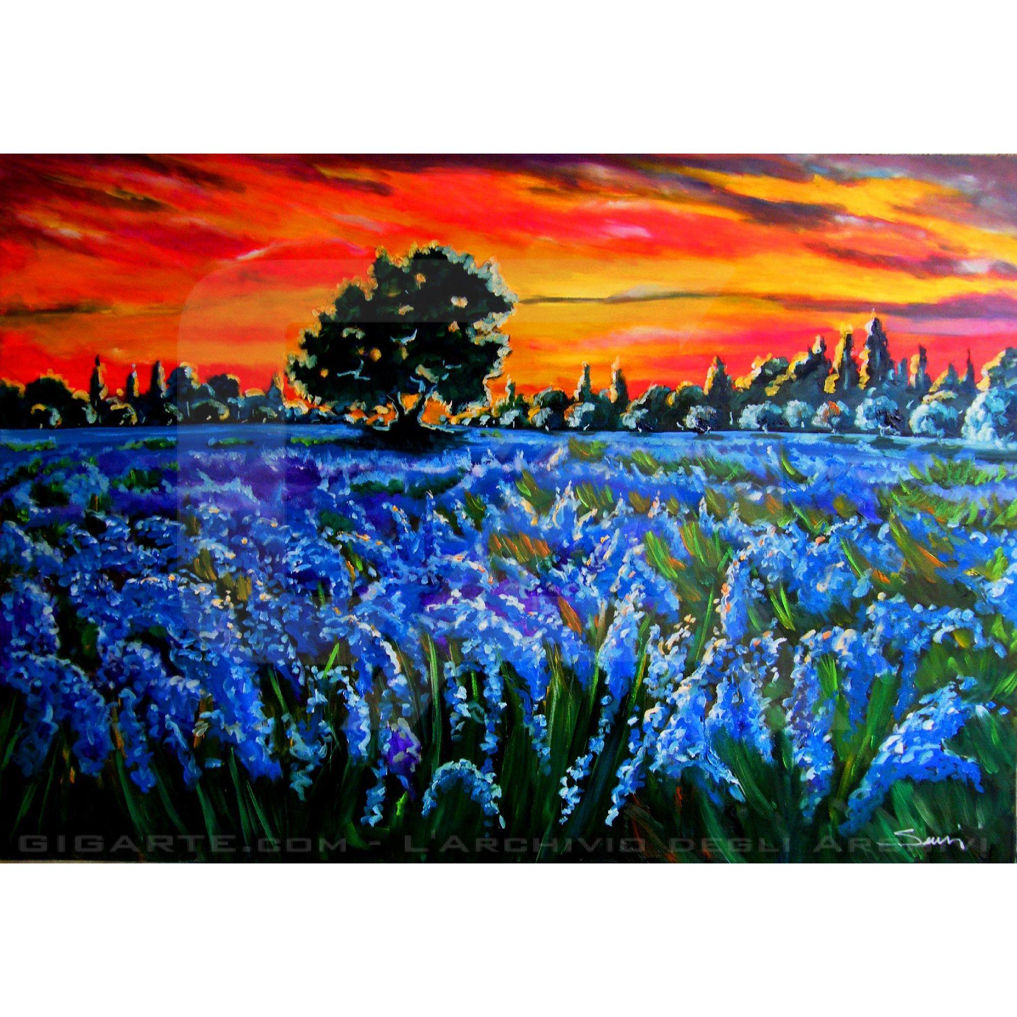 Tramonto sui fiori di campo e ulivi
