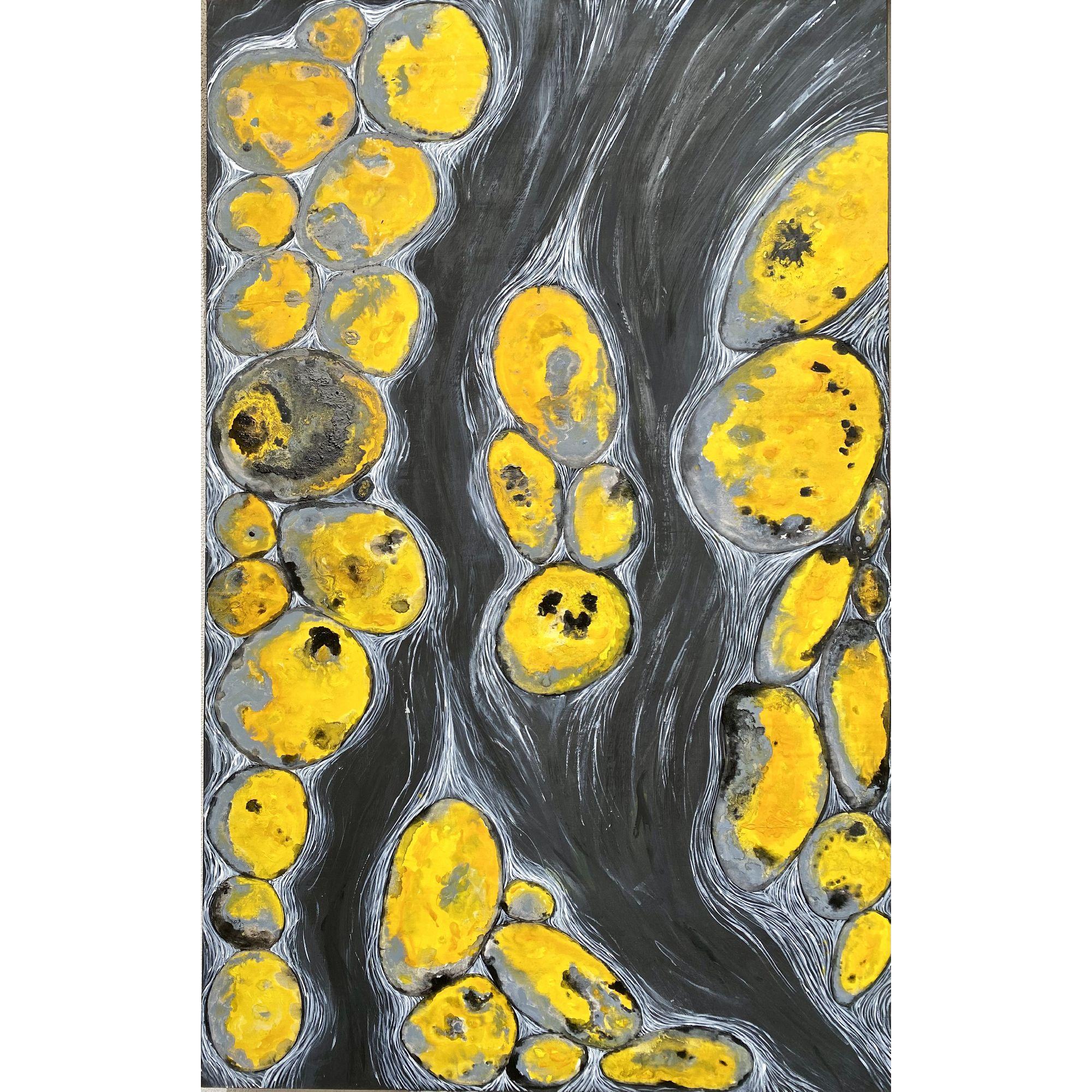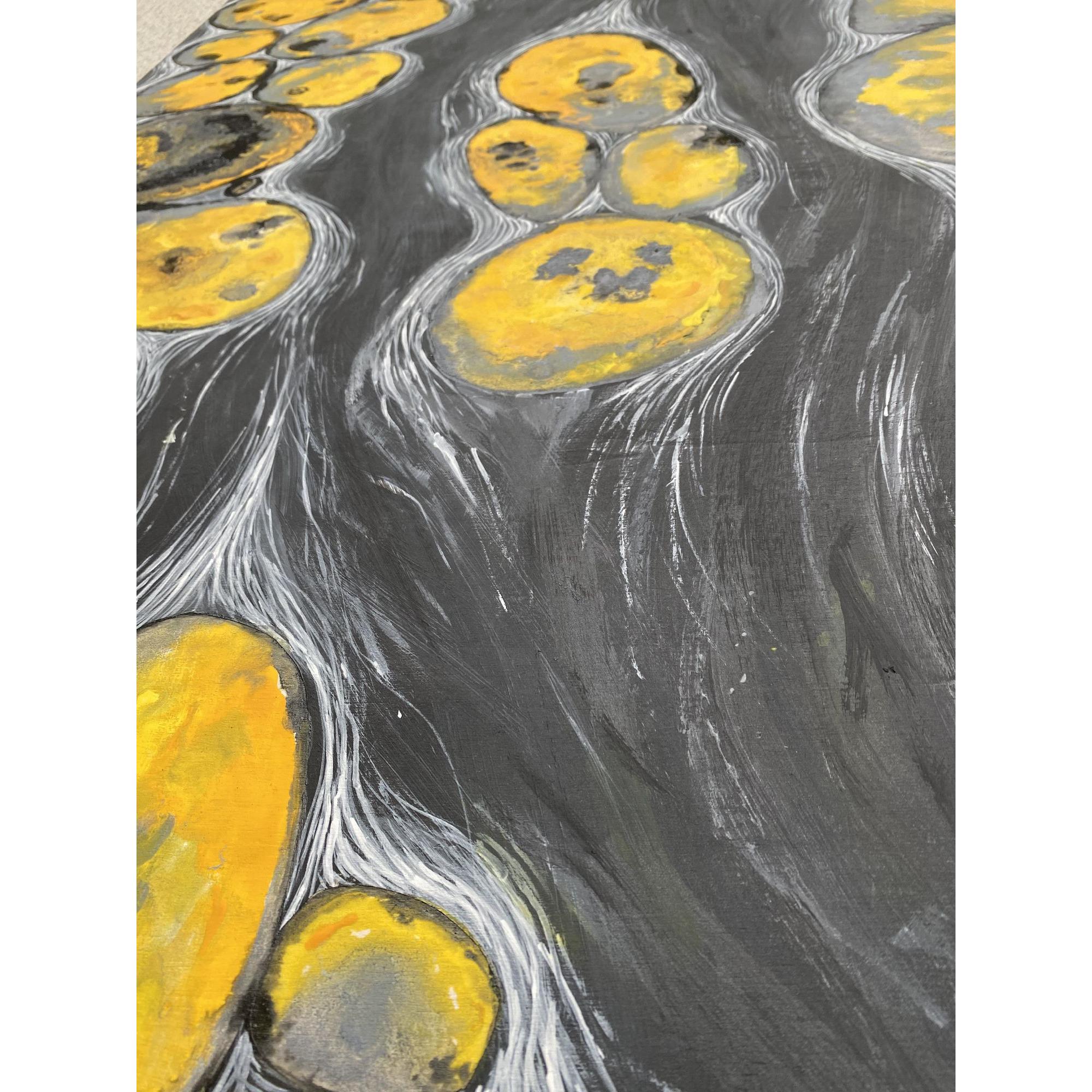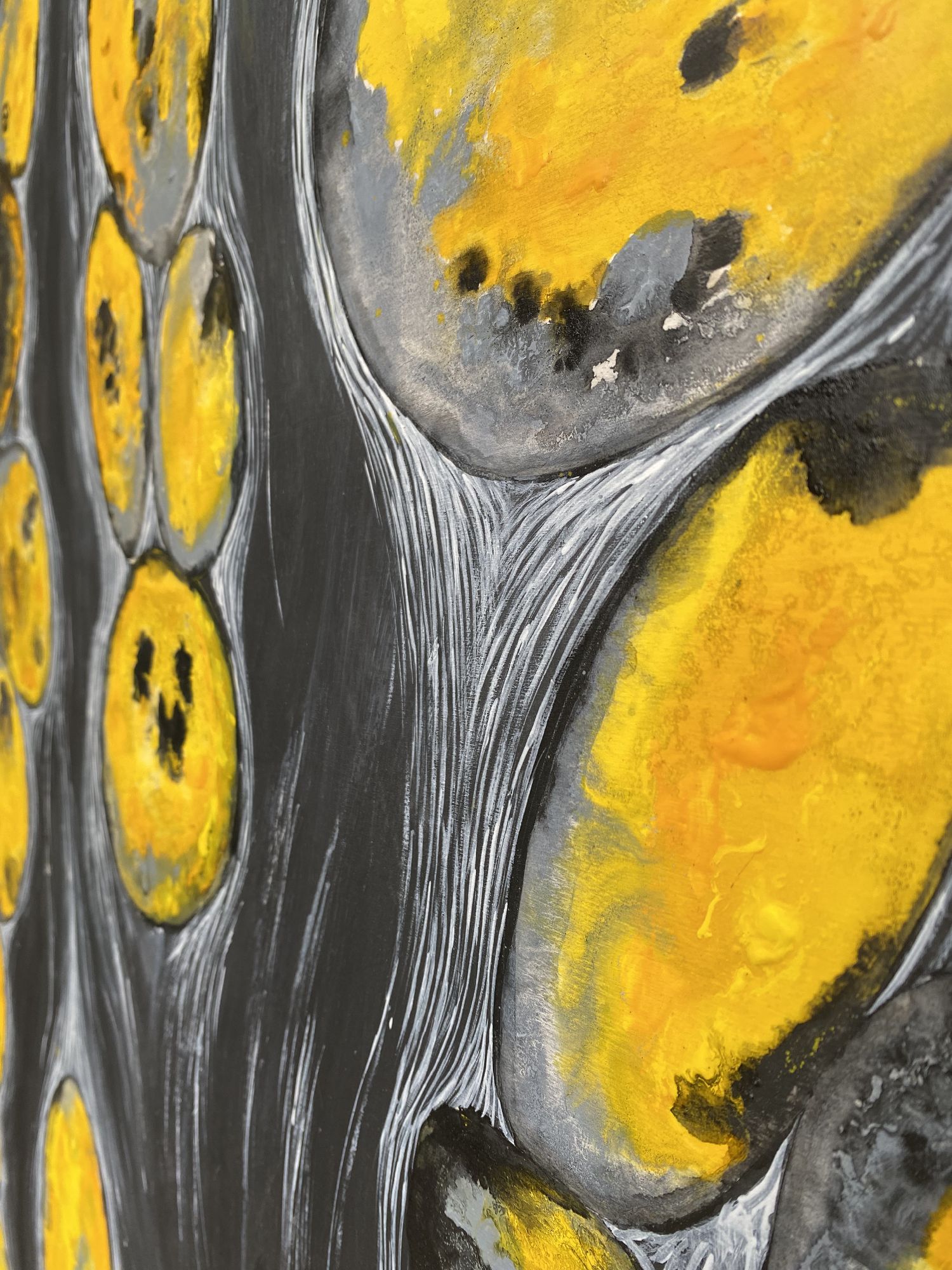 Era l’agosto del 2021 quando pensai questa opera non ricordo bene cosa mi ispirò se non quello di rappresentare un fiume che scorre. firmato e datato sul retro senza indicare un titolo convinto. Poi arriva l’estate del 2025 appena passata, e durante una delle mie esposizioni portai, un dipinto in azzurro e giallo. Ed è così che nei momenti di pausa, anche io , divento spettatore dei miei stessi dipinti cogliendo particolari diversi… E osservandoli, come posso dire, ci connettiamo e ci parliamo, o meglio, questo dipinto mi ha suggerito di eseguirlo uguale solo con un’altra variante di colore! Non c’è stato neanche il tempo di dire perché che la risposta è arrivata con Panta Rhei un celebre aforisma attribuito ad Eraclito. Questo concetto descrive la filosofia del divenire, secondo cui, ogni cosa nel mondo è incostante mutamento e trasformazione, paragonato all’acqua di un fiume, che non è mai la stessa da un momento all’altro. Quindi mettendomi all’opera è giunto il nuovo colore in nero, un fiume nero , scelto forse dal mio inconscio. Forte, deciso e per certi aspetti drammatico non per tutti gli occhi soprattutto a chi non è abituato al colore puro , io stesso appena terminato faticavo a fermare lo sguardo e mi è sembrato che quel nero profondo celasse tante emozioni, nascoste, sentendo un nodo alla gola, è così!! Lui arriva forte!!! Panta Rhei scorre !!