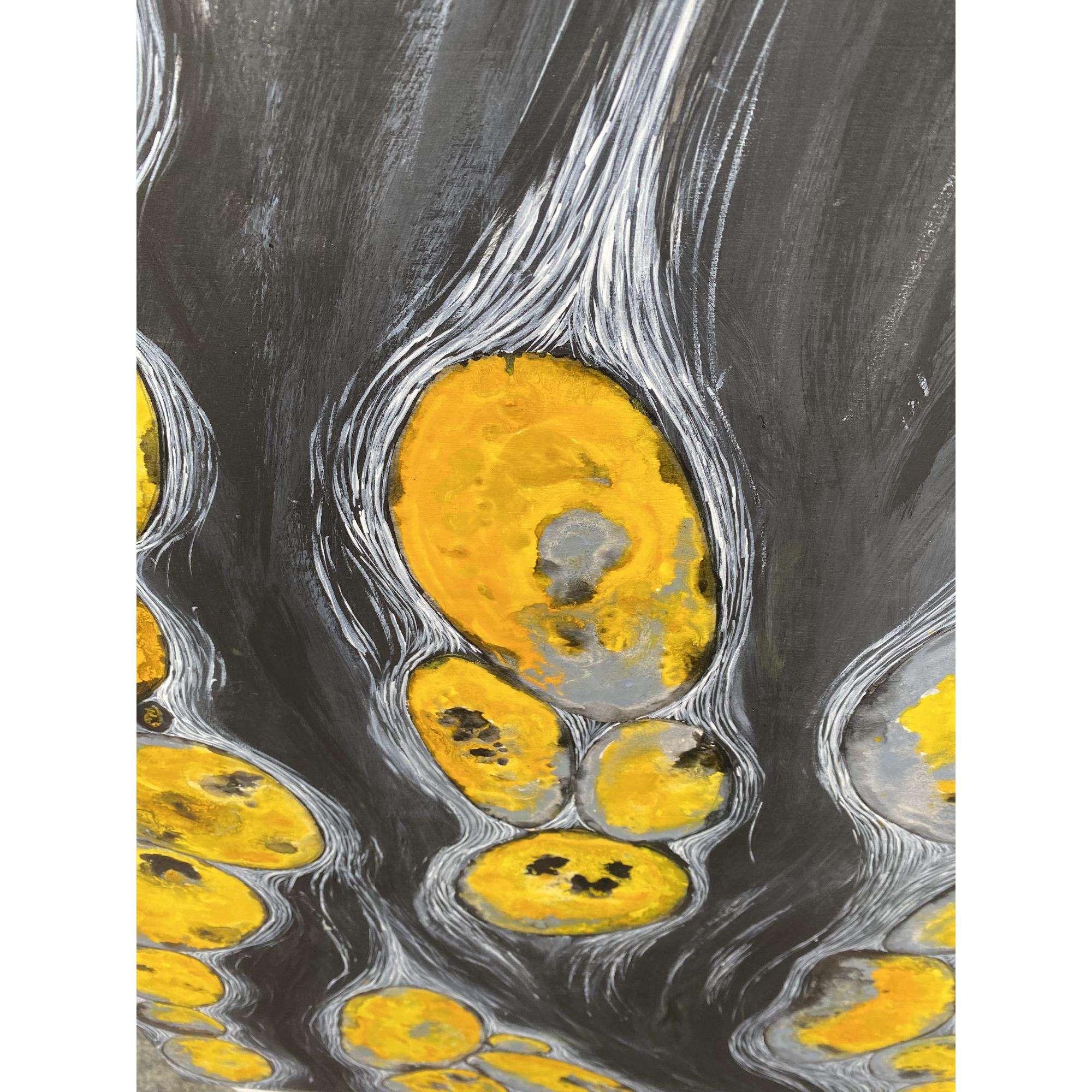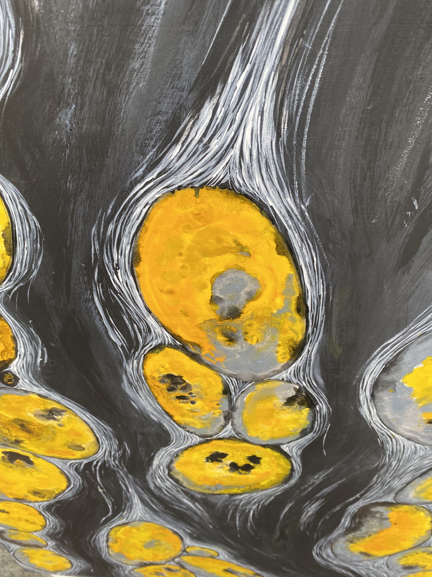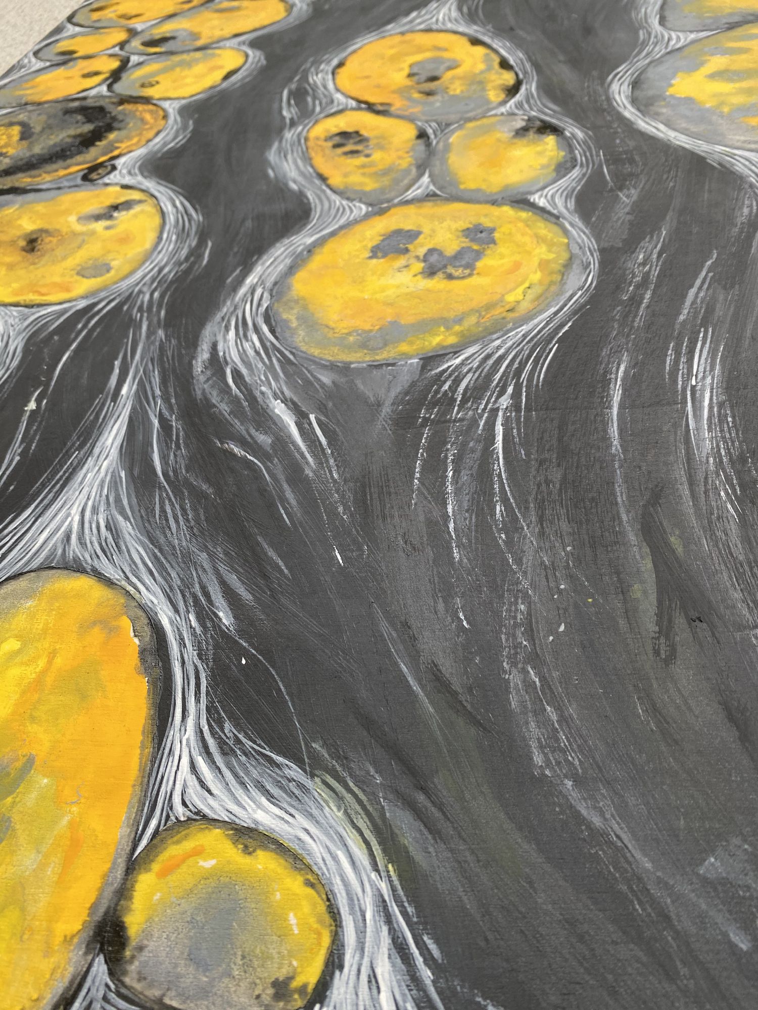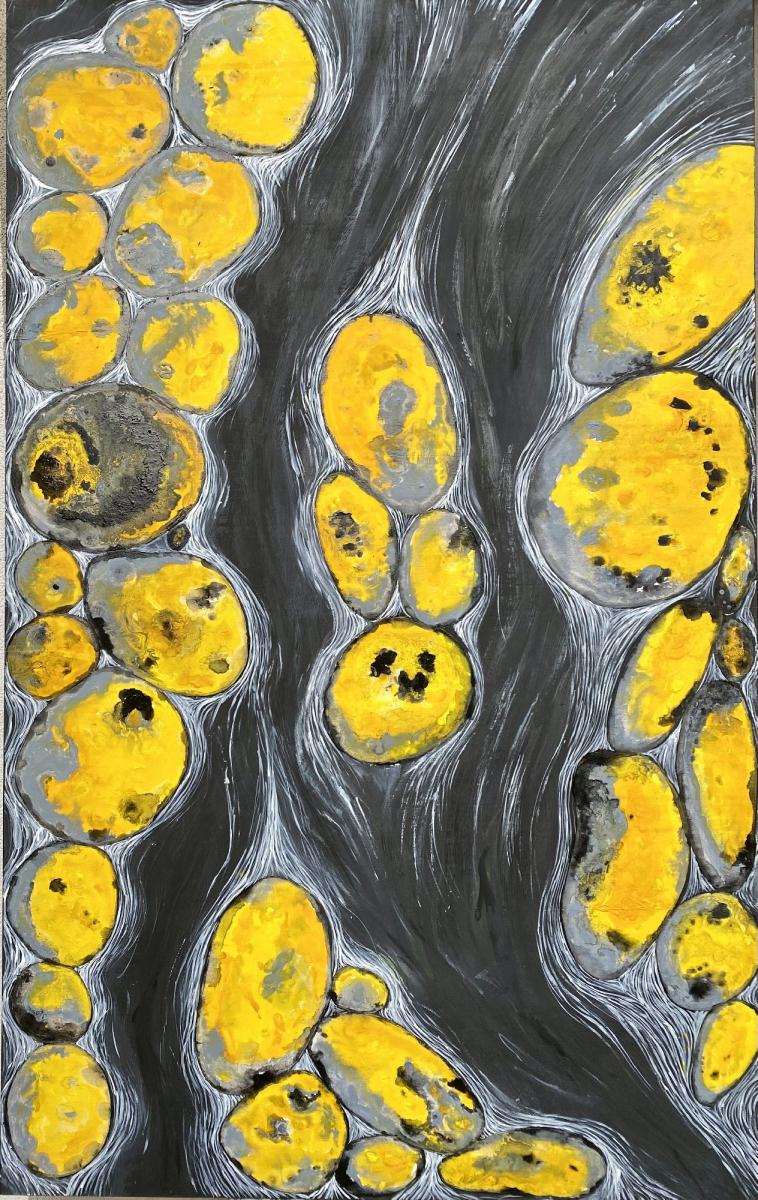 Era l’agosto del 2021 quando pensai questa opera non ricordo bene cosa mi ispirò se non quello di rappresentare un fiume che scorre. firmato e datato sul retro senza indicare un titolo convinto. Poi arriva l’estate del 2025 appena passata, e durante una delle mie esposizioni portai, un dipinto in azzurro e giallo. Ed è così che nei momenti di pausa, anche io , divento spettatore dei miei stessi dipinti cogliendo particolari diversi… E osservandoli, come posso dire, ci connettiamo e ci parliamo, o meglio, questo dipinto mi ha suggerito di eseguirlo uguale solo con un’altra variante di colore! Non c’è stato neanche il tempo di dire perché che la risposta è arrivata con Panta Rhei un celebre aforisma attribuito ad Eraclito. Questo concetto descrive la filosofia del divenire, secondo cui, ogni cosa nel mondo è incostante mutamento e trasformazione, paragonato all’acqua di un fiume, che non è mai la stessa da un momento all’altro. Quindi mettendomi all’opera è giunto il nuovo colore in nero, un fiume nero , scelto forse dal mio inconscio. Forte, deciso e per certi aspetti drammatico non per tutti gli occhi soprattutto a chi non è abituato al colore puro , io stesso appena terminato faticavo a fermare lo sguardo e mi è sembrato che quel nero profondo celasse tante emozioni, nascoste, sentendo un nodo alla gola, è così!! Lui arriva forte!!! Panta Rhei scorre !!