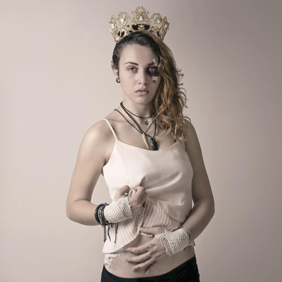 La principessa con la corona e le ferite è un simbolo di come l'amore possa essere distorto e diventare una fonte di dolore e sofferenza. L'amore non dovrebbe essere una gabbia dorata, ma una fonte di libertà e felicità. In questo ritratto, la corona dorata sulla testa della donna rappresenta il potere e l'autonomia che le sono stati strappati, mentre le ferite e le bende sul corpo rivelano la vulnerabilità e la paura che si nascondono dietro la maschera della regalità.Il gesto della ragazza, che solleva la canotta per far scorgere timidamente la ferita bendata sul fianco, è un atto di rivelazione e di confessione. È un invito a guardare oltre la superficie, a vedere le ferite che si nascondono dietro la maschera della perfezione.La corona può essere vista come l'illusione iniziale di una relazione, un 'amore' che sembra valorizzare e nobilitare, ma che in realtà cela meccanismi di potere e manipolazione. La ferita bendata sul fianco suggerisce un dolore interiore, una sofferenza che si nasconde sotto la superficie. L'amore vero non può coesistere con la paura e l'umiliazione. La vera regalità e la dignità stanno nel riconoscere e rifiutare queste dinamiche tossiche. Invito a riflettere su cosa significhi veramente l'amore e come possiamo cambiarlo per creare relazioni più sane e rispettose.