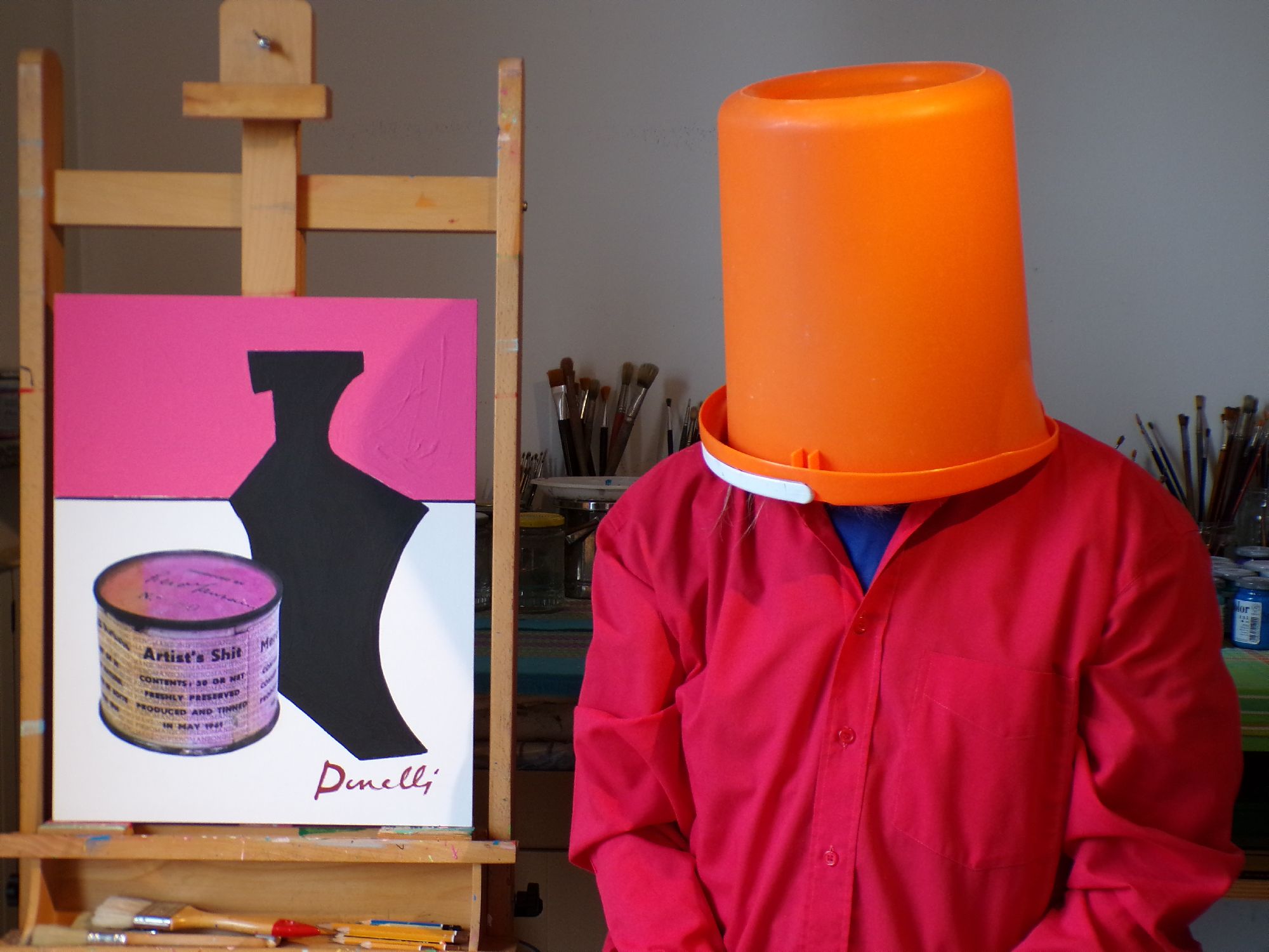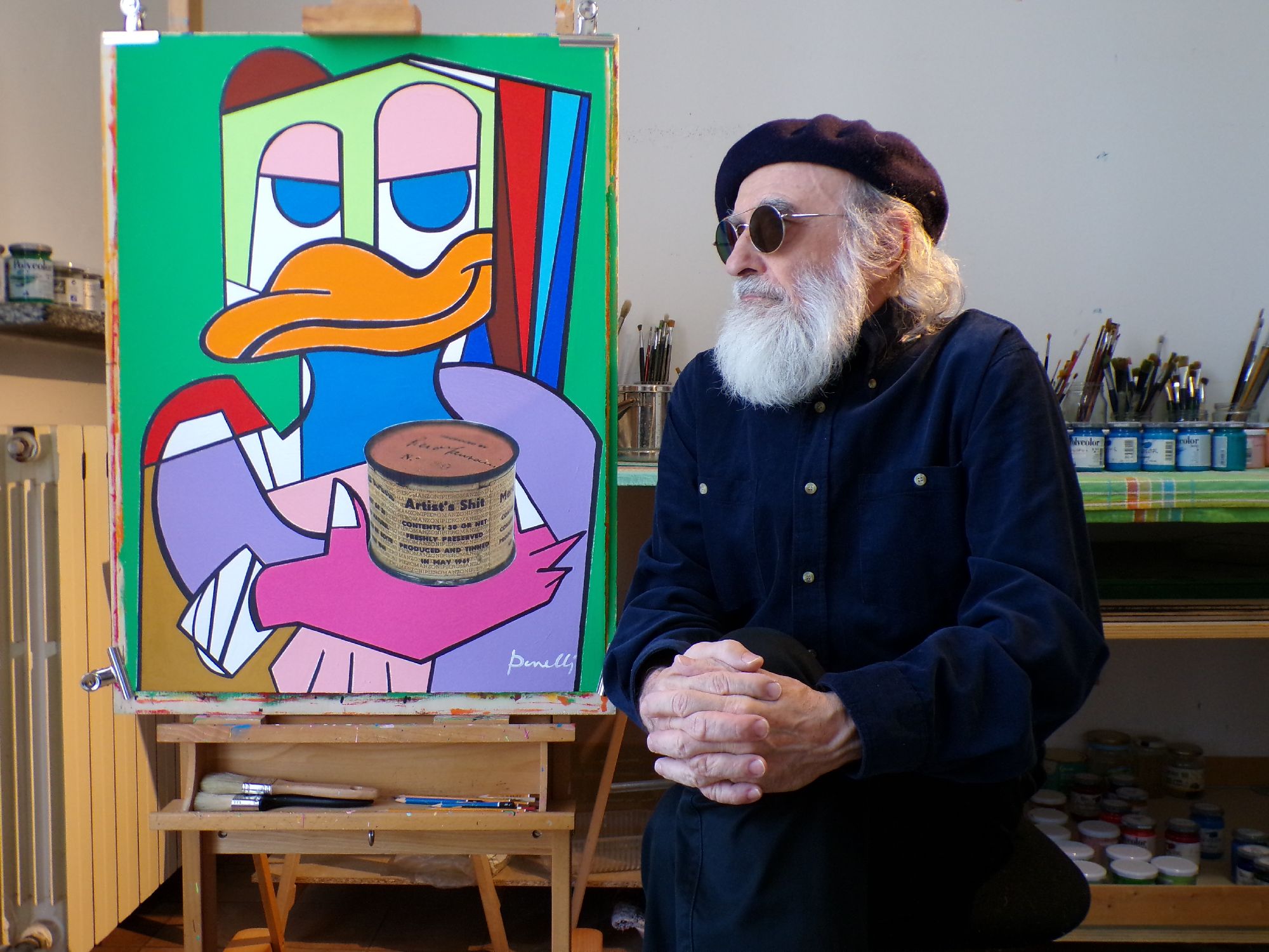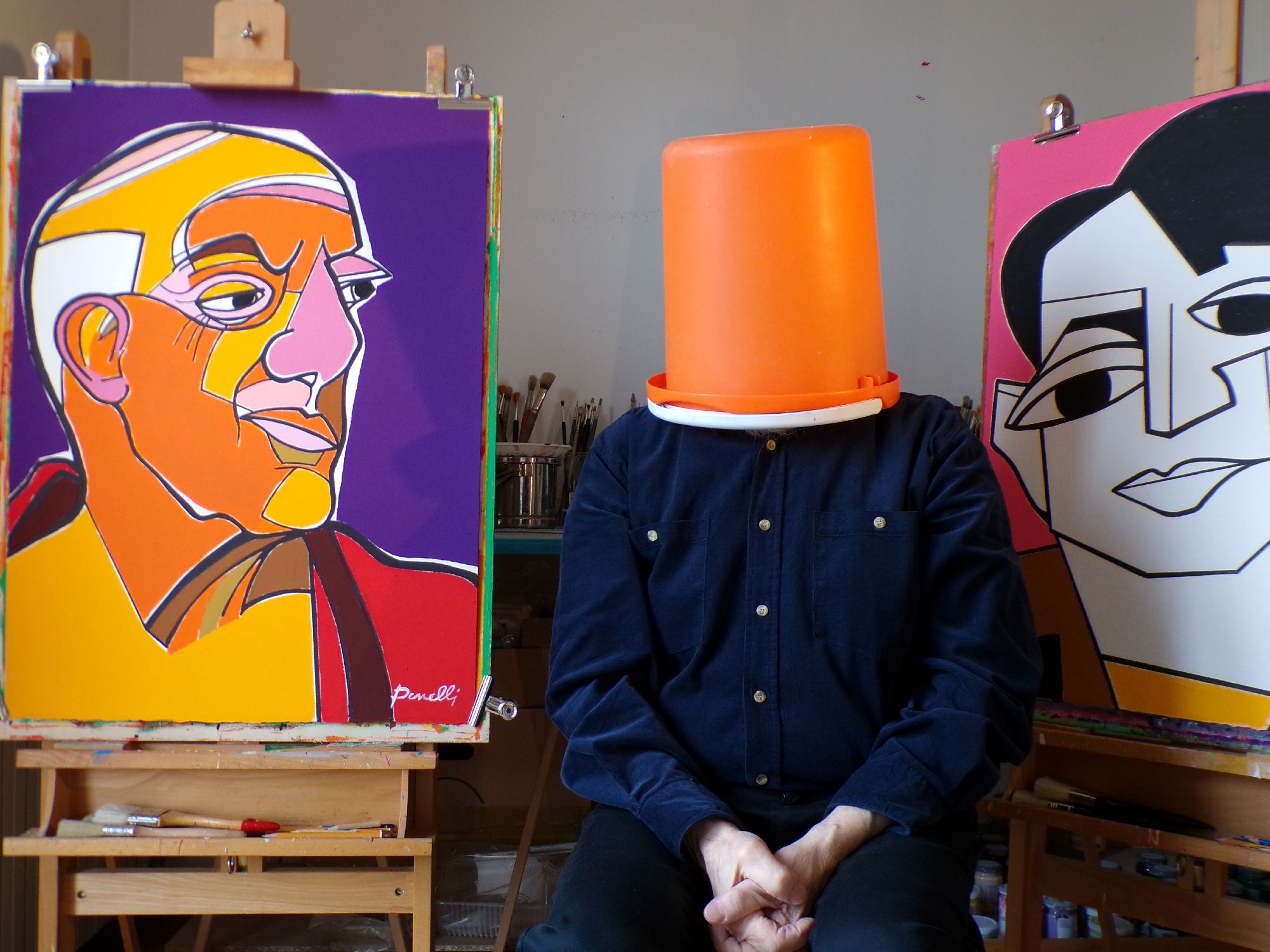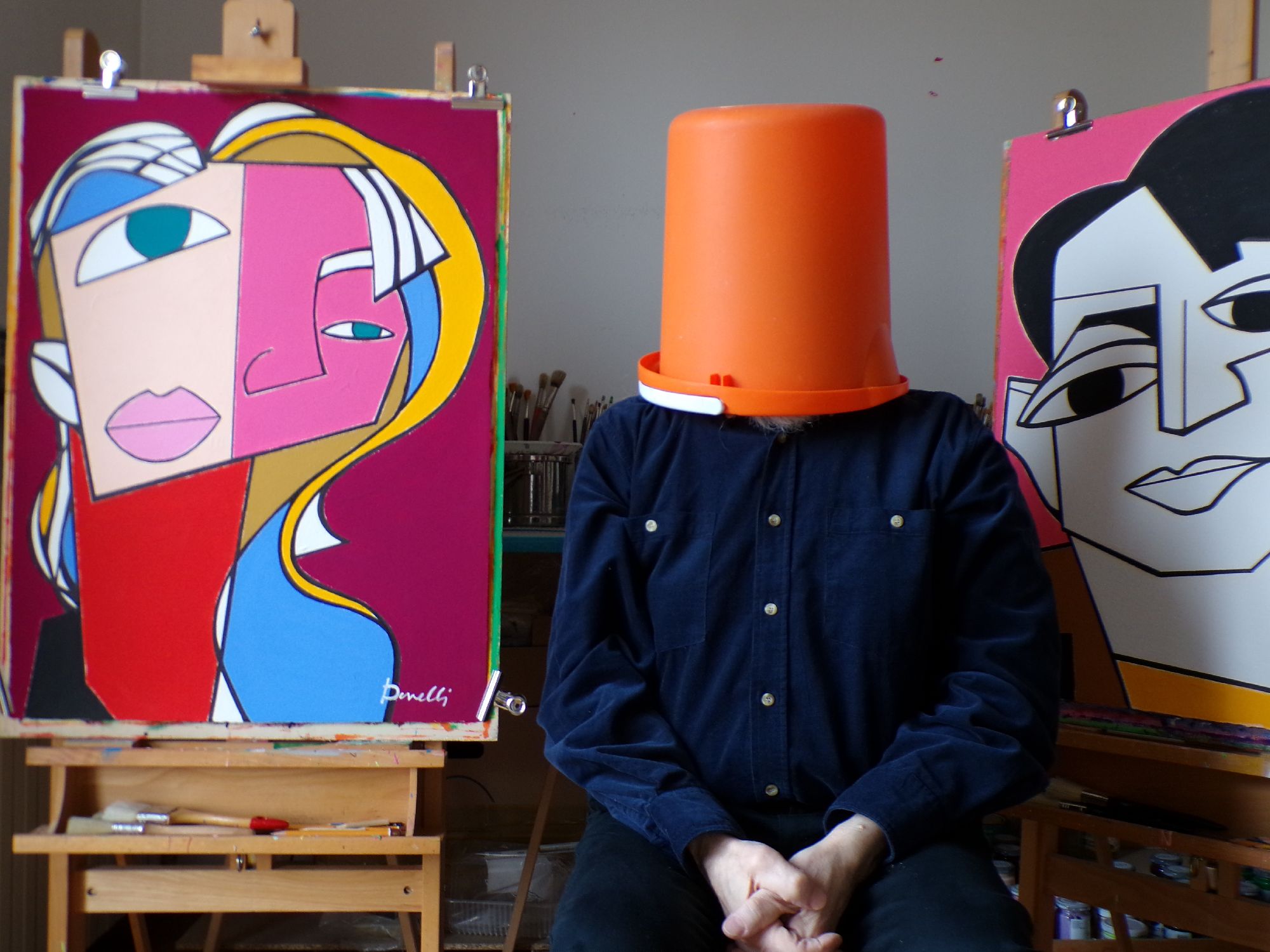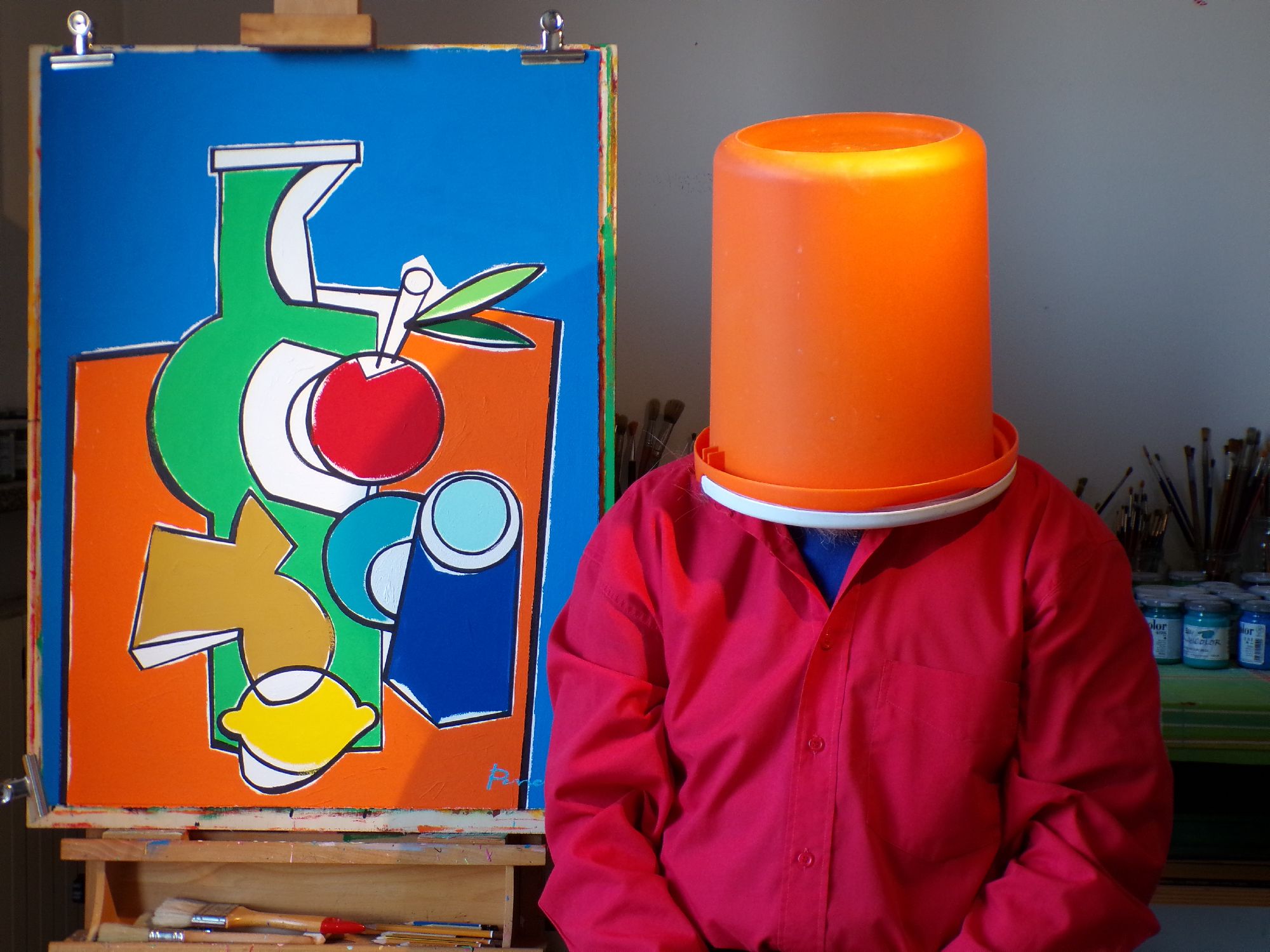 munito del pennello e di tavolozza, all'interno di un ambiente spoglio dominato dal blue e da