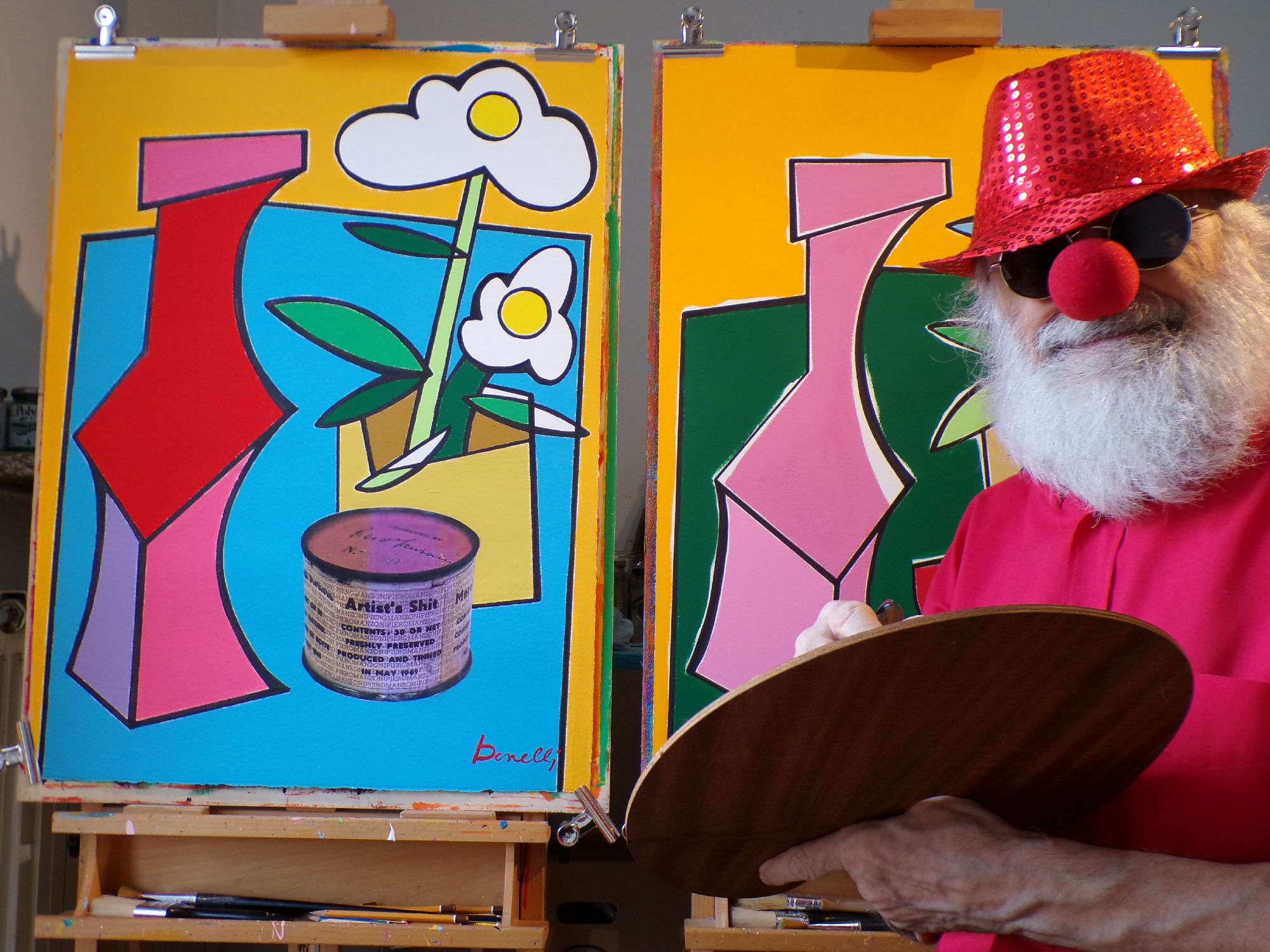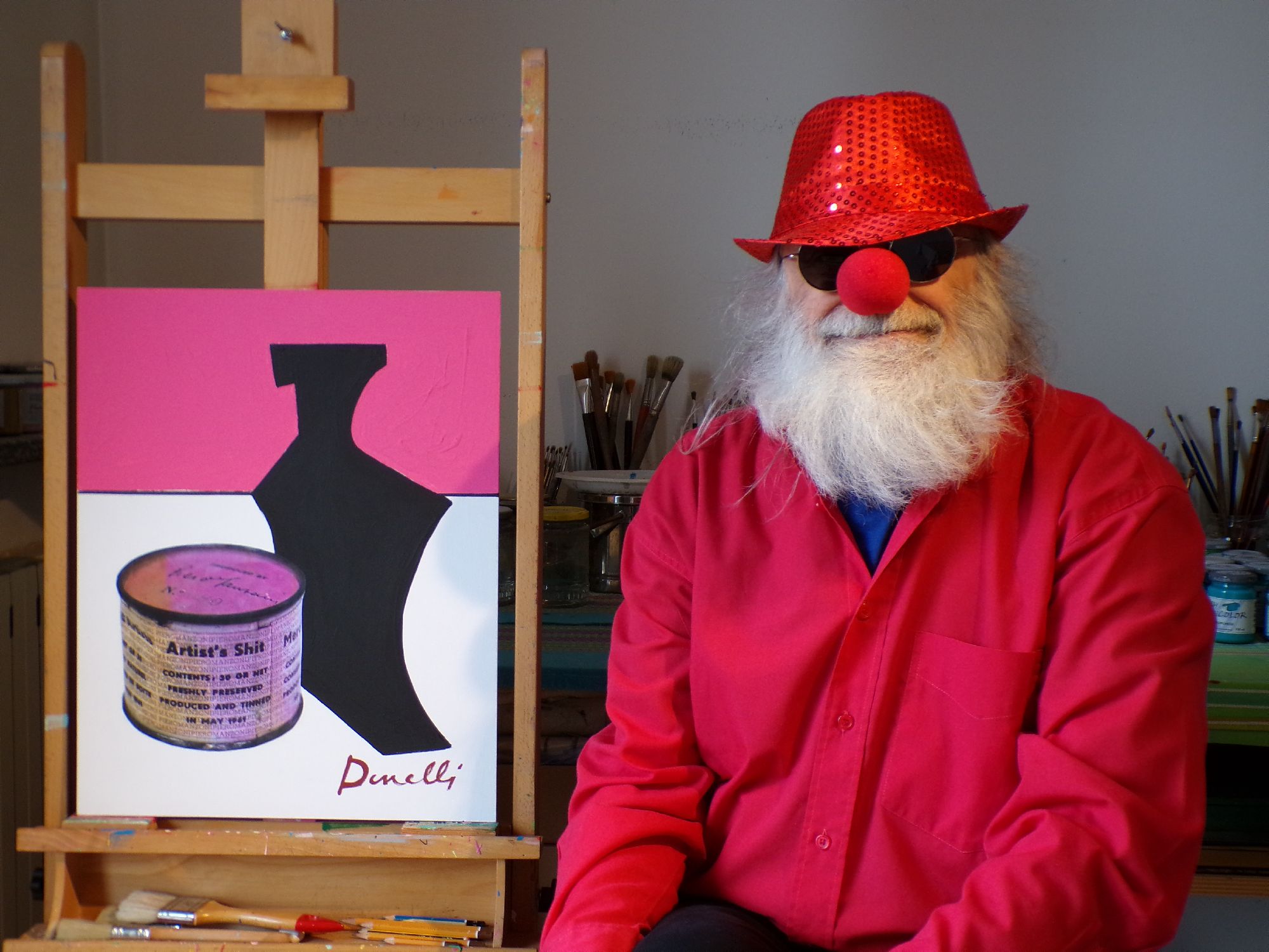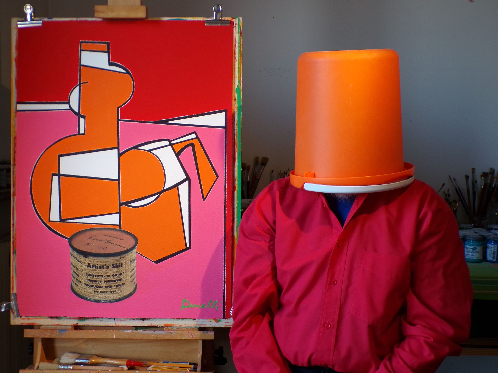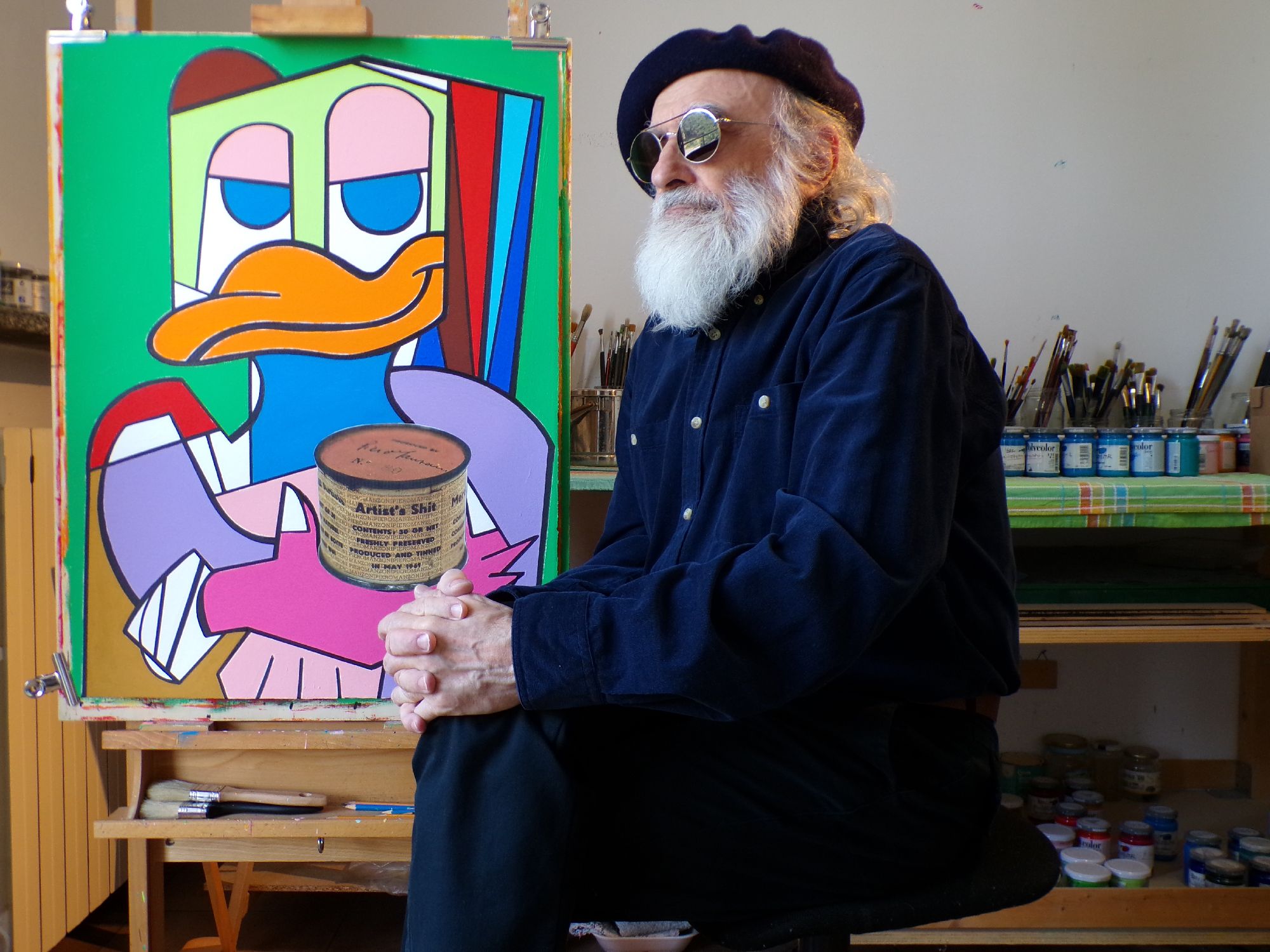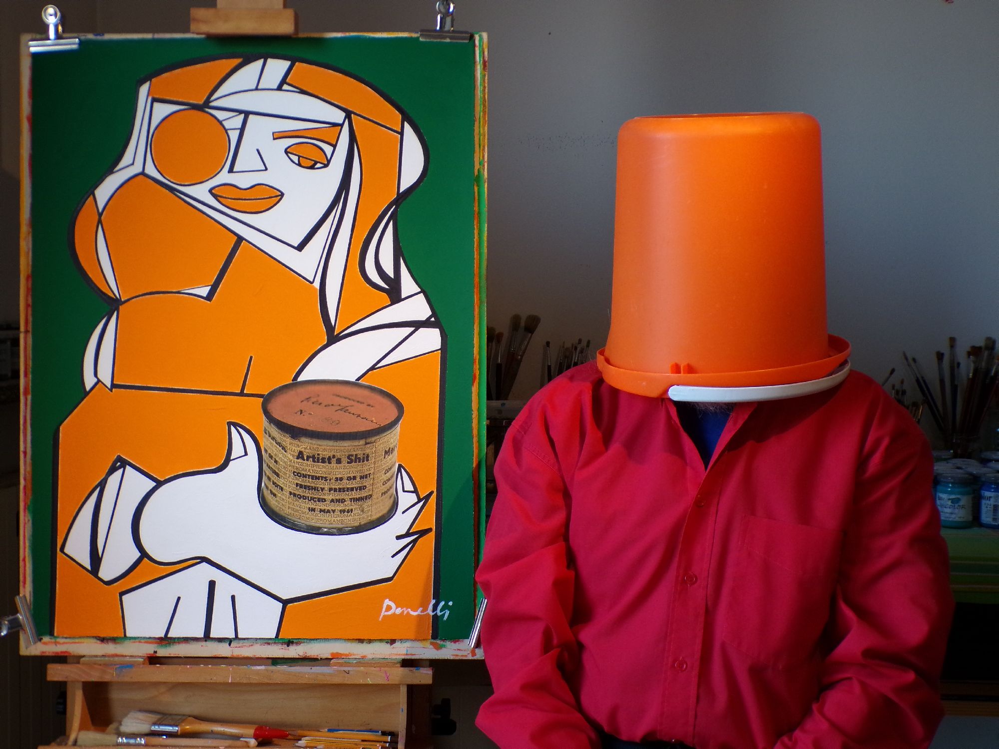 munito del pennello e di tavolozza, all'interno di un ambiente spoglio dominato dal blue e da