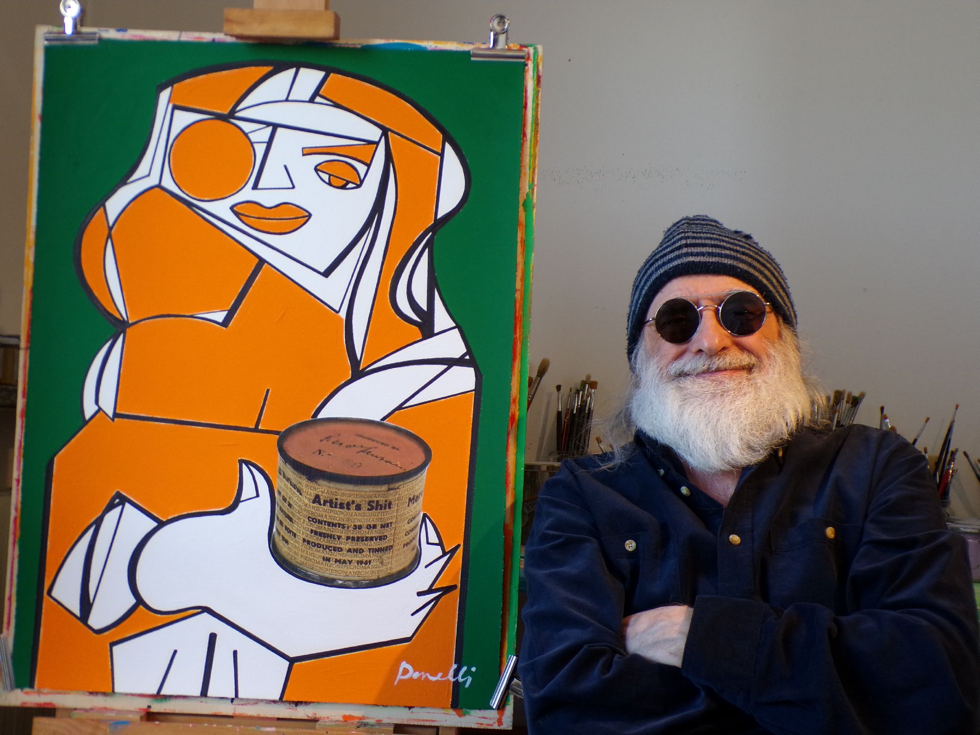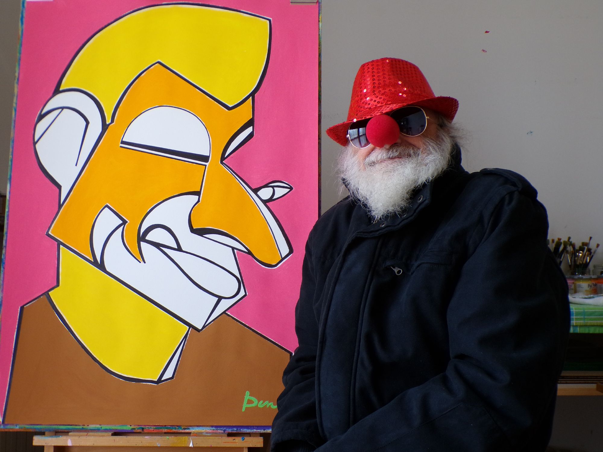 L'artista, raffigurato con capelli corti e barba lunga, prende vita su uno sfondo giallo e