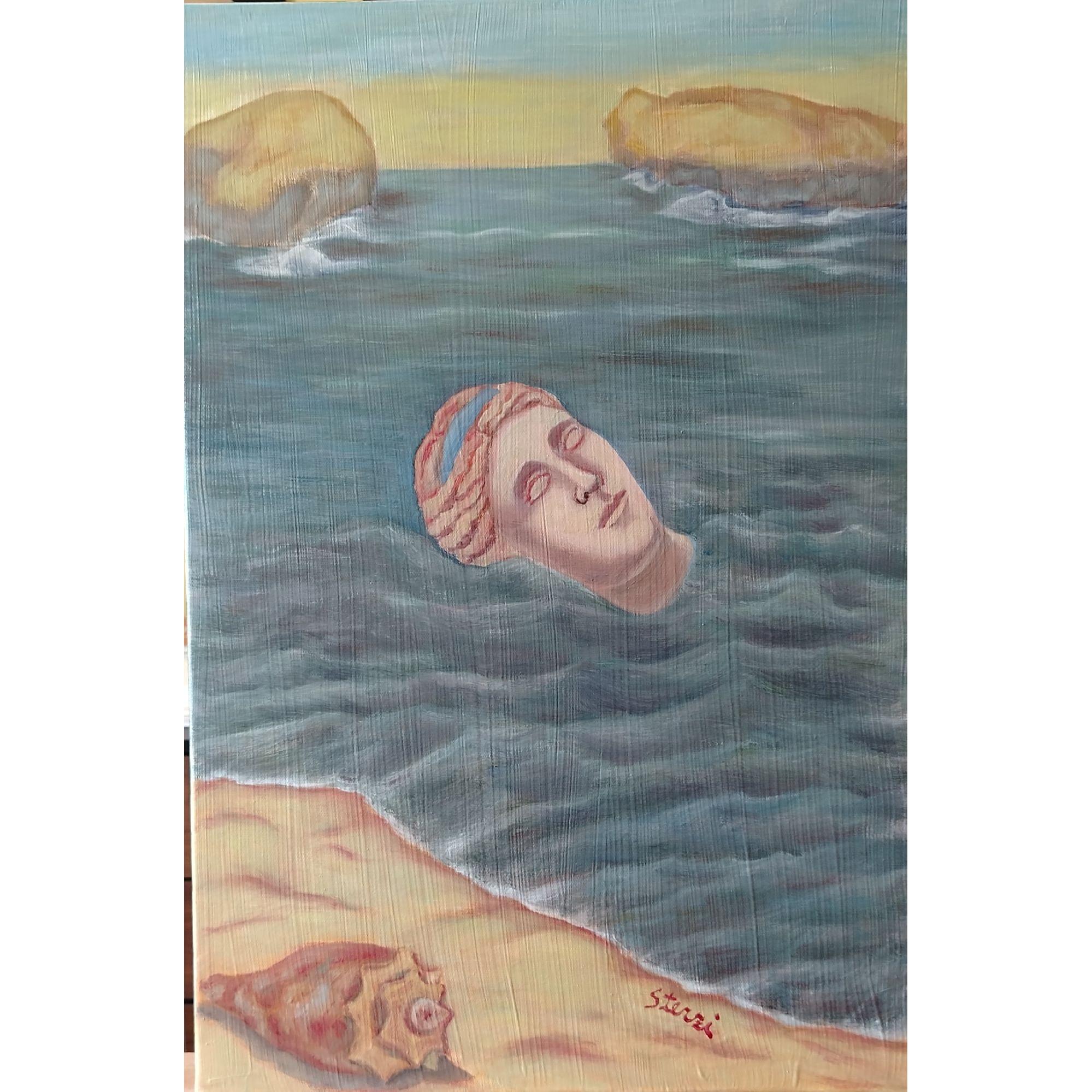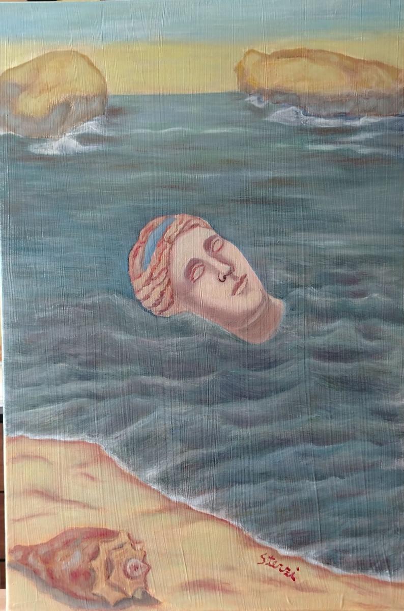 Un paesaggio marino dai toni accesi: parte del cielo e la sabbia si accendono di un giallo a tratti acidi, mentre il mare è composto da azzurri e verdi più sopiti. La testa greca che galleggia dolcemente sul pelo dell'acqua ci ricorda vagamente le composizioni del grande pittore spagnolo Salvador Dalì. La composizione è molto semplice: due rocce all'orizzonte creano un canale visivo che ci porta alla testa scolpita. Questa, a sua volta, ci rimanda ad una conchiglia, innaturalmente grande, che giace nell'angolo destro del dipinto. La tranquittità del paesaggio è attraversata da una sottile inquietudine.