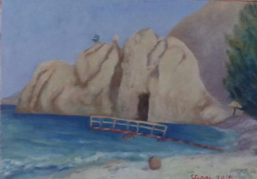 La spiaggia di Melinda è un pittoresco sito sull'isola di Lesbo, di non facile accessibilità. E' caratterizzato da una roccia imponente sita nel mare molto vicino alla riva. La tela è stata dipinta en plein air in una giornata estiva.
