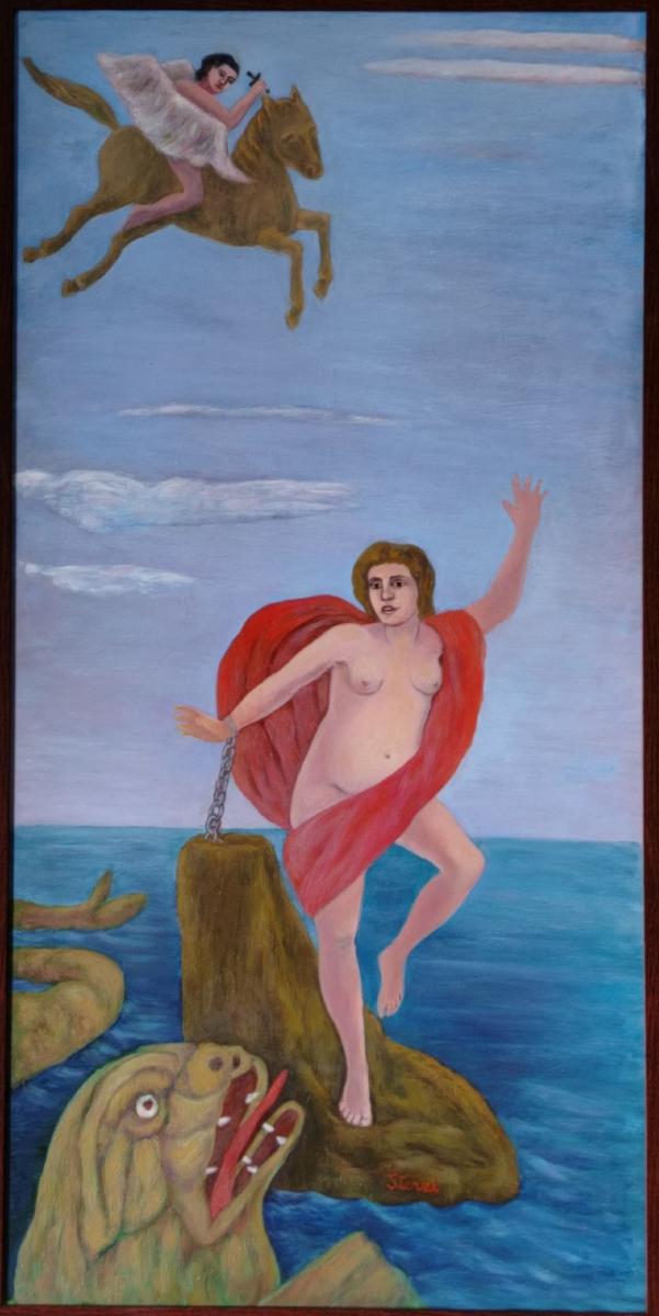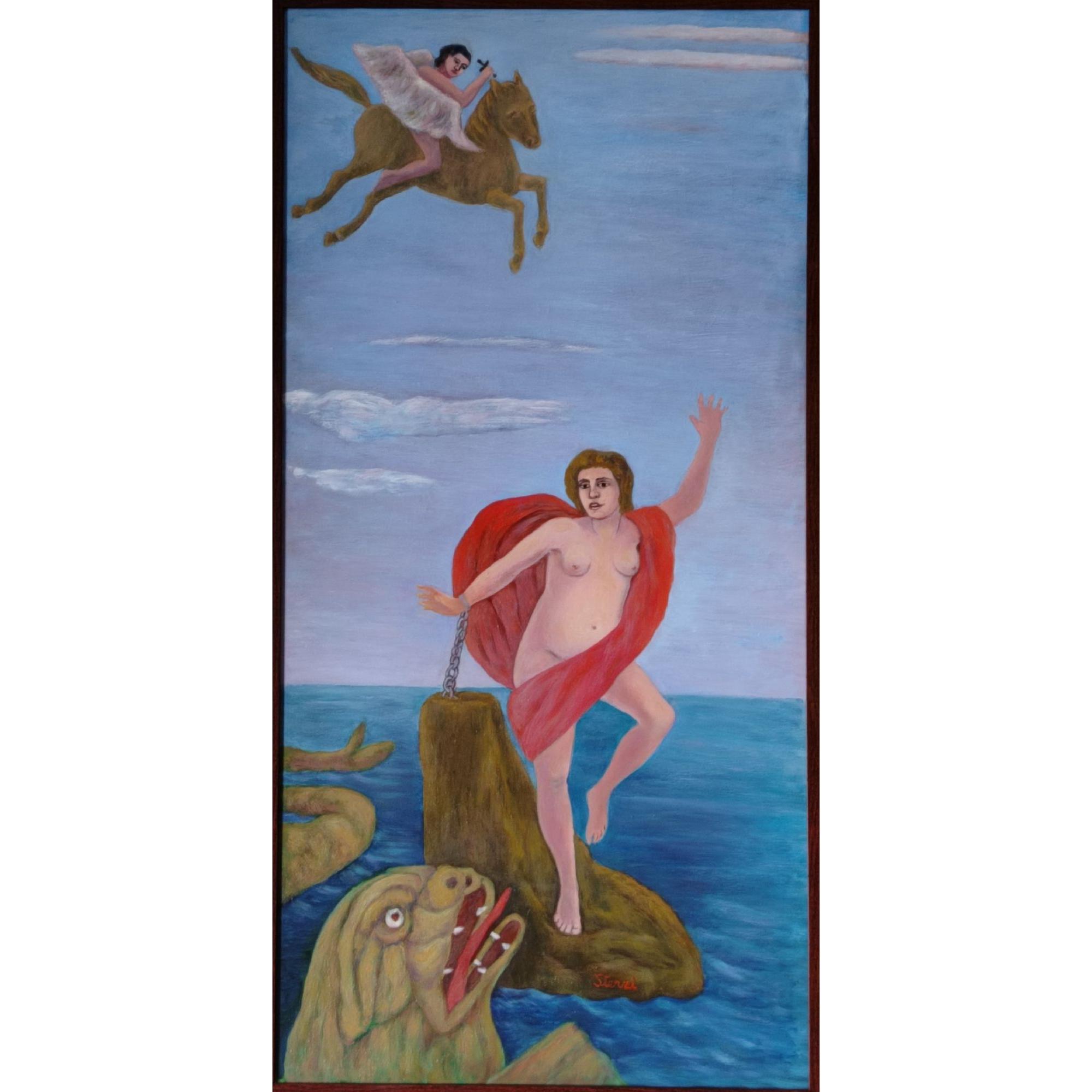 Perseo, l’eroe giovane e bello, accorre sul suo cavallo alatoe si ferma per soccorrere la giovane ed uccidere il mostro.