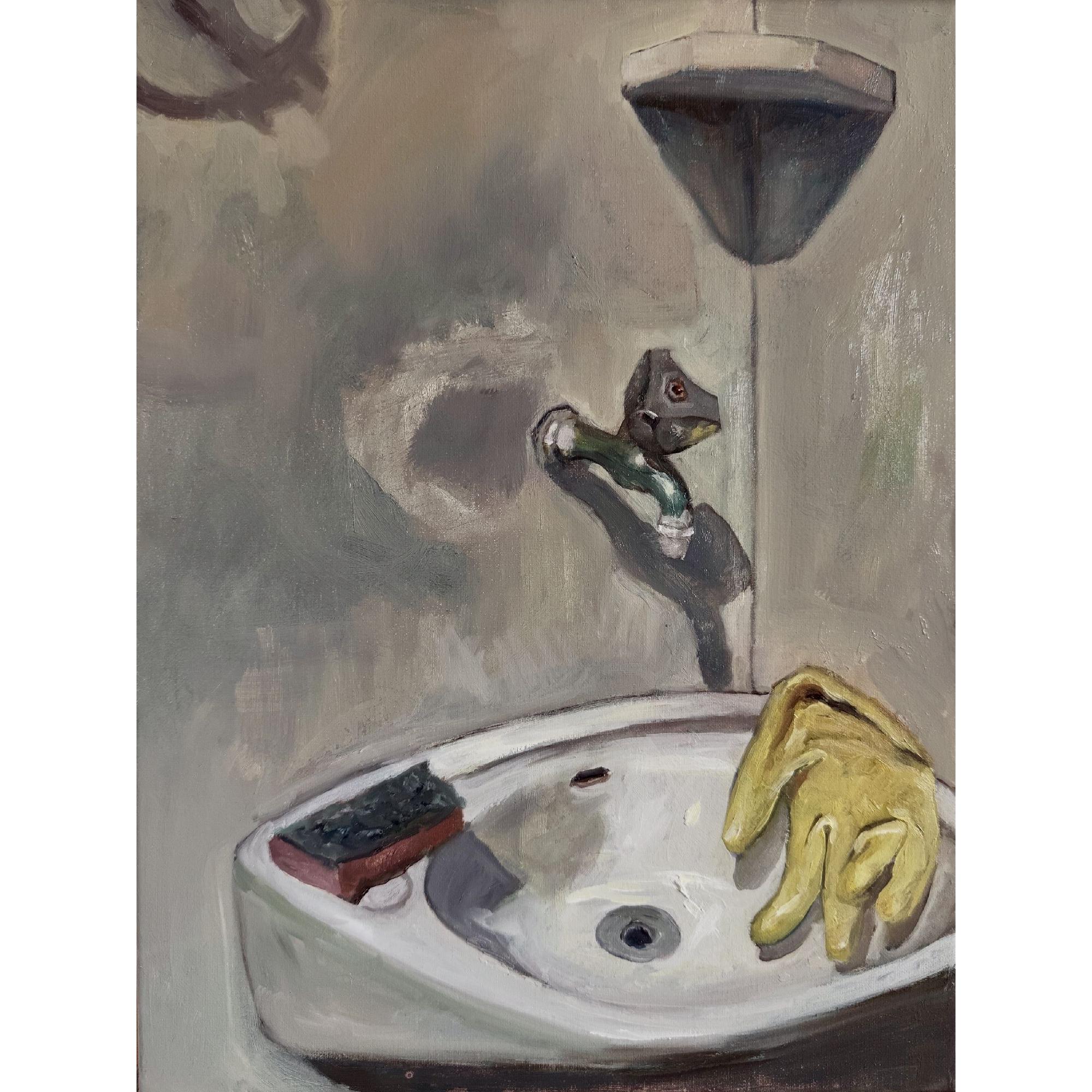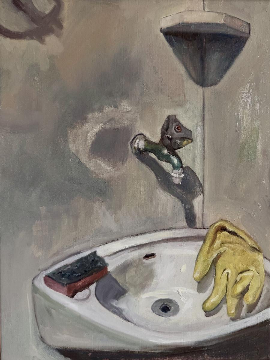 Una piccola scena domestica sospesa, dove un lavandino consumato, una spugna e un guanto di gomma giallo diventano indizi di un gesto appena interrotto. La pittura, con i suoi toni grigi e smorzati, trasforma l’ordinario in una sorta di silenzio narrativo: tutto è immobile, eppure vibra della presenza di chi se n’è andato un attimo prima. Un frammento di quotidiano che diventa memoria.