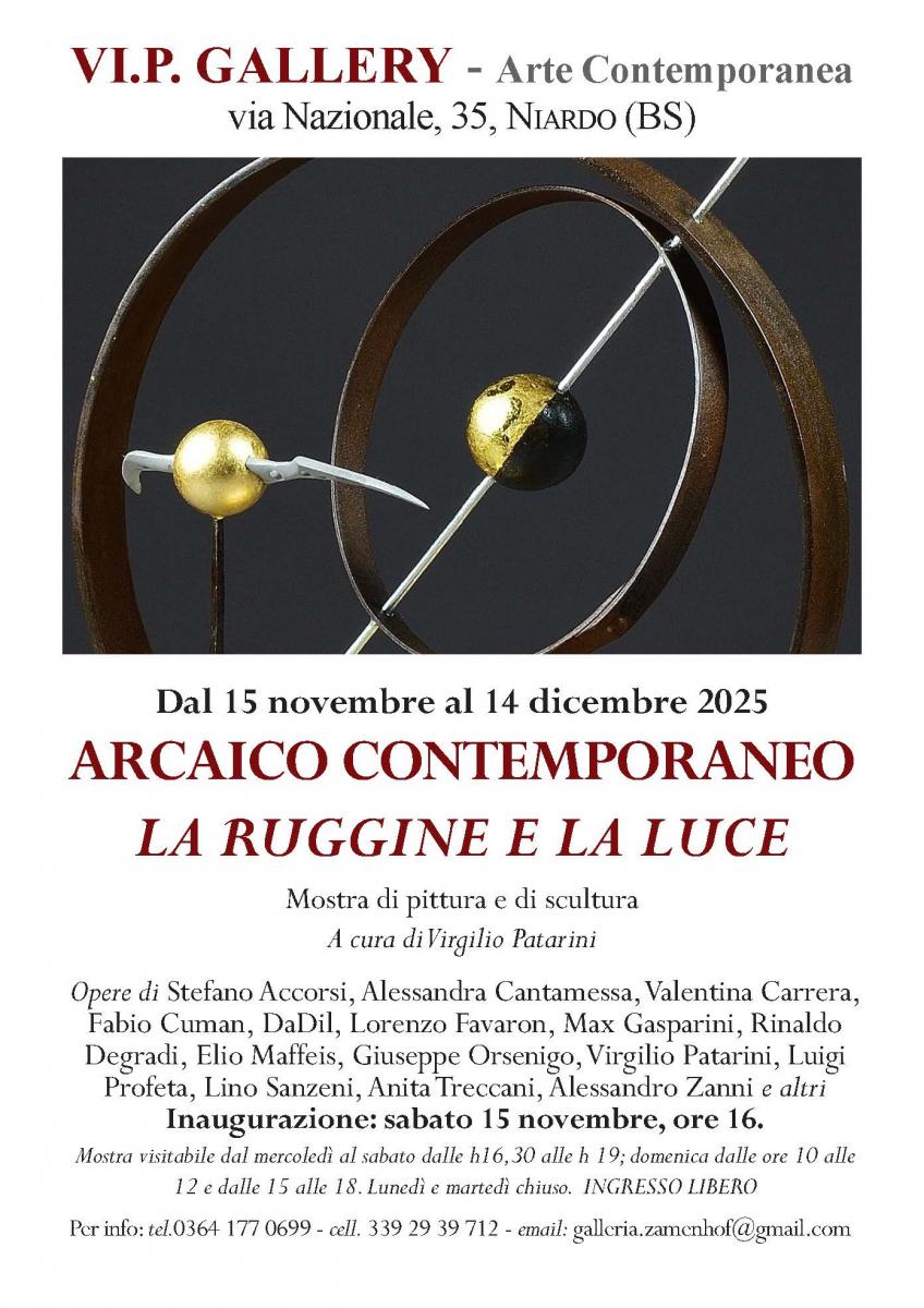 Dopo il successo di pubblico e di critica dei primi tre eventi, siinaugurasabato 15 novembre alle ore 16 alla Vi.P. Gallery Valcamonica, in viaNazionale, 35, a Niardo (BS) la prima mostratematica della stagione intitolata Arcaico Contemporaneo: la ruggine e la luce, una granderassegna di pittura e scultura che vede in mostra, nei 200 mq della galleriacamuna che si affaccia sulla Concarena, ottanta opere di quindici autori, in unequilibrato mix tra artisti affermati e giovani emergenti, con un’ampiarappresentanza bresciana e bergamasca, selezionati dal direttore artistico ecuratore Virgilio Patarini.