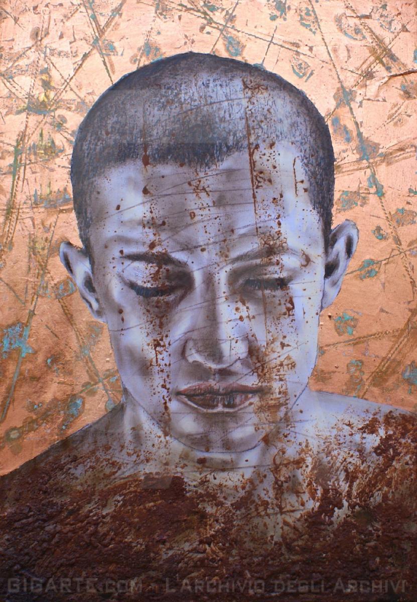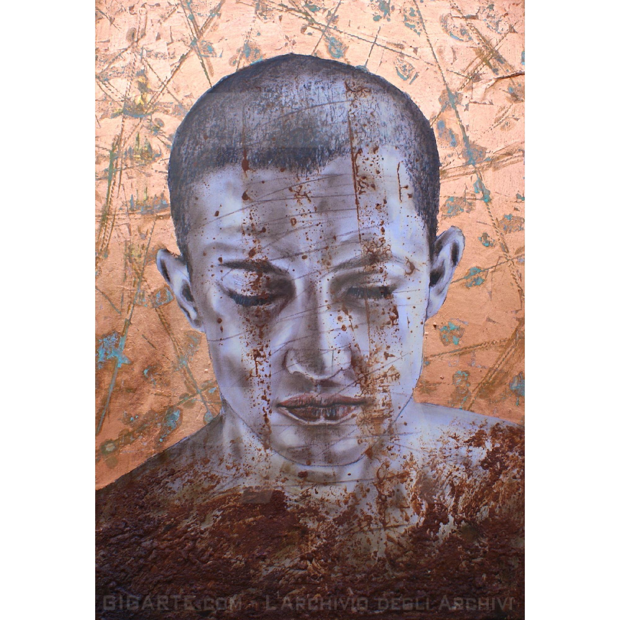 Opera eseguita in tecnica mista su carta telata con o terre e foglia rame