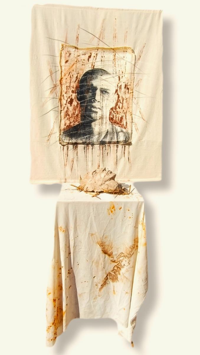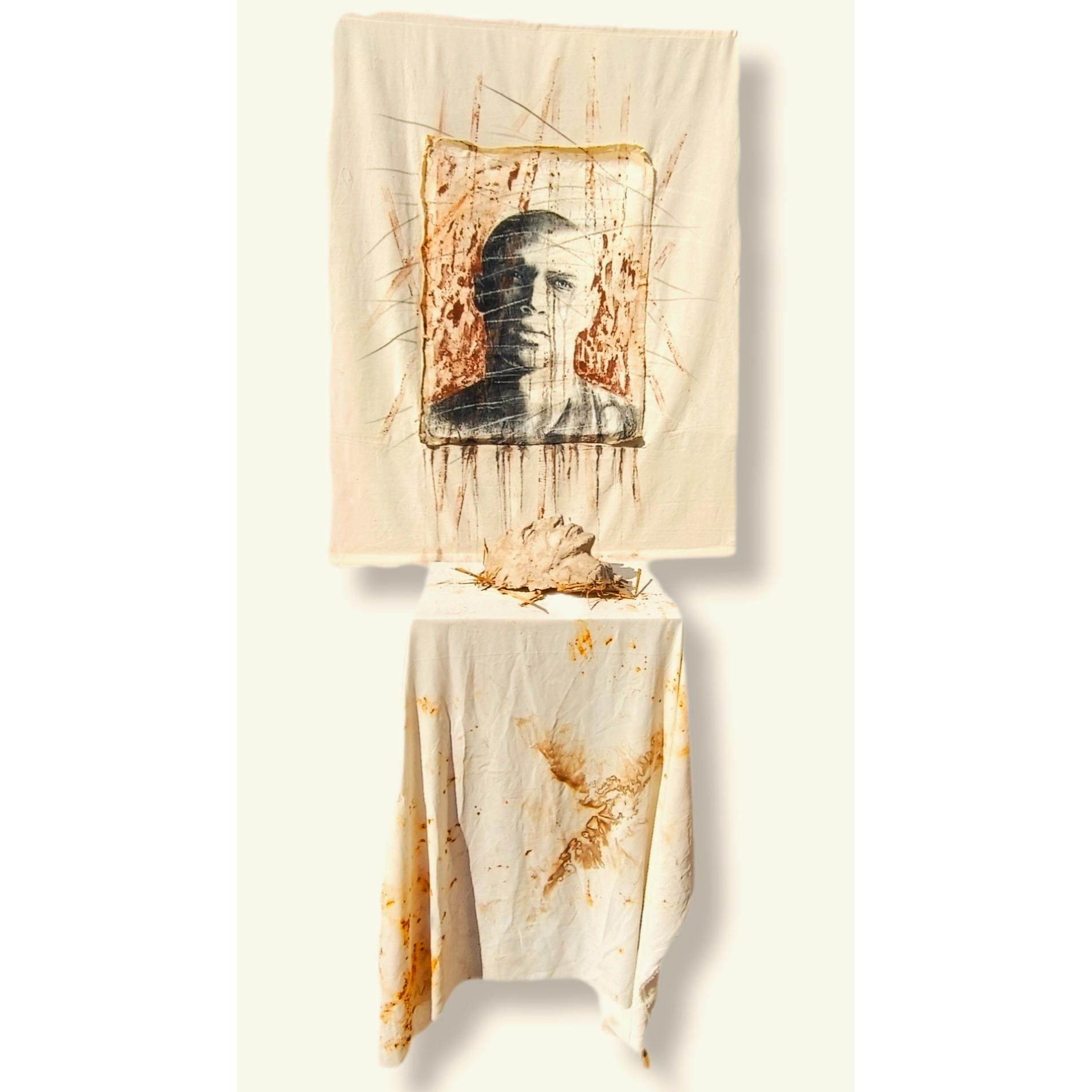 Installazione composta da: opera su tela eseguita in tecnica mista con terra e ossidazioni misure 116x150, tavolino h-cm100 con telo lavorato con ossidazioni, scultura raffigurante testa di un uomo eseguita con impasto cementizio colle e paglia misura 32x50.