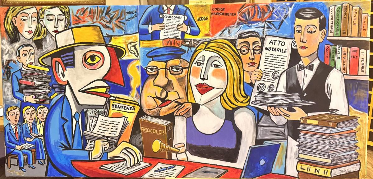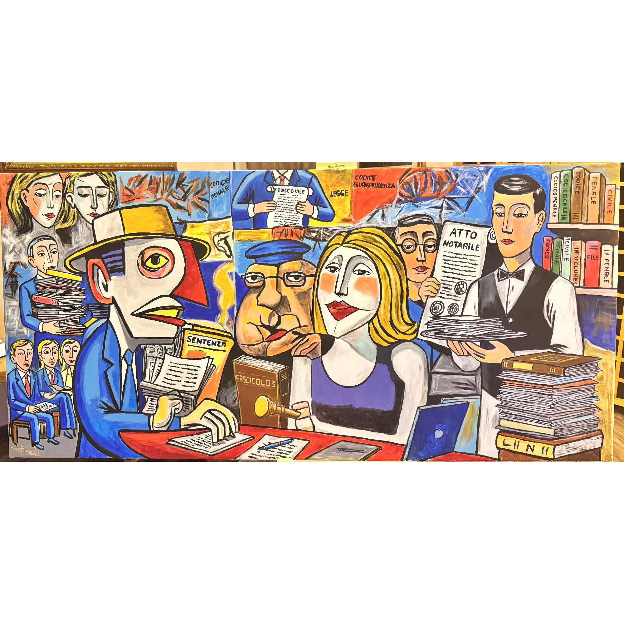 NEL NOME DELL’ATTESA è un opera intensa e attuale che racconta la giustizia attraverso i suoi simboli più forti : codici, fascicoli, sentenze e attese infinite. Una composizione potente , espressiva e ricca di significato, capace di trasformare un tema universale in un’immagine di grande forza narrativa ed emotiva.