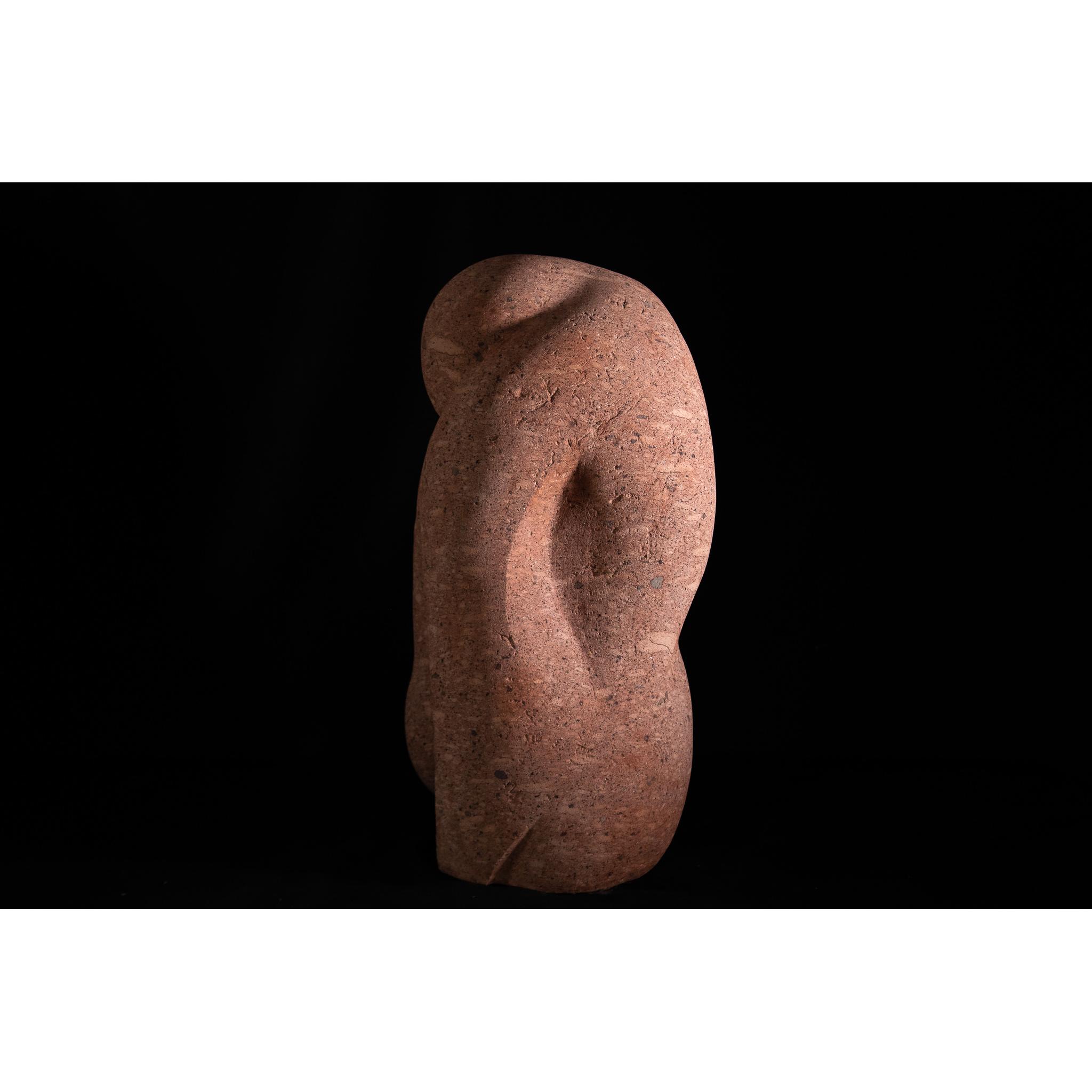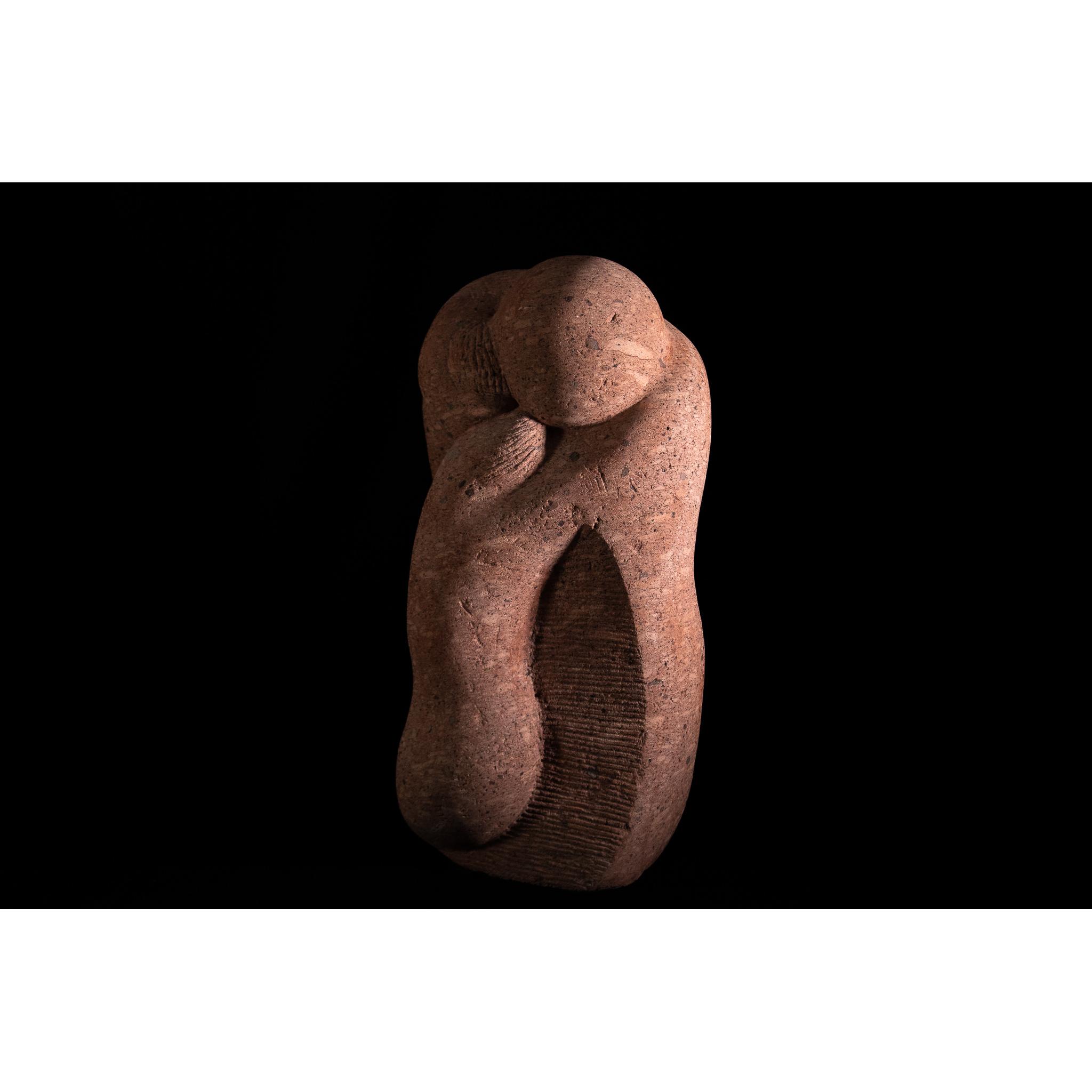 La trachite, scolpita interamente a mano, conserva tracce della gradina e delle raspe, che diventano parte integrante della sua espressività. Le superfici spigolose e le sue concavità profonde generano ombre mutevoli, evocando il tormento e la fragilità dell’unione umana.