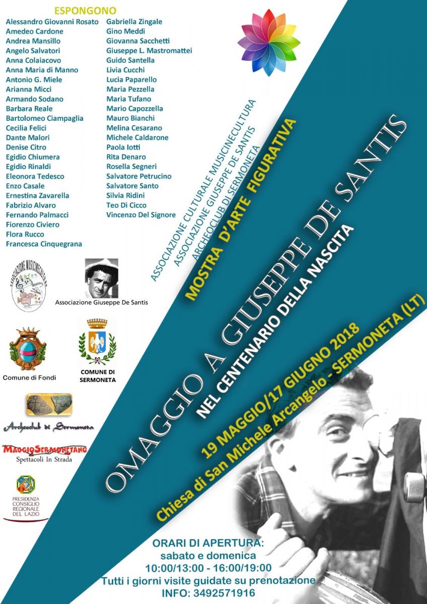 L’Associazione culturale Musicine Cultura e l’Associazione Giuseppe De Santis, in collaborazione con l'Archeoclub Sermoneta e con il patrocinio del Comune di Fondi, del Comune di Sermoneta e della Regione Lazio, presenterà la mostra d'arte 'Omaggio a Giuseppe De Santis nel centenario della nascita' che verrà allestita dal 19 maggio al 17 giugno 2018 presso la Chiesa di San Michele Arcangelo di Sermoneta (LT).