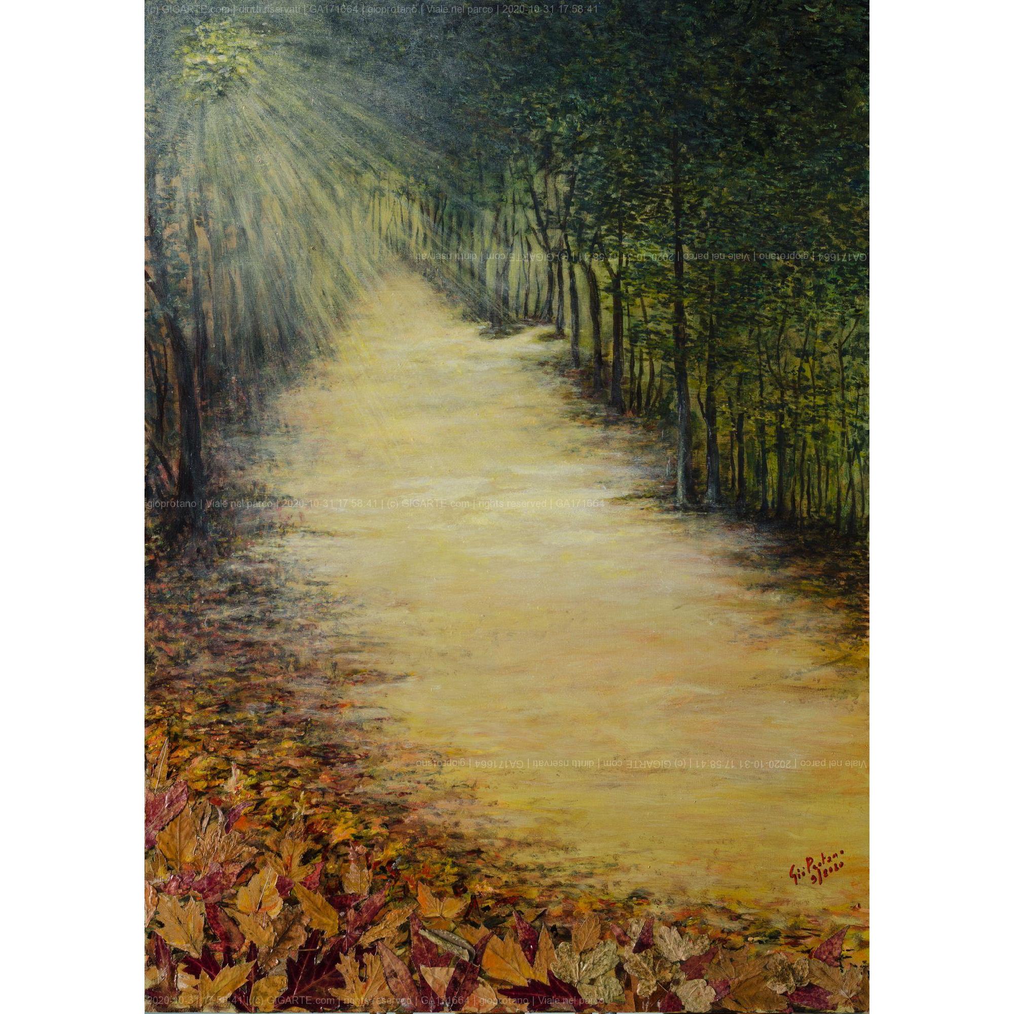 Quest'opera è stata eseguita con la seguente metodologia: -ricerca di un soggetto, di una veduta che potesse riproporre un ambiente "autunnale"; -eseguite alcune foto con varie prospettive; -rielaborate al computer per ottenere con varie inquadrature, il soggetto desiderato; -schizzato schematicamente su foglio A4 e poi riportato su altro foglio (grigio 30x40) riformulando i colori con tempera e pennarelli; -definita la dimensione finale, esecuzione del qudro con acrilici e innesti di vere foglie secche. Accompagnato da fscicolo descrittivo delle varie fasi di esecuzione. Il soggetto raffigura un viale sterrato nel "Parco comunale Villa Borromeo" della città di Arcore.
