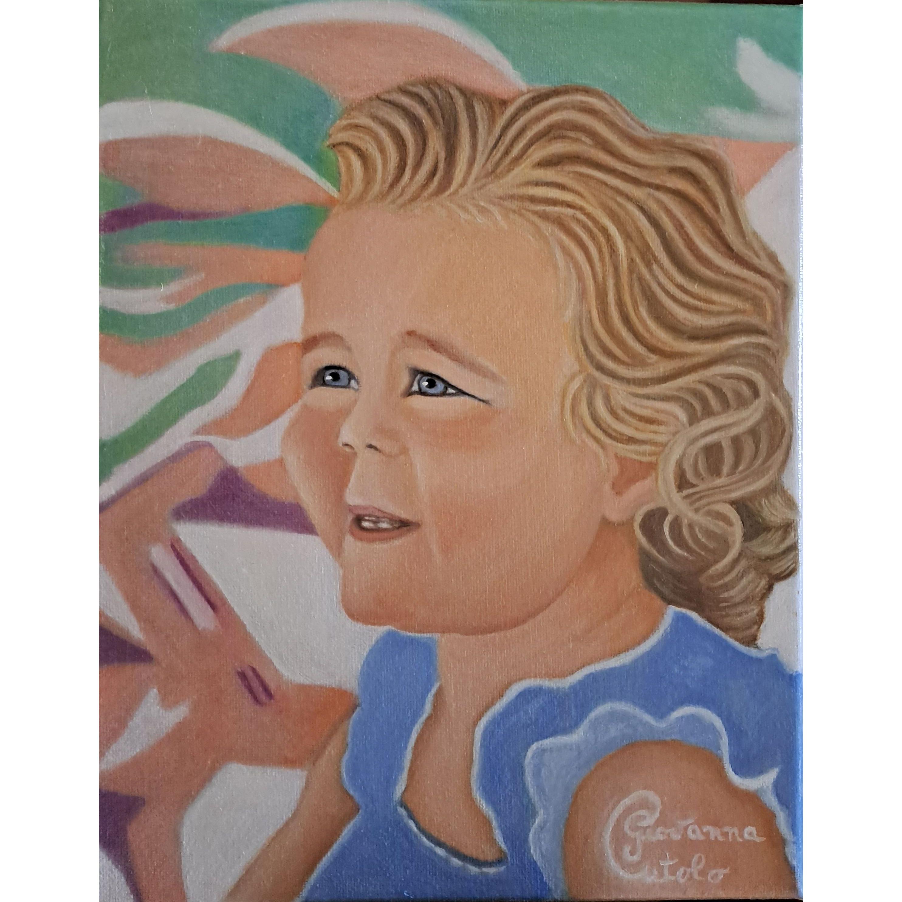 Tratto da una foto di Miain spiaggia. Lo sfondo è la riproduzione dell’immagine sfuocata dellaspiaggia dove la sabbia, le sedie asdraio, gli ombrelloni e i giocattoli diventano solo macchie di colore per darerisalto al ritratto di Mia.