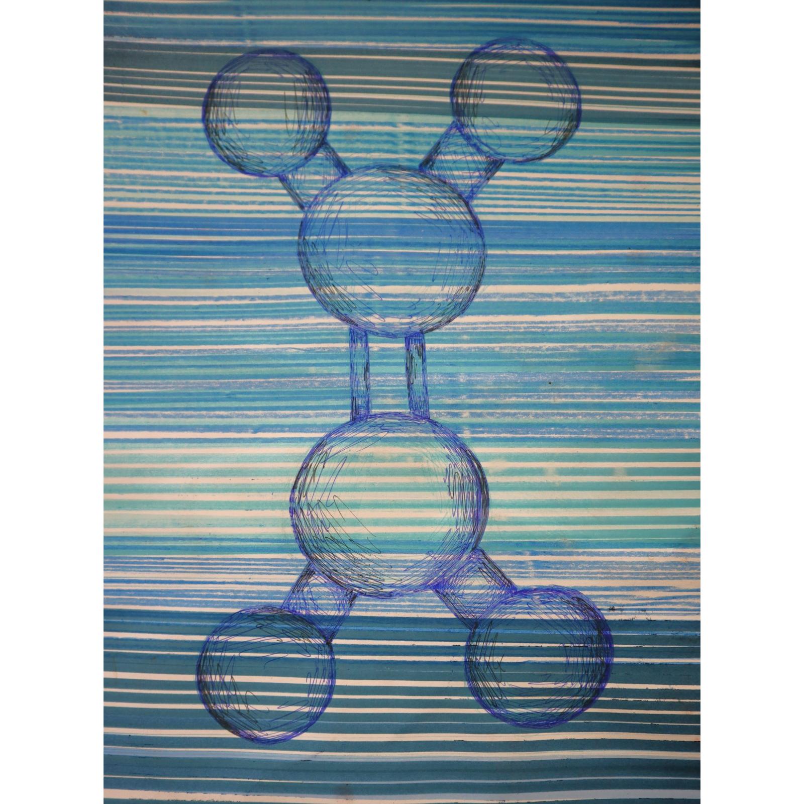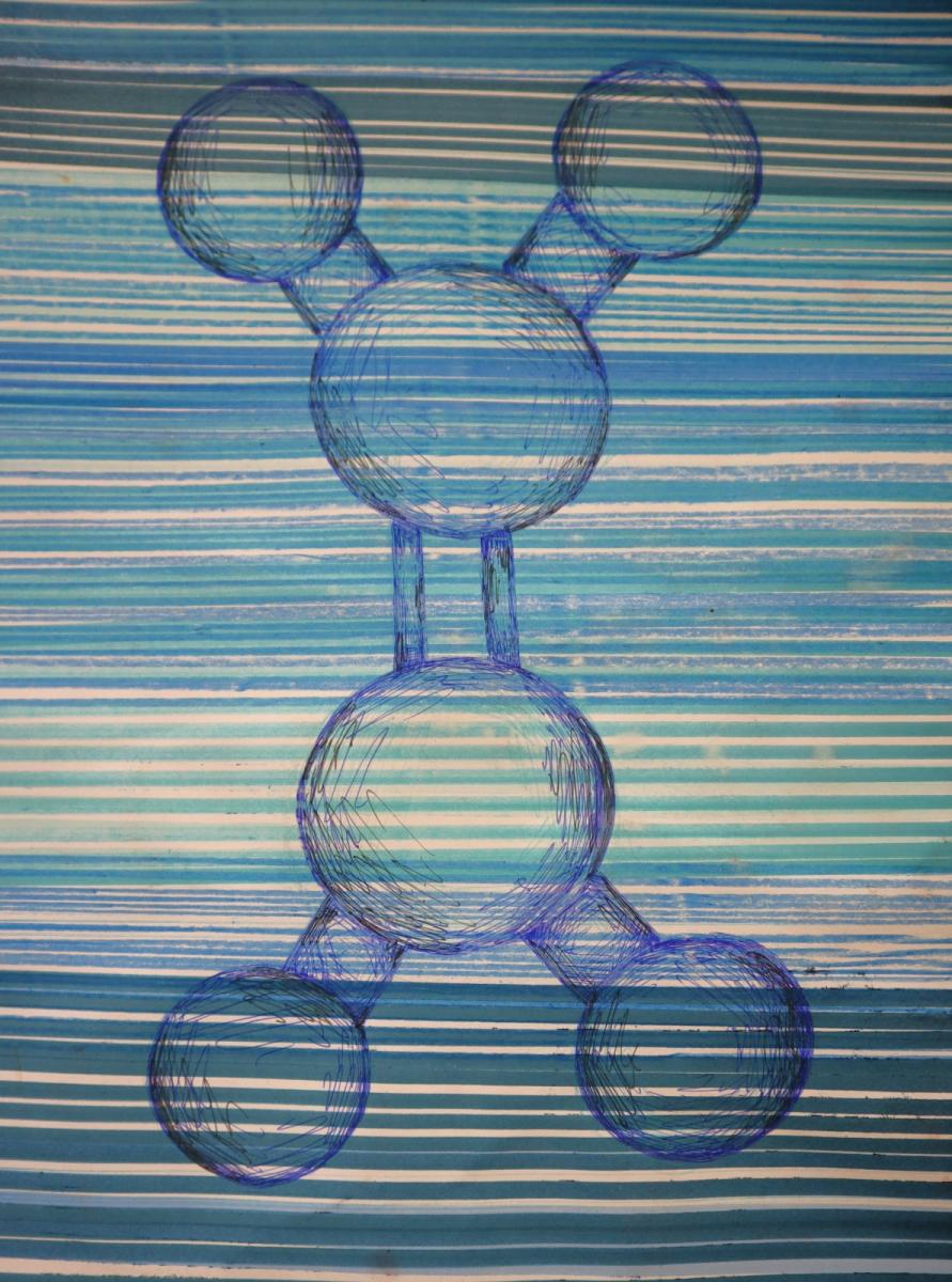 Illustrazione in formato A3 su carta 160 grammi di una molecola rappresentata con modello "ad asta e sfera". Reattiva al calore