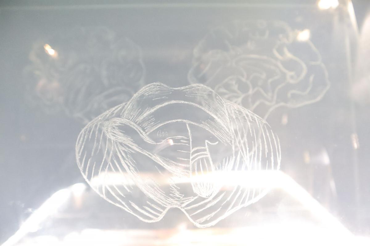 Incisione di cervelletto, emisfero destro ed emisfero sinistro su smart glass. L'opera scompare al passaggio di corrente elettrica.