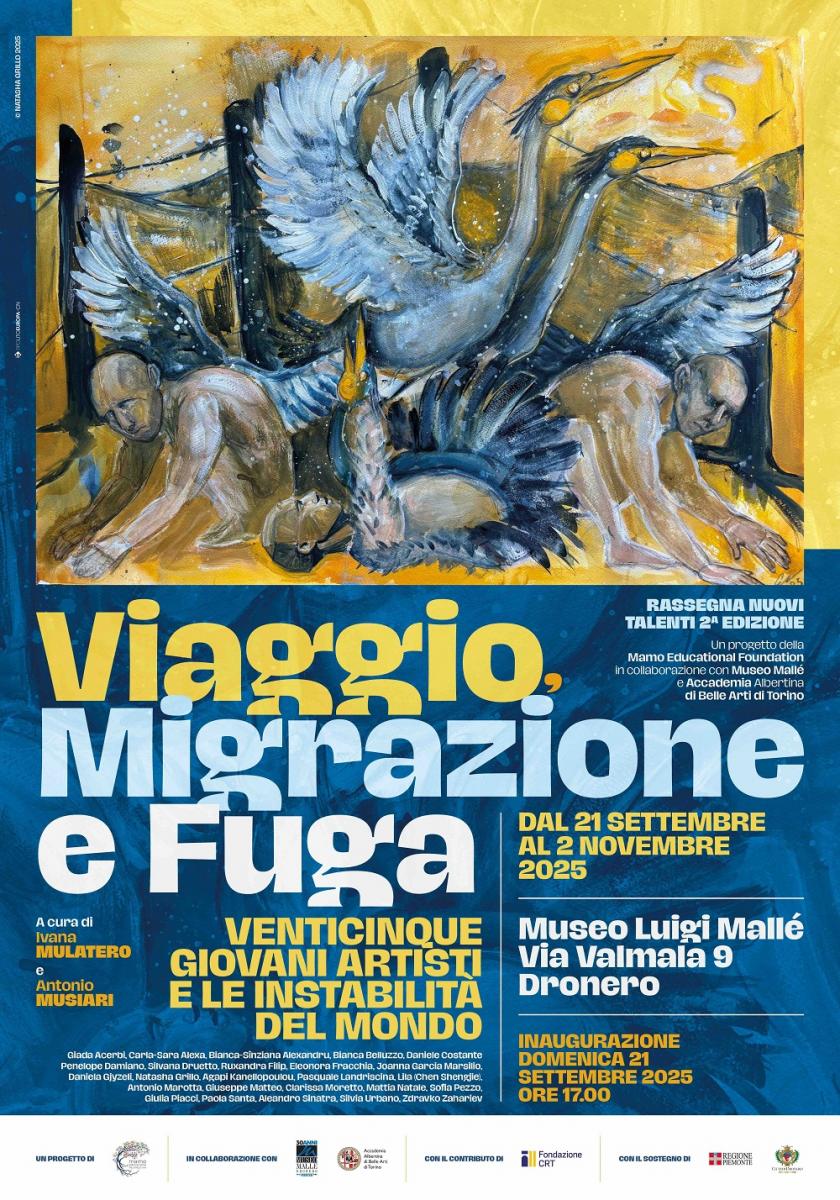 Il viaggio, inteso anche come migrazione e fuga, è il tema proposto a venticinque giovani artisti che hanno realizzato le loro opere appositamente per questa mostra. Le opere d'arte contemporanea, prevalentemente dipinti, esplorano questioni sempre vive e ancor oggi di grande attualità: attingono a quello che accade oggi o a visioni interiori, al reale come all'immaginario. I venticinque giovani artisti che, in questa esposizione, esplorano l'instabilità del mondo, sono: Giada Acerbi, Carla-Sara Alexa, Bianca-Sînziana Alexandru, Bianca Belluzzo, Daniele Costante, Penelope Damiano, Silvana Druetto, Ruxandra Filip, Eleonora Fracchia, Joanna Garcia Marsilio, Daniela Gjyzeli, Natasha Grillo, Agapi Kanellopoulou, Pasquale Landriscina, Lila (Chen Shengjie), Antonio Marotta, Giuseppe Matteo, Clarissa Moretto, Mattia Natale, Sofia Pezzo, Giulia Piacci, Paola Santa, Aleandro Sinatra, Silvia Urbano, Zdravko Zahariev. La mostra è allestita per la seconda edizione del programma Nuovi Talenti: questo programma, nato dalla convenzione tra il Museo Mallé e la Mamo Educational Foundation ETS, intende sviluppare le opportunità di promozione della persona, attraverso i linguaggi dellarte contemporanea, per l'accrescimento culturale e sociale. Nel progetto si è inserita con naturalezza lAccademia Albertina di Belle Arti di Torino, Istituto di Alta Cultura che forma giovani alle discipline artistiche dal 1678. Mostra a cura di Ivana Mulatero e Antonio Musiari. Visite infrasettimanali solo su prenotazione per gruppi e scuole: da lunedì a venerdì dalle 9.00 alle 13.00 e dalle 14.00 alle 17.30 scrivendo a museo.malle@comune.dronero.cn.it Per info: museo.malle@comune.dronero.cn.itMostra realizzata con il contributo della Fondazione CRT e con il sostegno del Comune di Dronero La mostra è inoltre un'occasione per visitare le collezioni e gli ambienti del Museo civico Luigi Mallé: una casa museo dove sono allestite le raccolte d'arte dell'insigne storico e critico Luigi Mallé (Torino 1920 1979) che fu direttore dei Musei Civici di Torino dal 1966 al 1973.