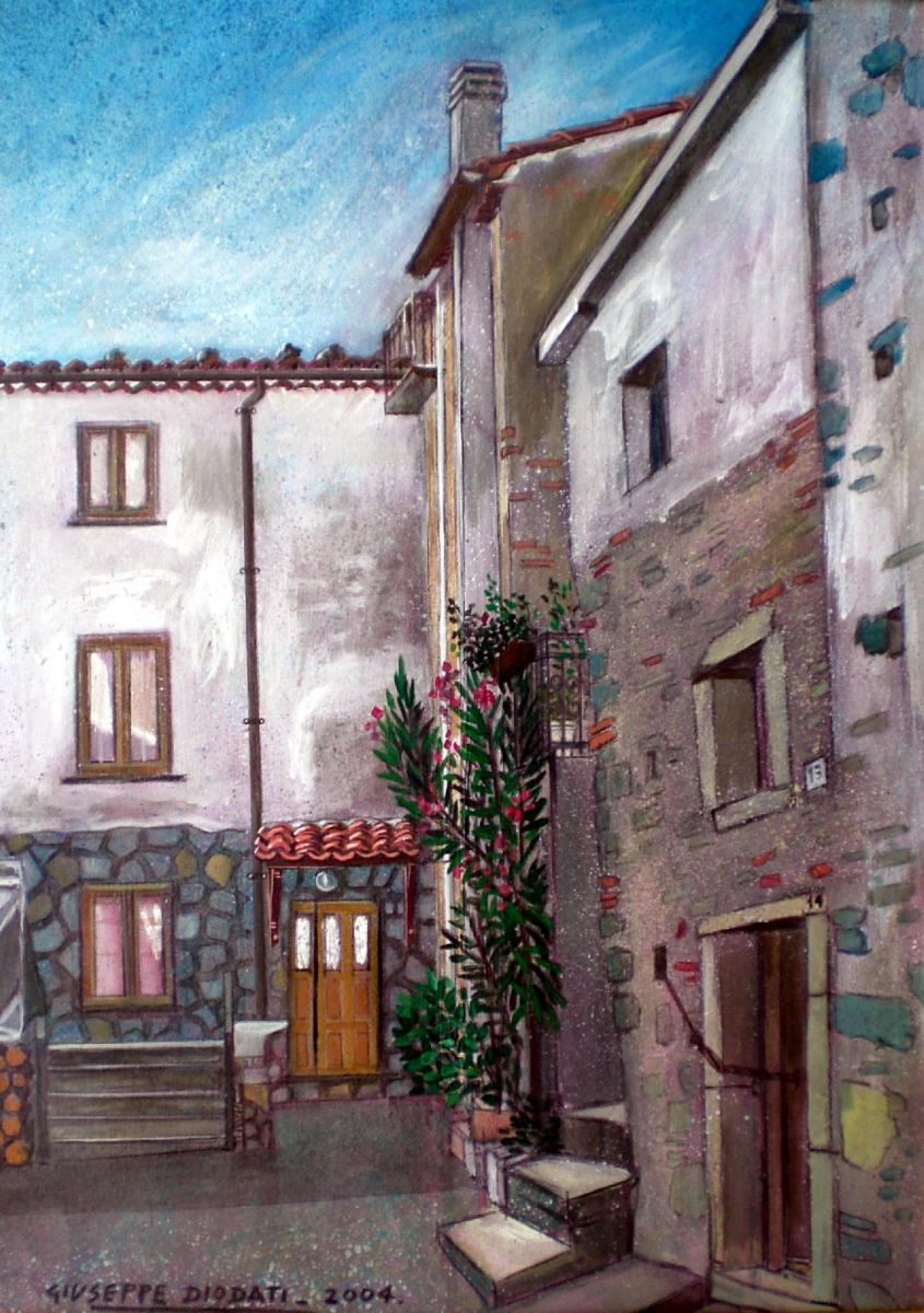 "Angolo di case di San Fili (CS)", tecnica mista su tela cm. 50x70, Anno 2004.