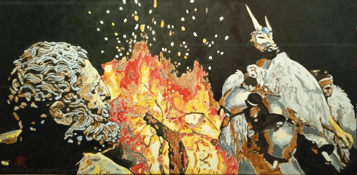 Apollineo e dionisiaco, ovvero ciò che ancora sopravvive in Sardegna dei riti ancestrali pagani. Le maschere tradizionali del carnevale barbaricino rappresentano il dionisiaco nella forma duale e conflittuale uomo-animale, caratterizzata da eccessi, passioni sfrenate e conflitti, mentre la figura barbuta che le osserva rimanda ai modelli classici e, proprio in virtù di questo legame, incarna ciò che in quel mando rappresenta l'apollineo, ovvero l'ordine, la misura e l'armonia.