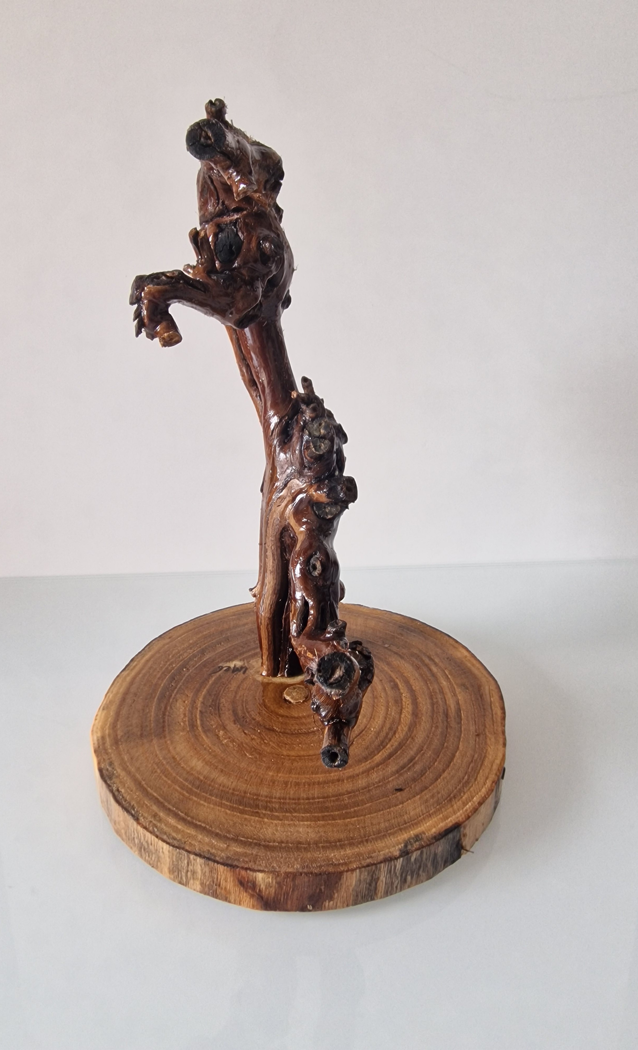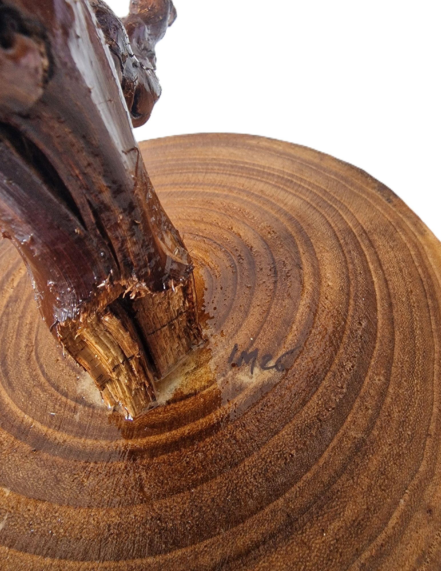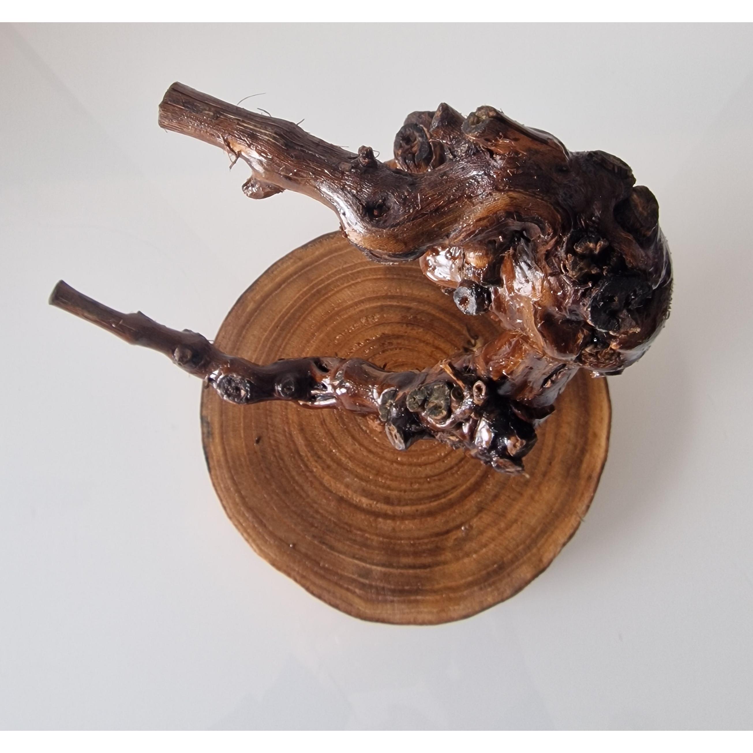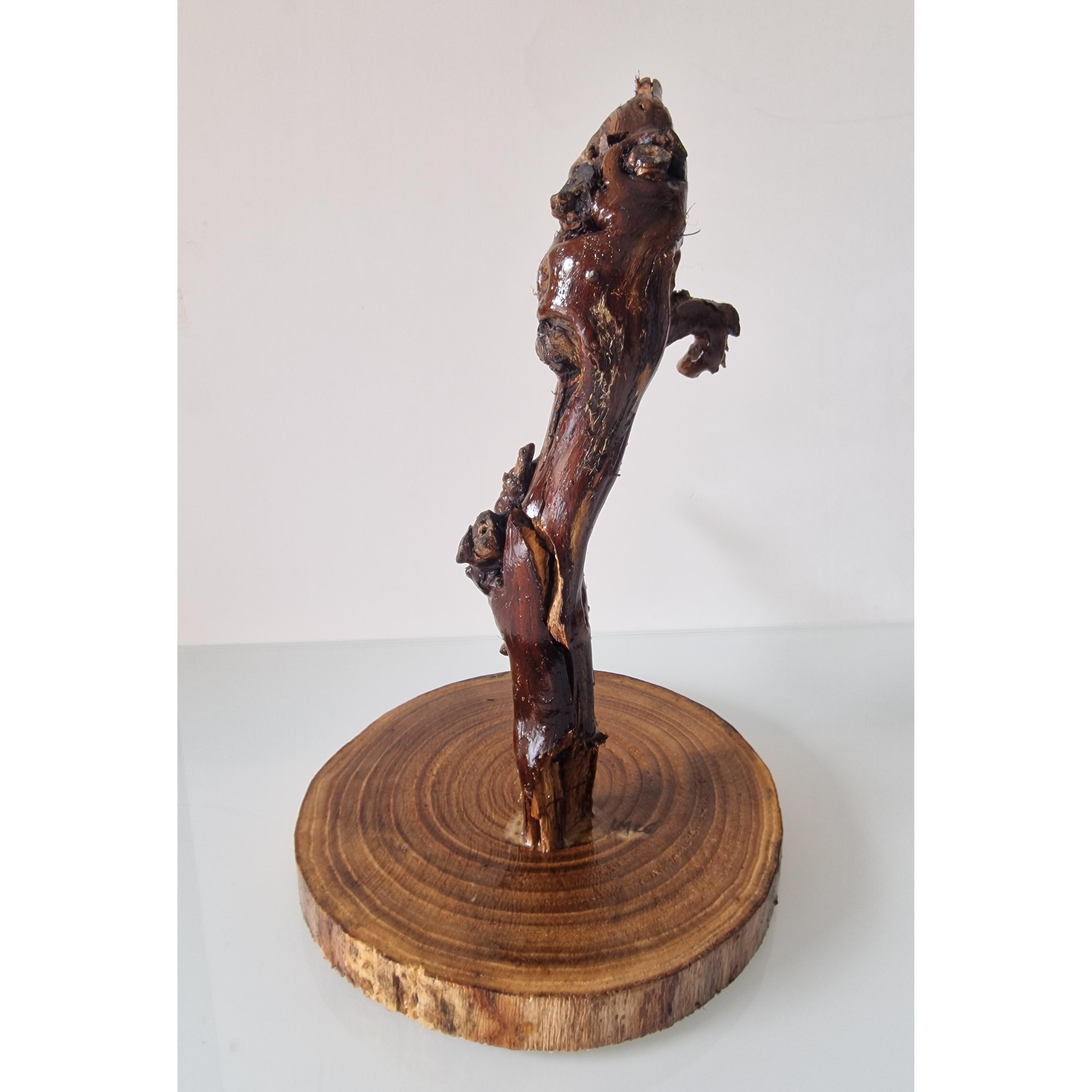 Questa scultura di Michele Imperiale cattura l'essenza della natura attraverso un elemento ligneo sinuoso e contorto. La forma organica, ricca di nodi e protuberanze, si erge con una finitura lucida che ne esalta il profondo marrone e le intricate texture. Le ramificazioni si estendono con grazia, creando un movimento dinamico. L'opera è saldamente ancorata a una base circolare in legno chiaro, dove le venature concentriche offrono un contrasto materico e cromatico, celebrando la bellezza intrinseca del materiale naturale.