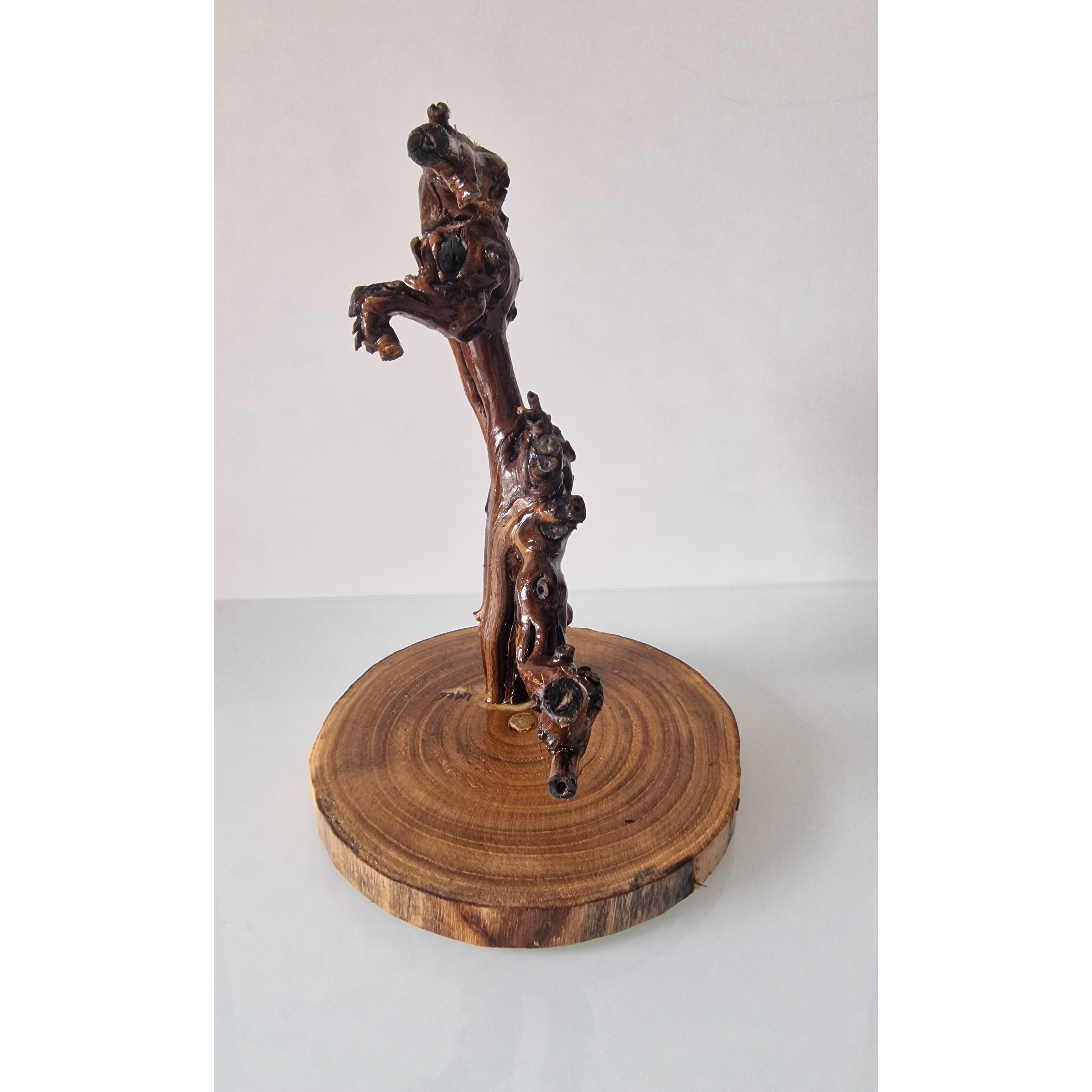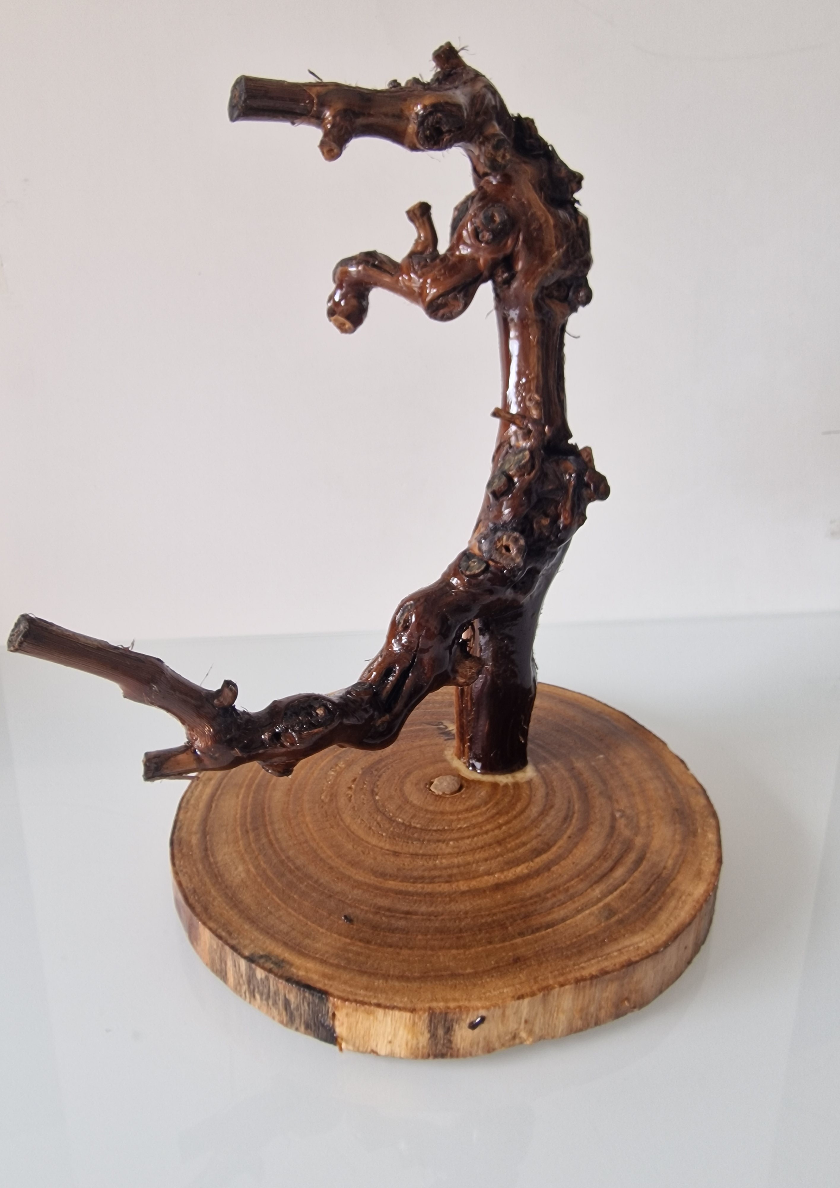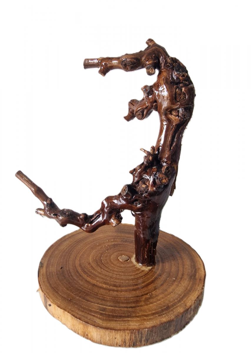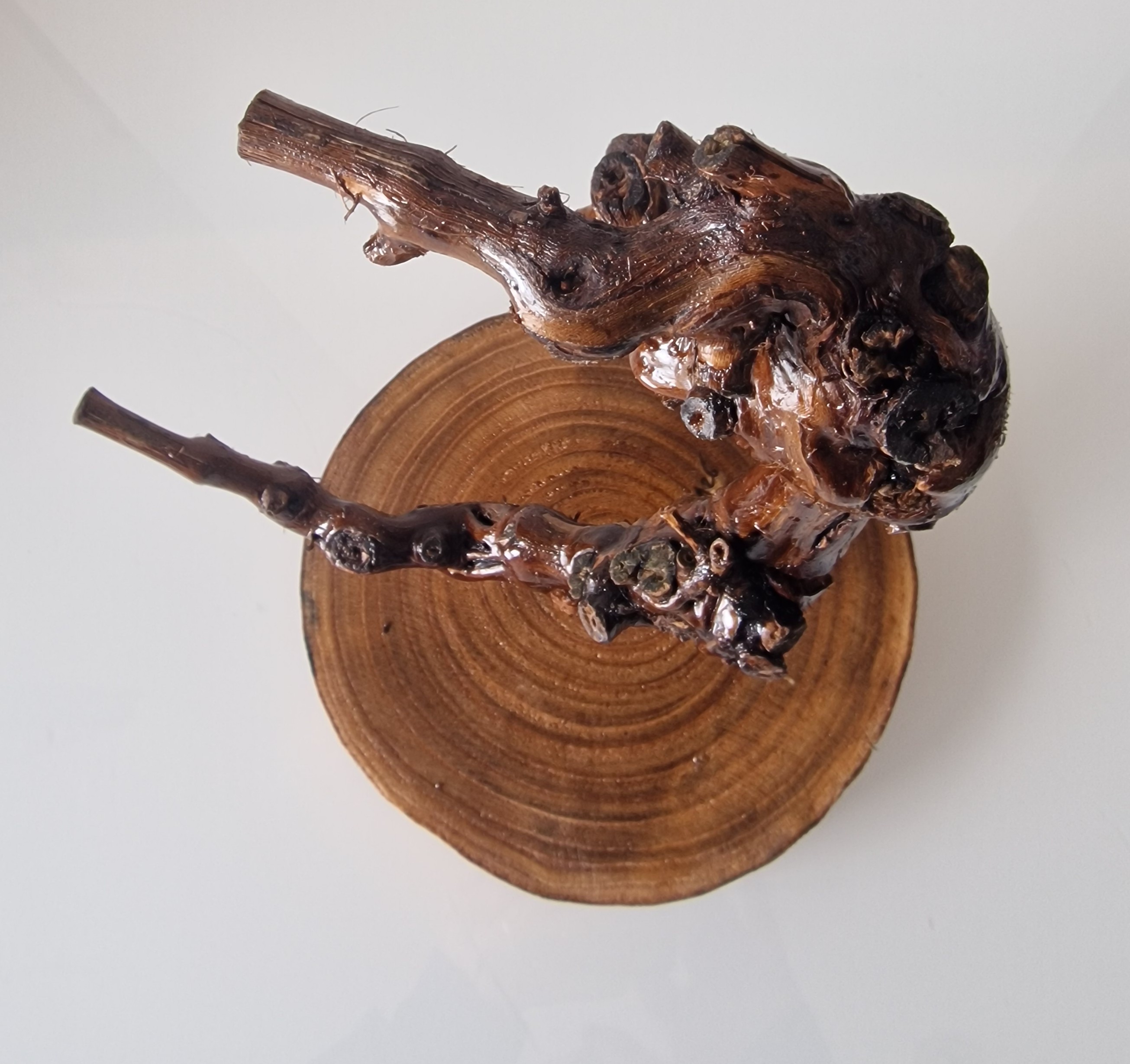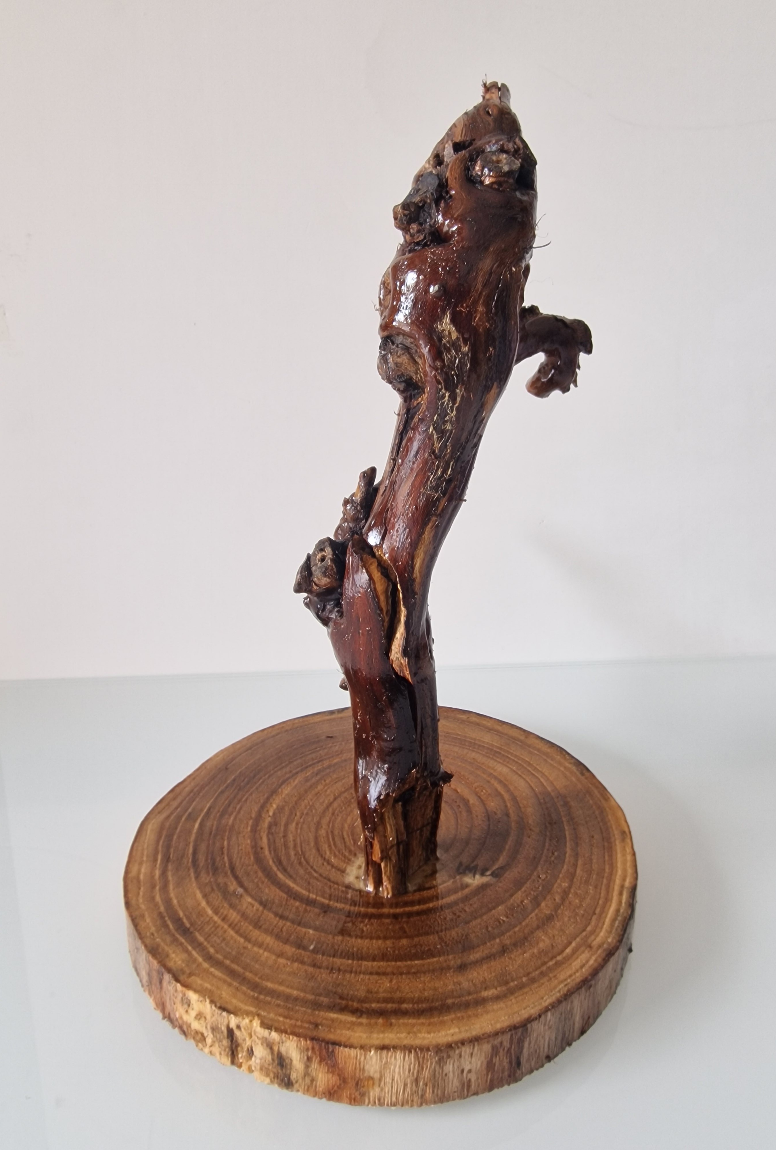 Questa scultura di Michele Imperiale cattura l'essenza della natura attraverso un elemento ligneo sinuoso e contorto. La forma organica, ricca di nodi e protuberanze, si erge con una finitura lucida che ne esalta il profondo marrone e le intricate texture. Le ramificazioni si estendono con grazia, creando un movimento dinamico. L'opera è saldamente ancorata a una base circolare in legno chiaro, dove le venature concentriche offrono un contrasto materico e cromatico, celebrando la bellezza intrinseca del materiale naturale.