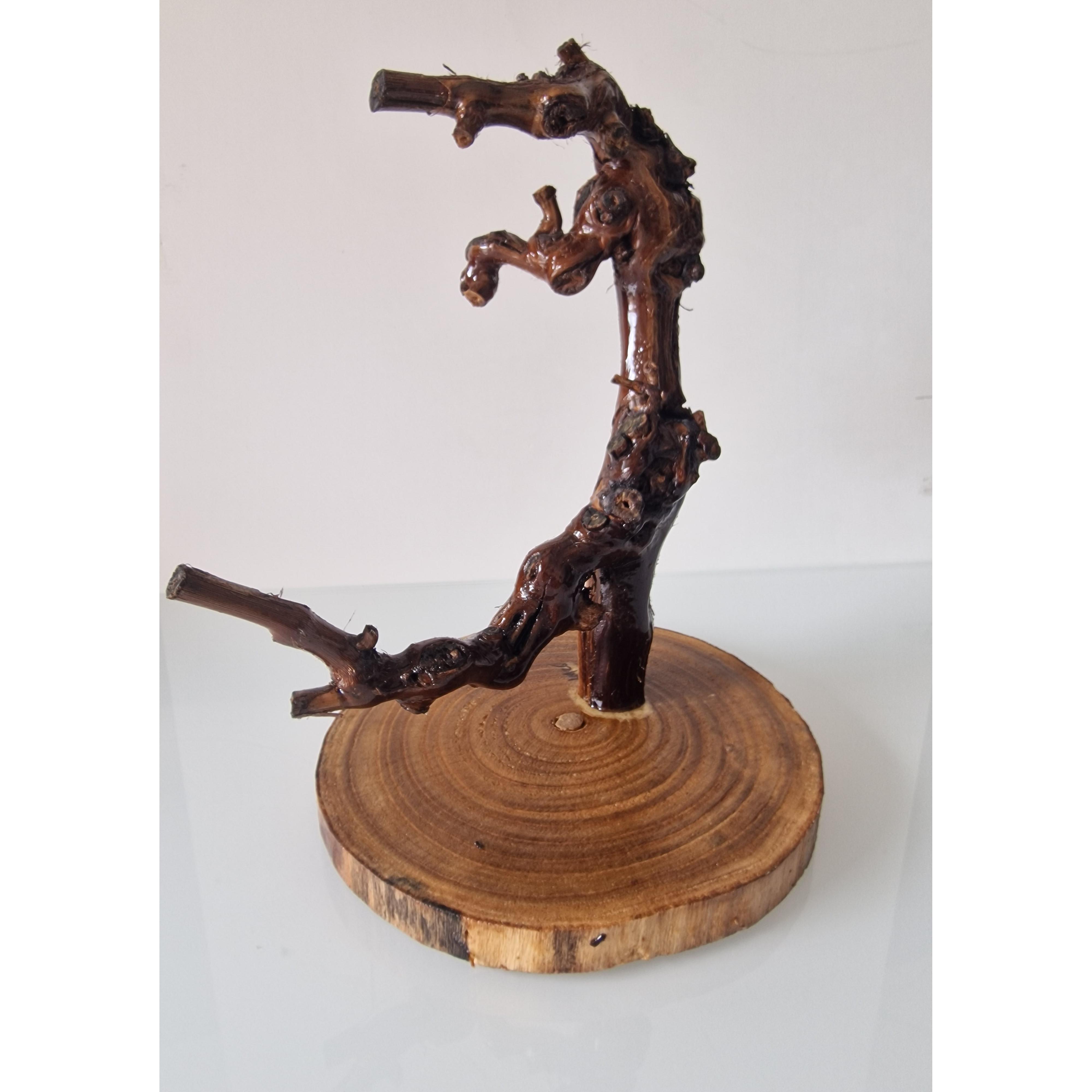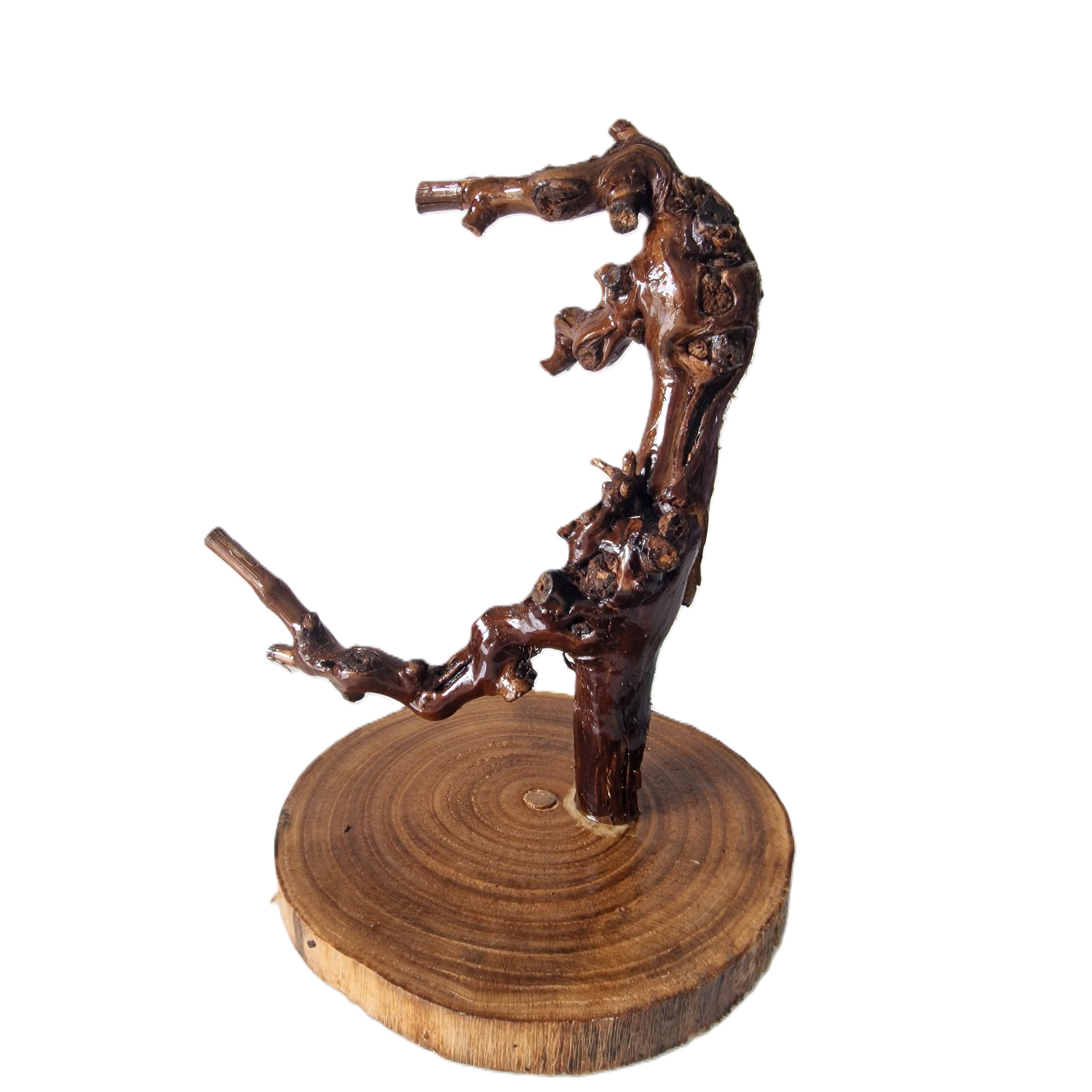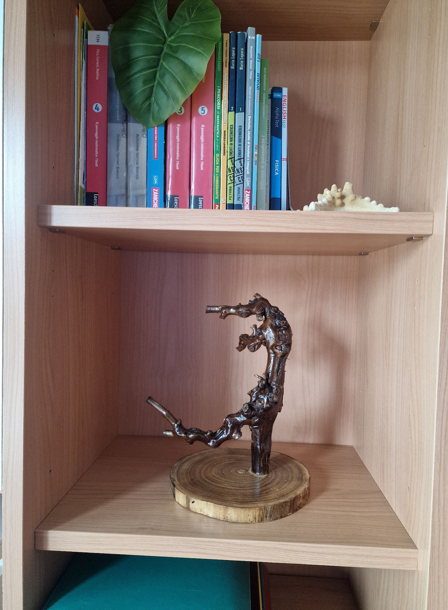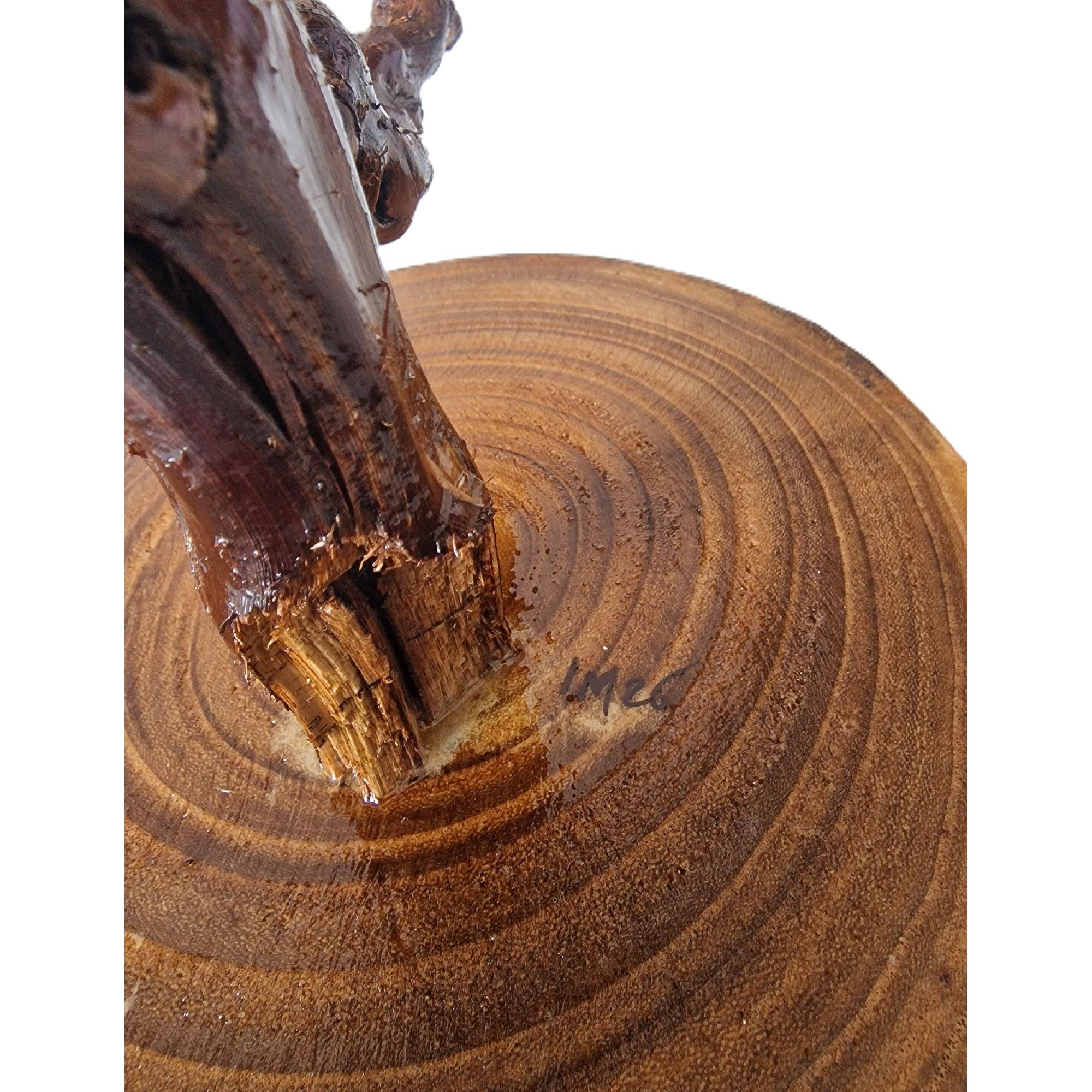 Questa scultura di Michele Imperiale cattura l'essenza della natura attraverso un elemento ligneo sinuoso e contorto. La forma organica, ricca di nodi e protuberanze, si erge con una finitura lucida che ne esalta il profondo marrone e le intricate texture. Le ramificazioni si estendono con grazia, creando un movimento dinamico. L'opera è saldamente ancorata a una base circolare in legno chiaro, dove le venature concentriche offrono un contrasto materico e cromatico, celebrando la bellezza intrinseca del materiale naturale.