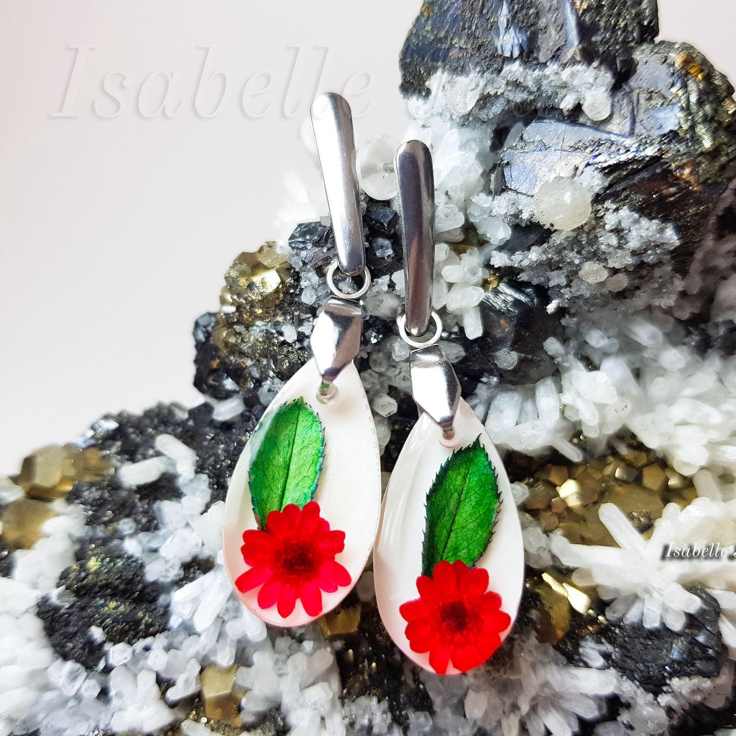 Particolari orecchini pendenti, realizzati con fiori rossi e foglie cristallizzate nella resina.