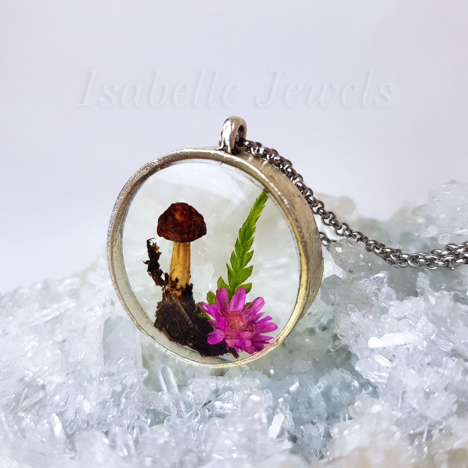 Collana in resina epossidica trasparente con elementi botanici.