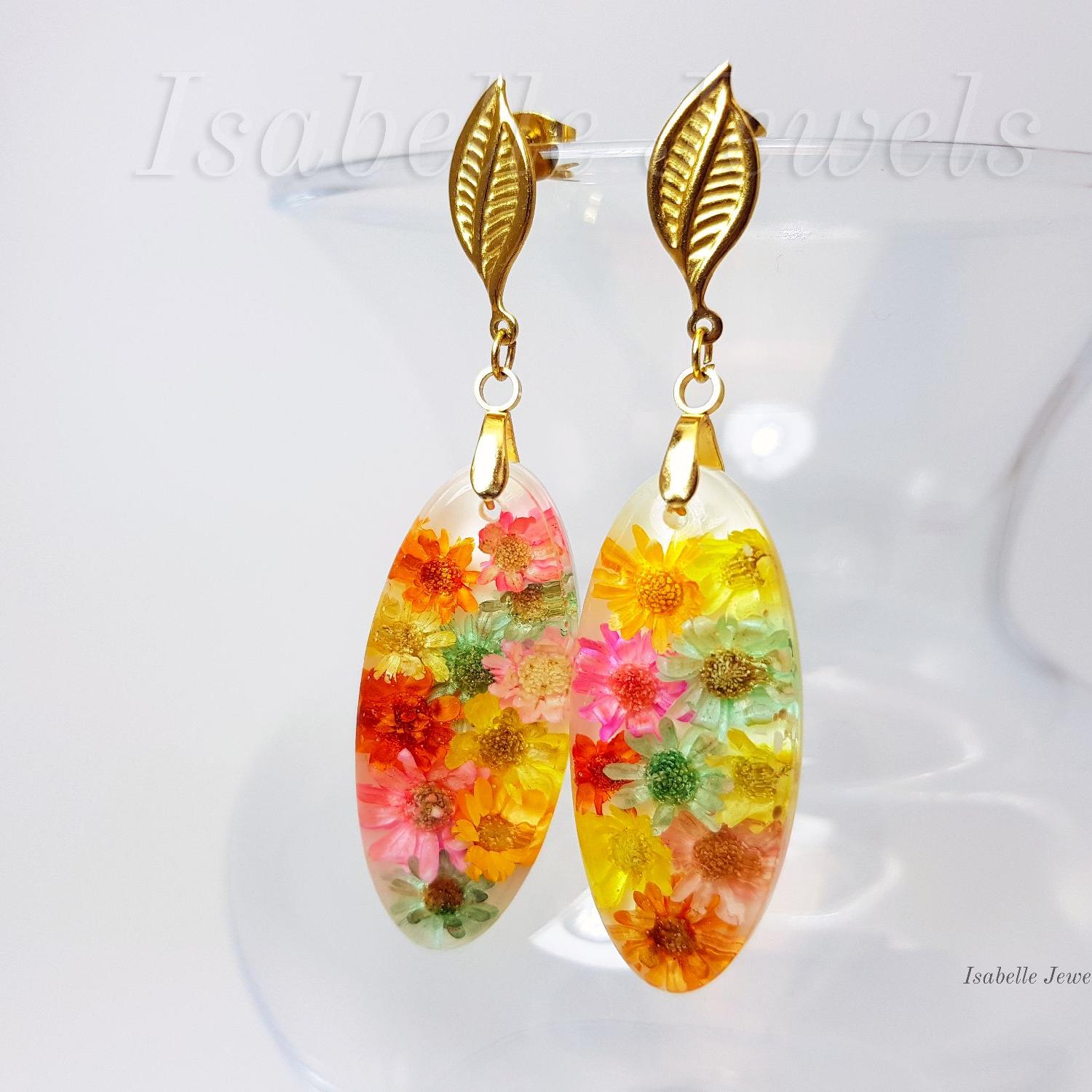 Particolari orecchini pendenti realizzati con fiori veri cristallizzati nella resina. La natura nei gioielli